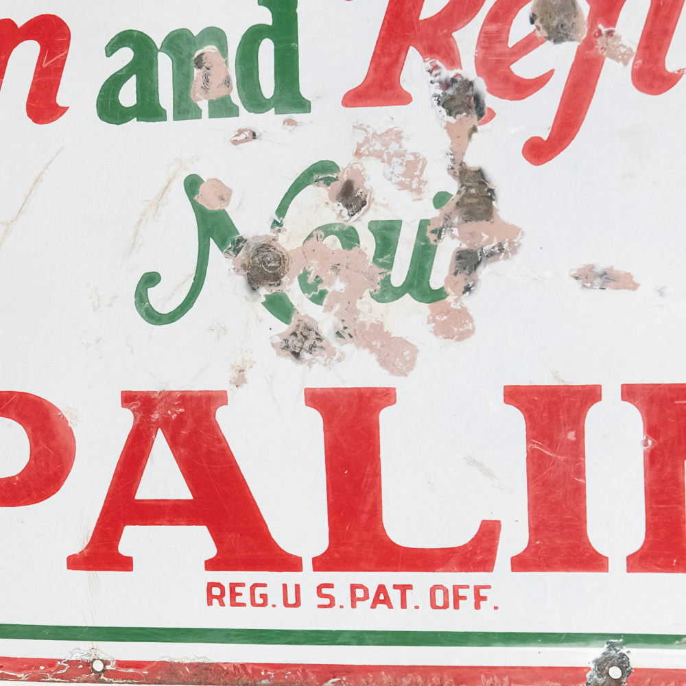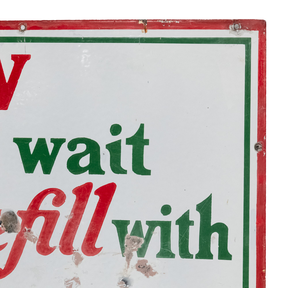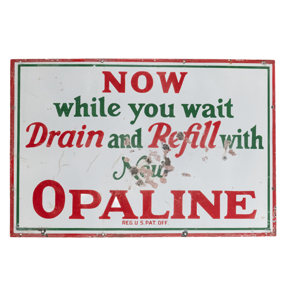 “Now while you wait Drain & Refill with Opaline” Sinclair Gas Station single sided porcelain advertising sign. Good overall condition with discoloration, stray marks and some chipped porcelain. Approximately 24″t x 36″l. Please use photos to judge condition and bid accordingly.