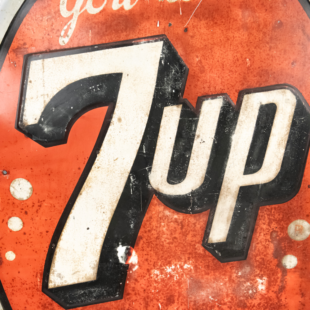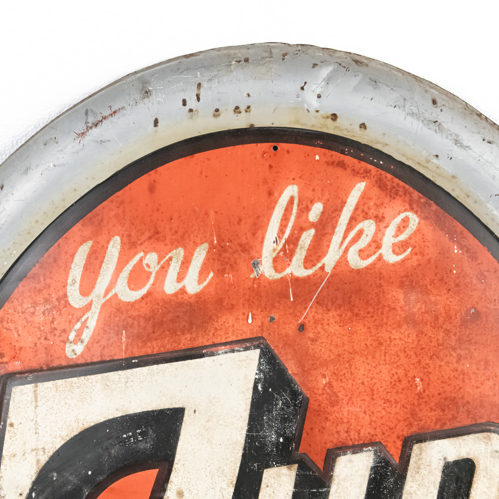 Vintage “You Like 7-Up, It Likes You” oval embossed tin single sided metal advertising sign. “Stout Sign Co. St. Louis Mo, 30” stamped near bottom edge. Good overall condition with moderate discoloration, staining, extra holes, stray marks and oxidation. Approximately 40″t x 30″w. Please use photos to judge condition and bid accordingly.