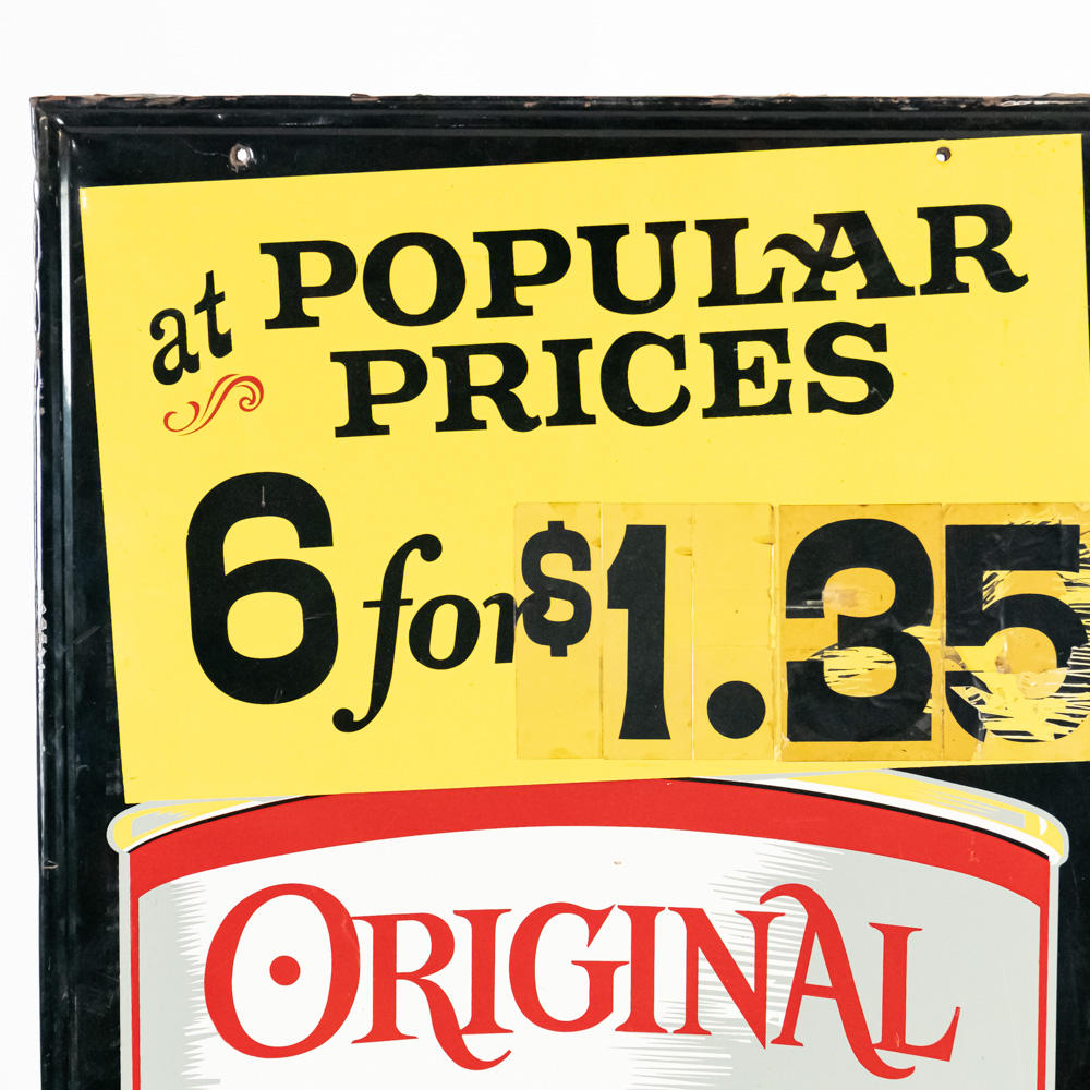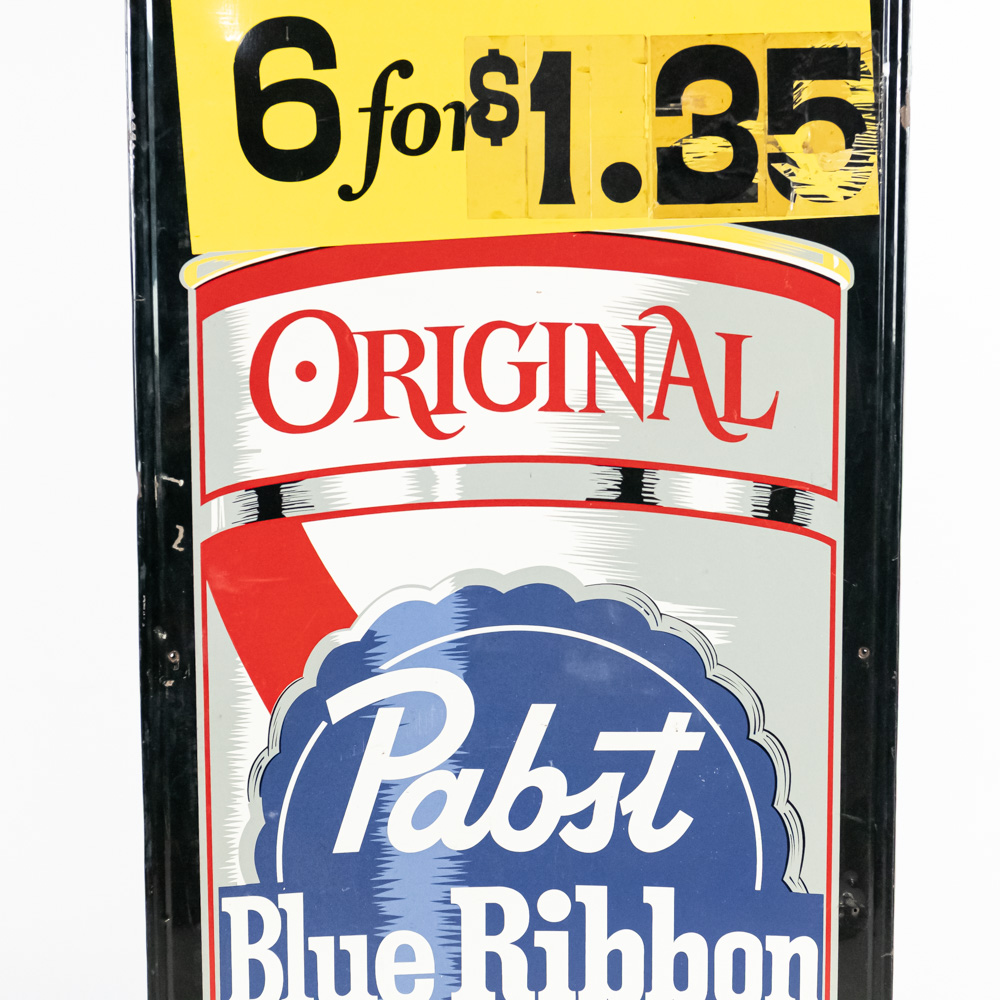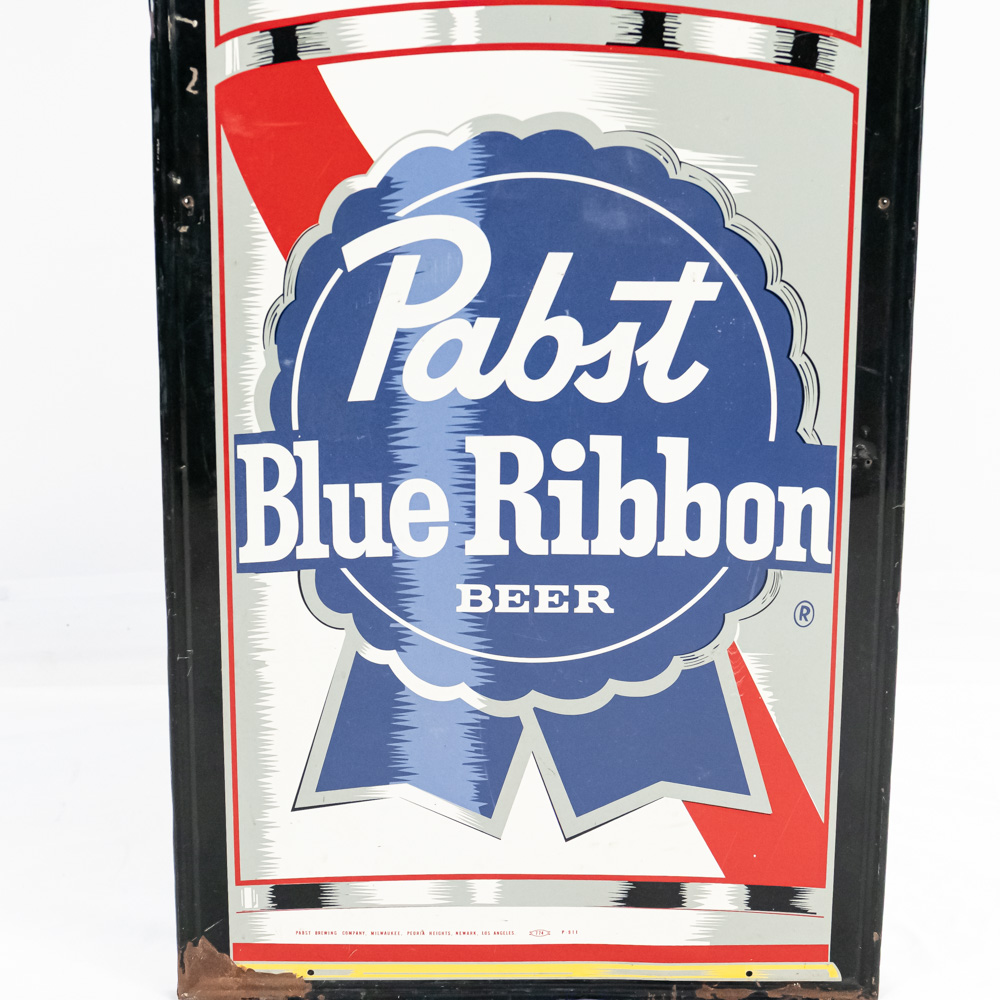 1950s 1960s “Pabst Blue Ribbon” popular prices 6 for $1.35 (the Good Ol Days) single sided elongated painted metal self framed (with wood backing) advertising sign. “Pabst Brewing Company Milwaukee Peoria Heights Newark Los Angeles 774 P-911” near bottom edge. Good overall condition with light discoloration, stray marks / chips / scratches and oxidation. Approximately 60″t x 26″l. Please use photos to judge condition and bid accordingly.