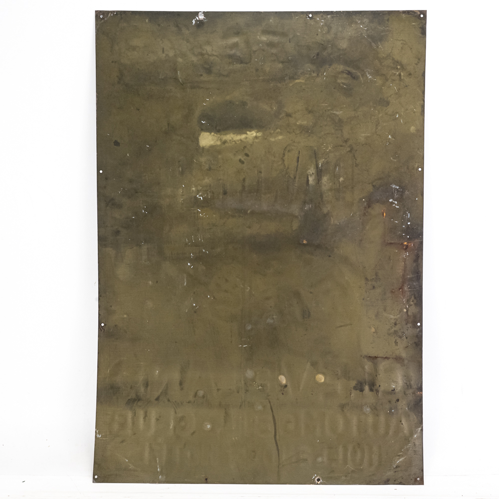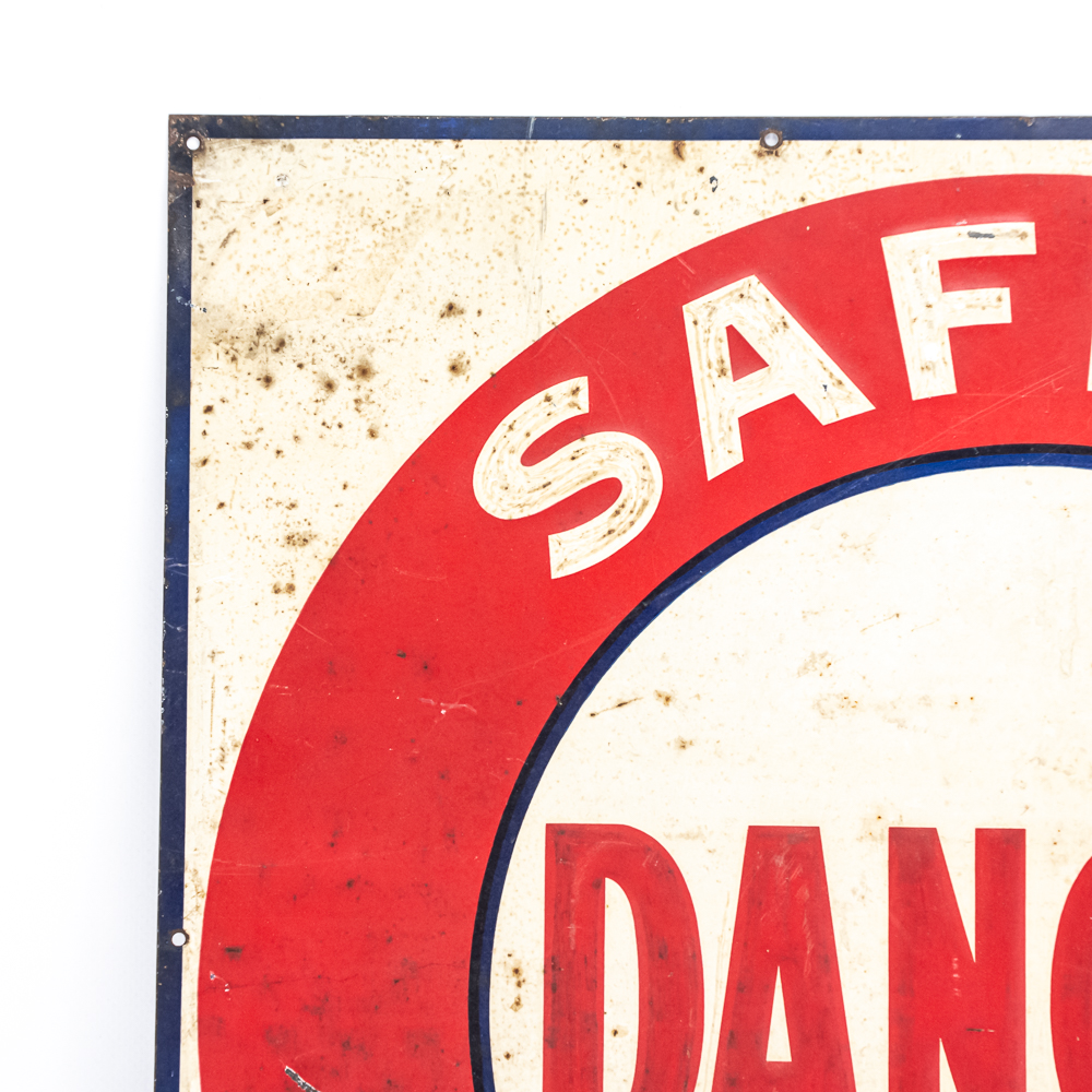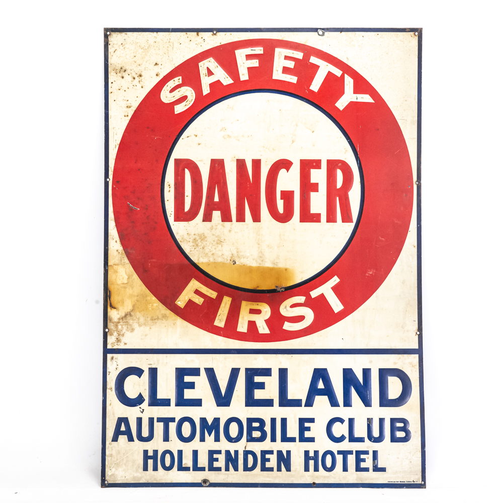 Vintage Cleveland Automobile Club “Danger Safety First” single sided embossed metal advertising sign from the Hollenden Hotel. “American Art Works Coshocton O” near bottom edge. Good overall condition with some discoloration, stray marks and oxidation. Approximately 27.5″t x 19.5″l. Please use photos to judge condition and bid accordingly.