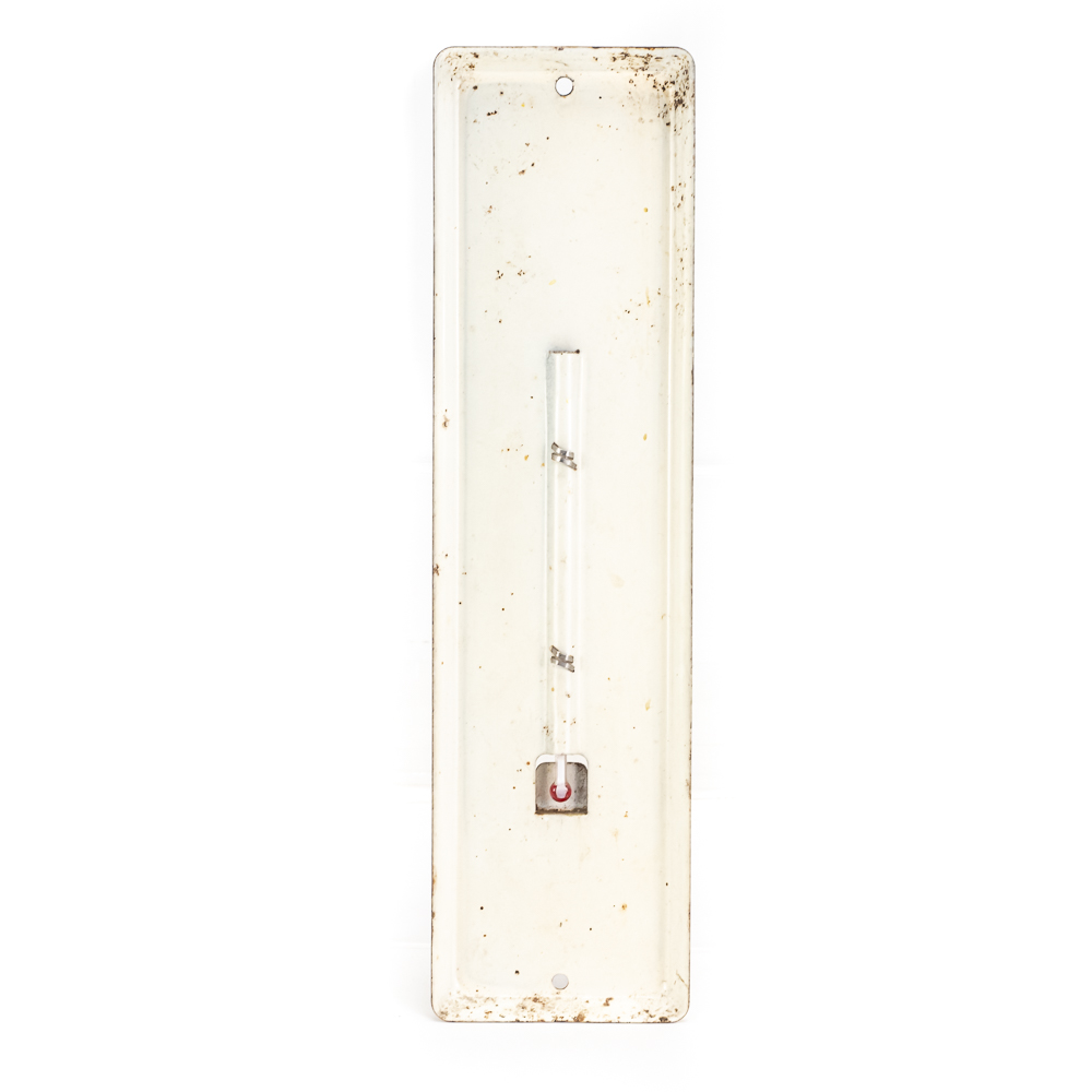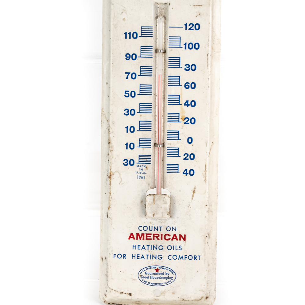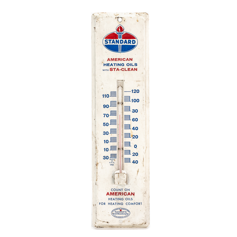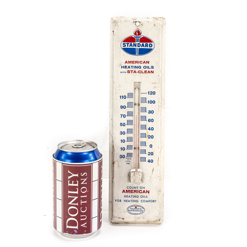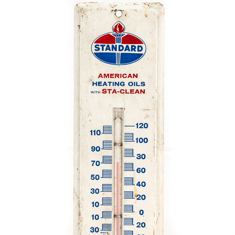 Working, Standard American Heating Oils w Sta Clean single sided metal advertising thermometer. Very good overall condition with some discoloration, stray marks and oxidation. Approximately 11.5″t x 3″l. Please use photos to judge condition and bid accordingly.