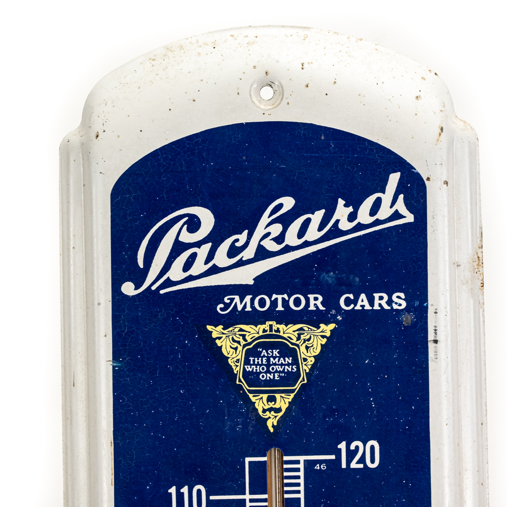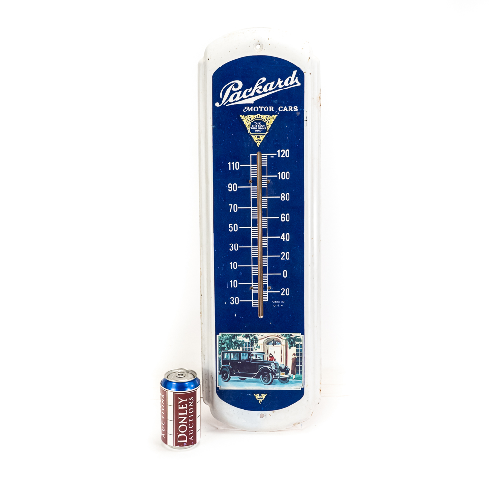 Working Packard Motor Cars single sided metal advertising thermometer. Very good overall condition with some discoloration, stray marks and oxidation. Approximately 27″t x 8.5″l. Please use photos to judge condition and bid accordingly.