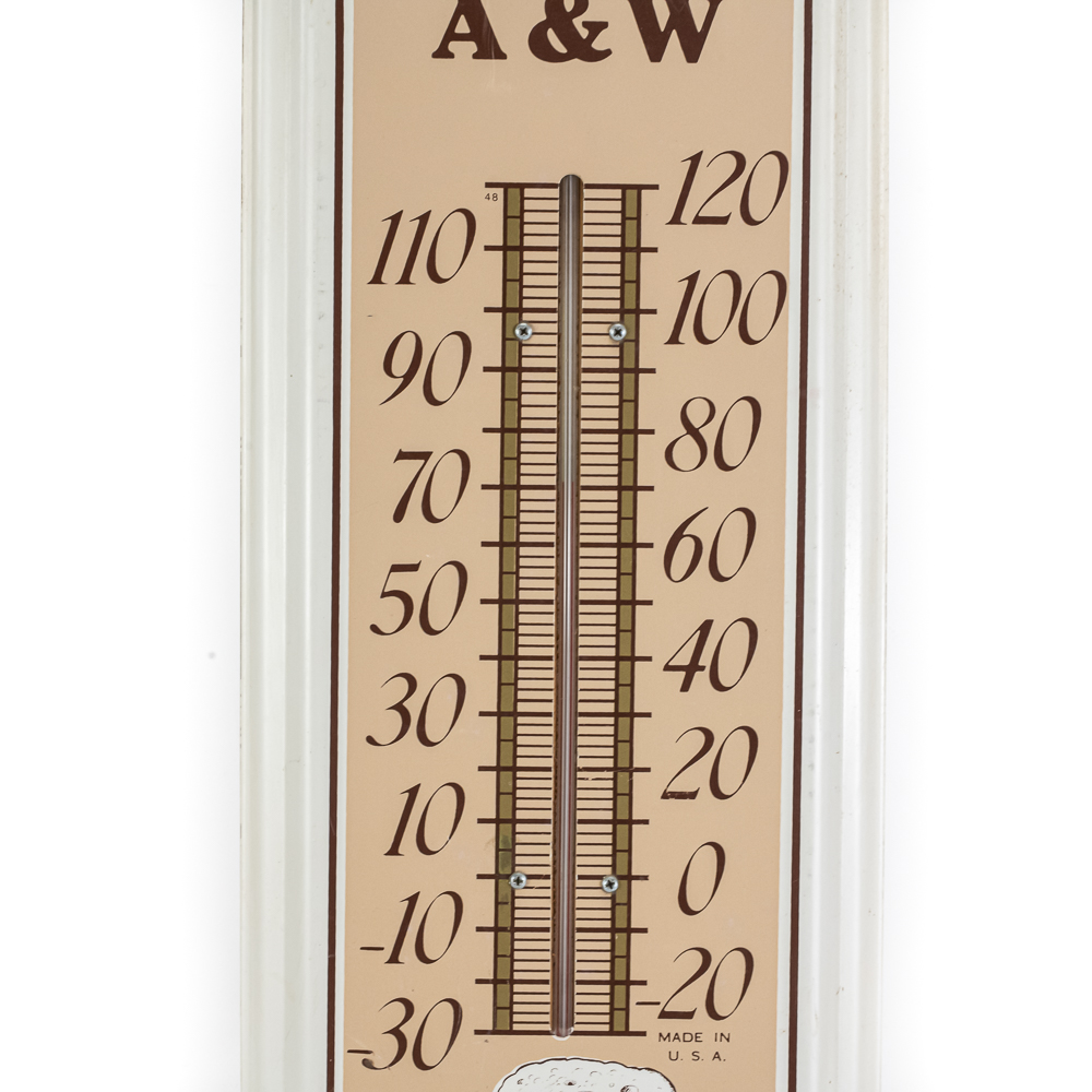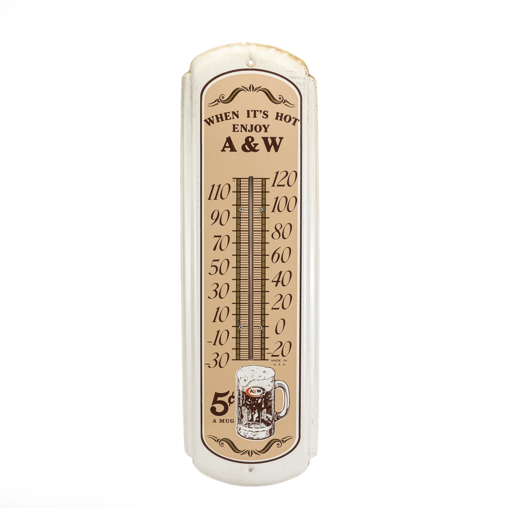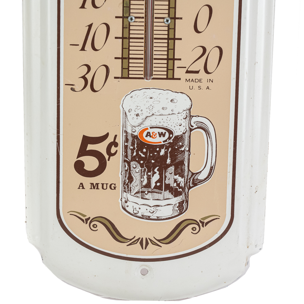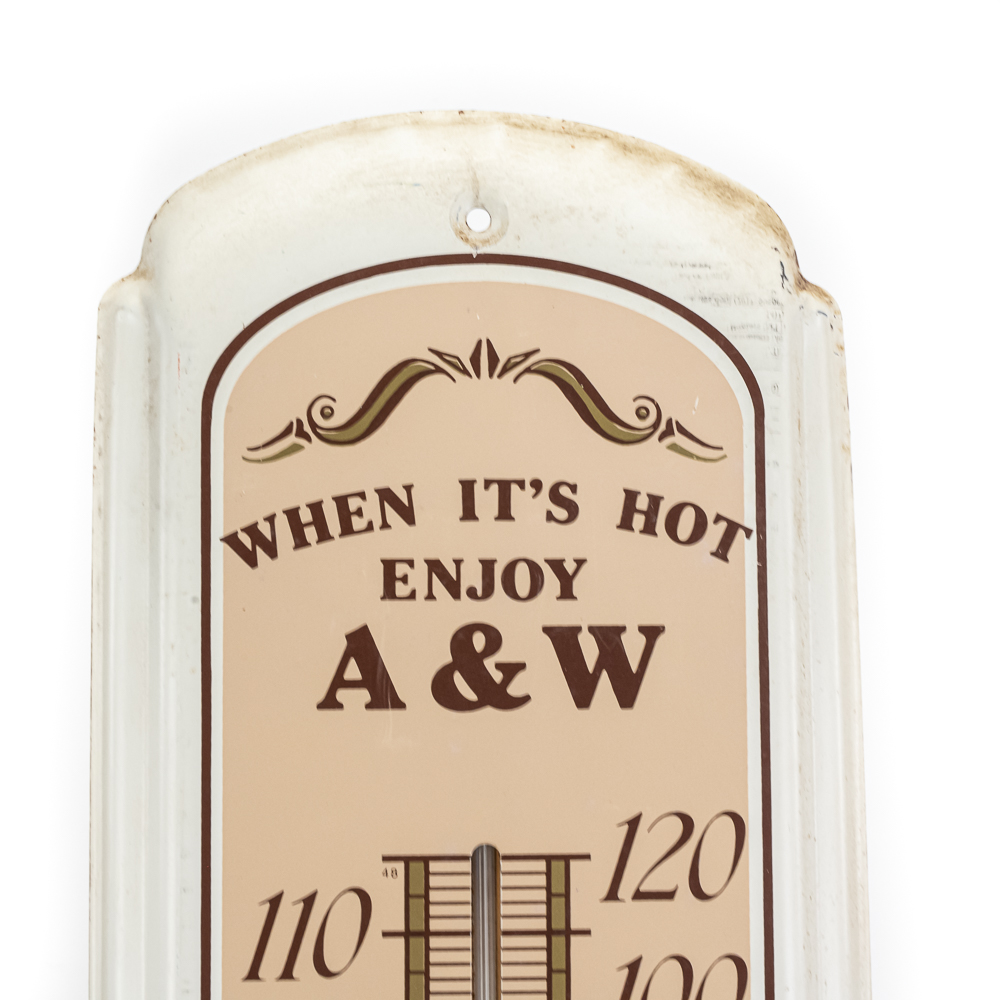 Working, A&W “When It’s Hot Enjoy A&W” 5c single sided metal advertising thermometer. Very good overall condition with some discoloration, stray marks and oxidation. Approximately 27″t x 8.5″l. Please use photos to judge condition and bid accordingly.