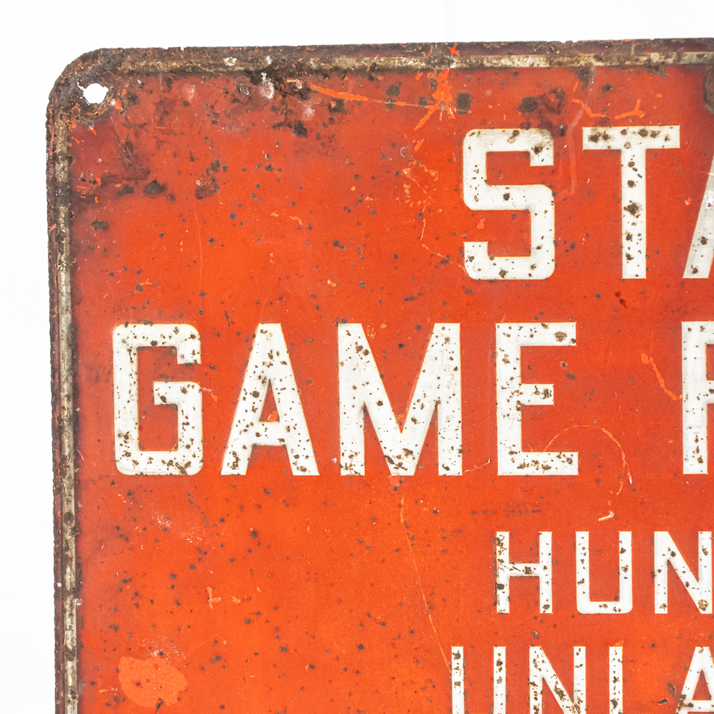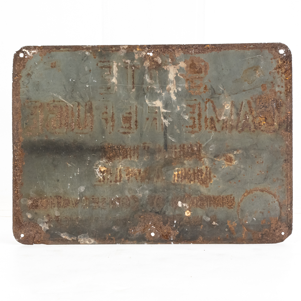 Vintage Ohio State Game Refuge single sided embossed metal “Warning” sign. Good overall condition with some discoloration, chips and oxidation. Approximately 10″t x 13.5″l. Please use photos to judge condition and bid accordingly.