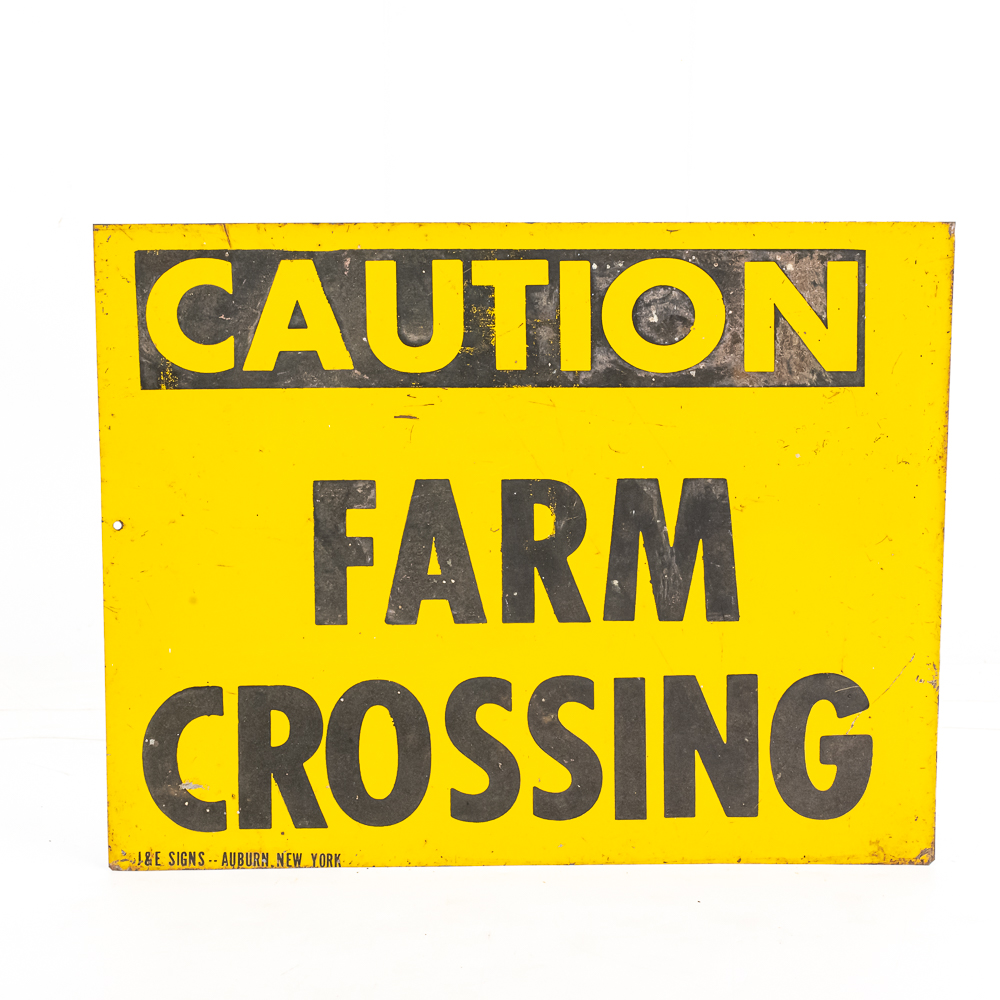 Vintage Caution Farm Crossing single sided metal advertising sign. J&E Signs Auburn New York, very good to good overall condition with some discoloration, stray marks and oxidation. Approximately 11″t x 14″l. Please use photos to judge condition and bid accordingly.