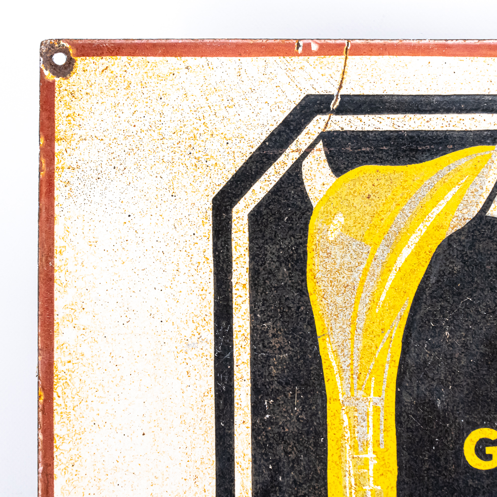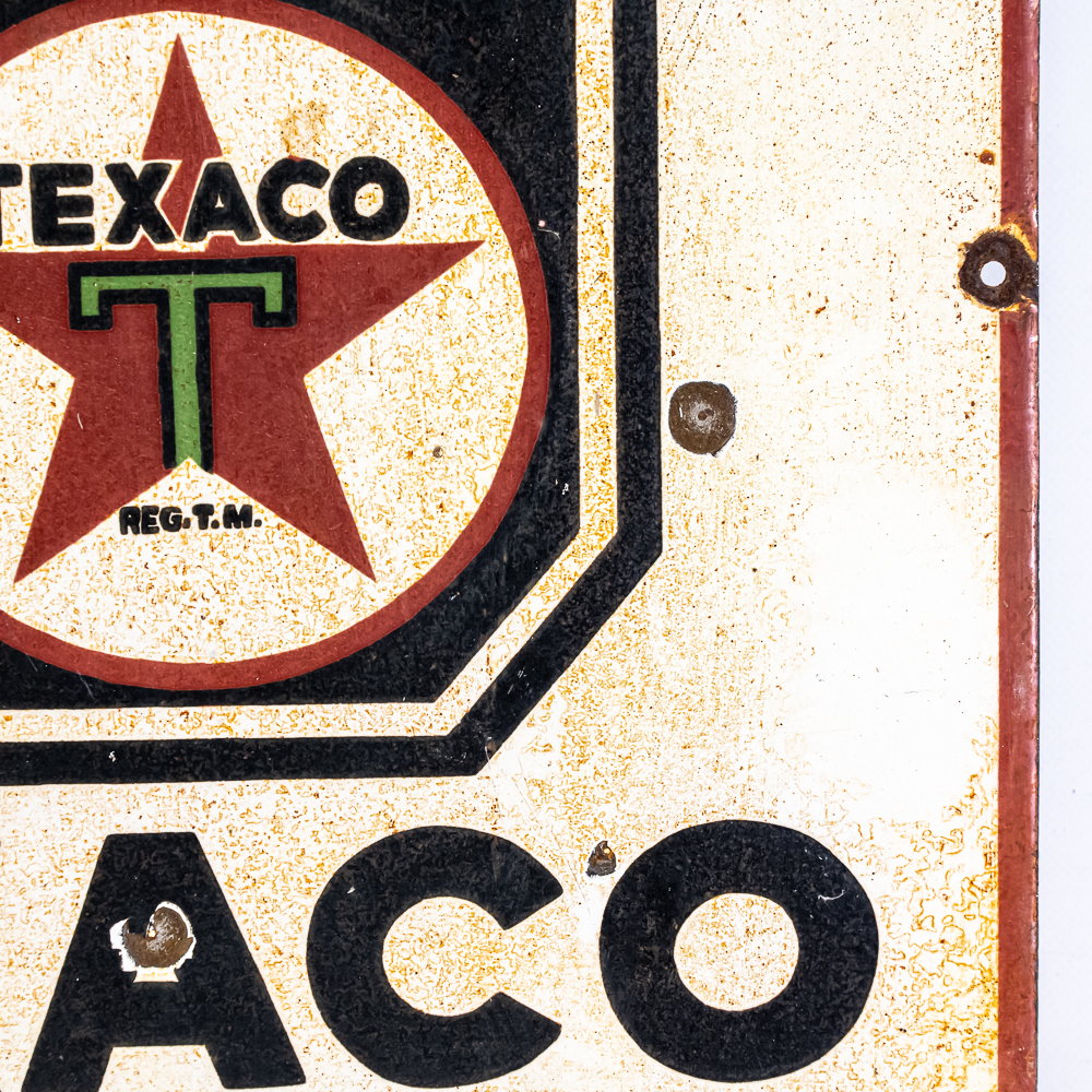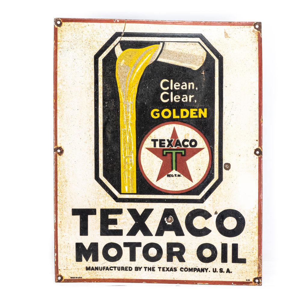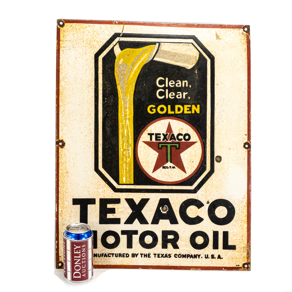 TAXACO Motor Oil single sided porcelain (flange edge missing) advertising sign. “Made in the USA & 2-30” stamped near bottom edge. Good overall condition with age and wear related cosmetic imperfections including some scratches, chipped porcelain spots & oxidation. Perfect addition to your collection; 23″t x 18″l. Please use photos to judge condition and bid accordingly.