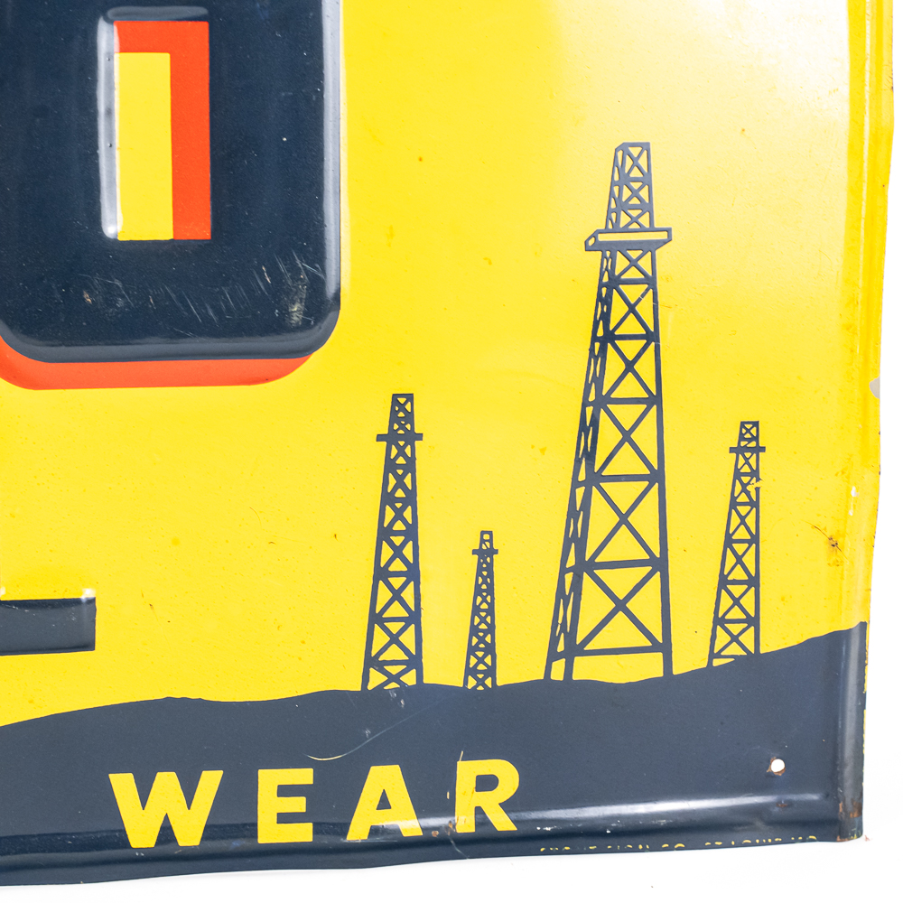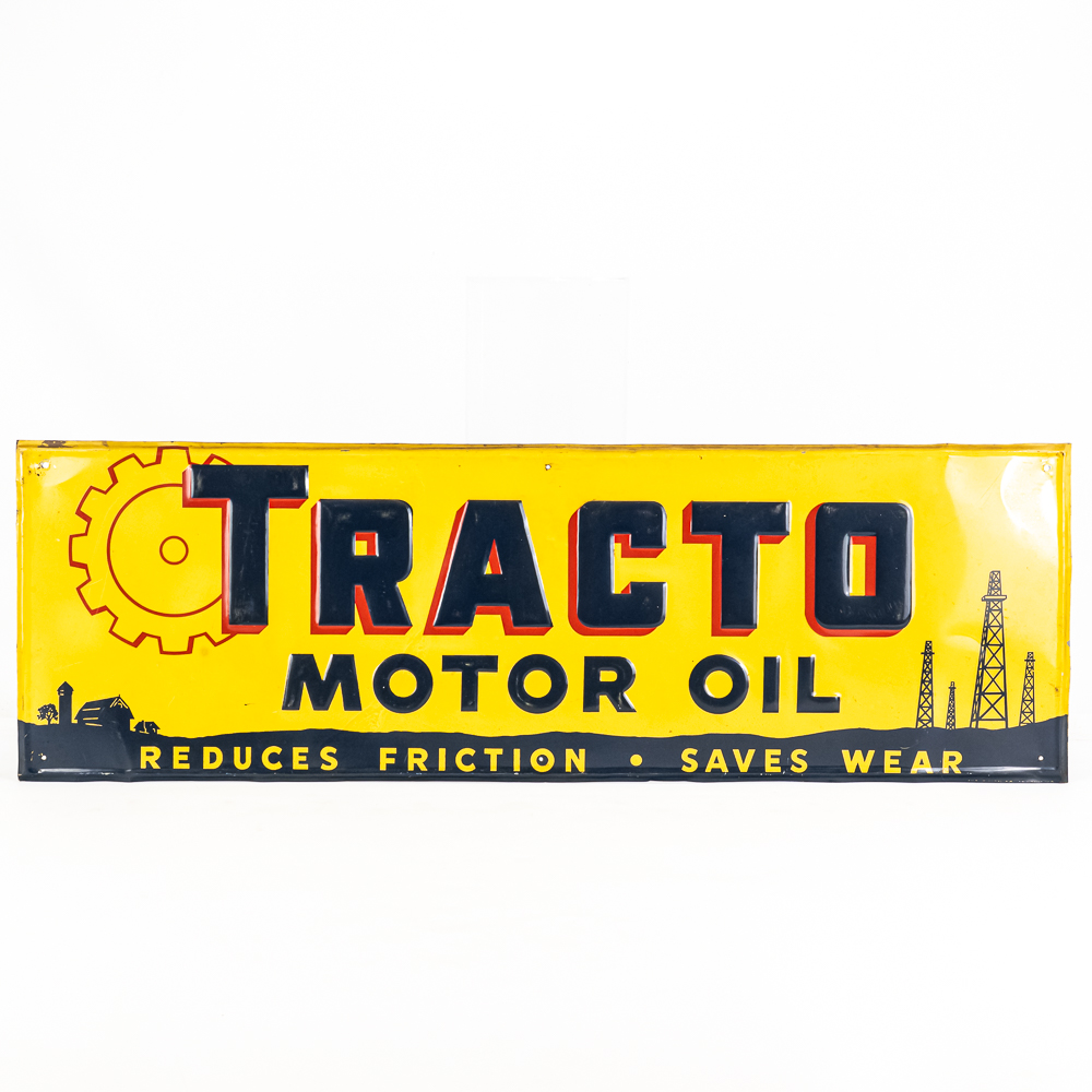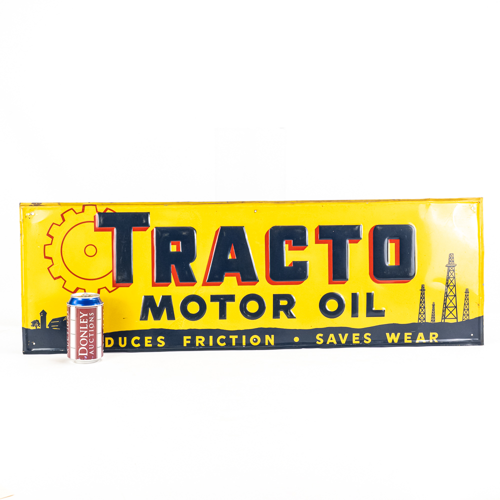 “Tracto Motor Oil” single sided embossed tin advertising sign. Good overall condition with some age and wear related cosmetic imperfections including some discoloration, dings, scratches, bubbles & oxidation. Perfect addition to your collection; 11.5″t x 35.5″l. Please use photos to judge condition and bid accordingly.