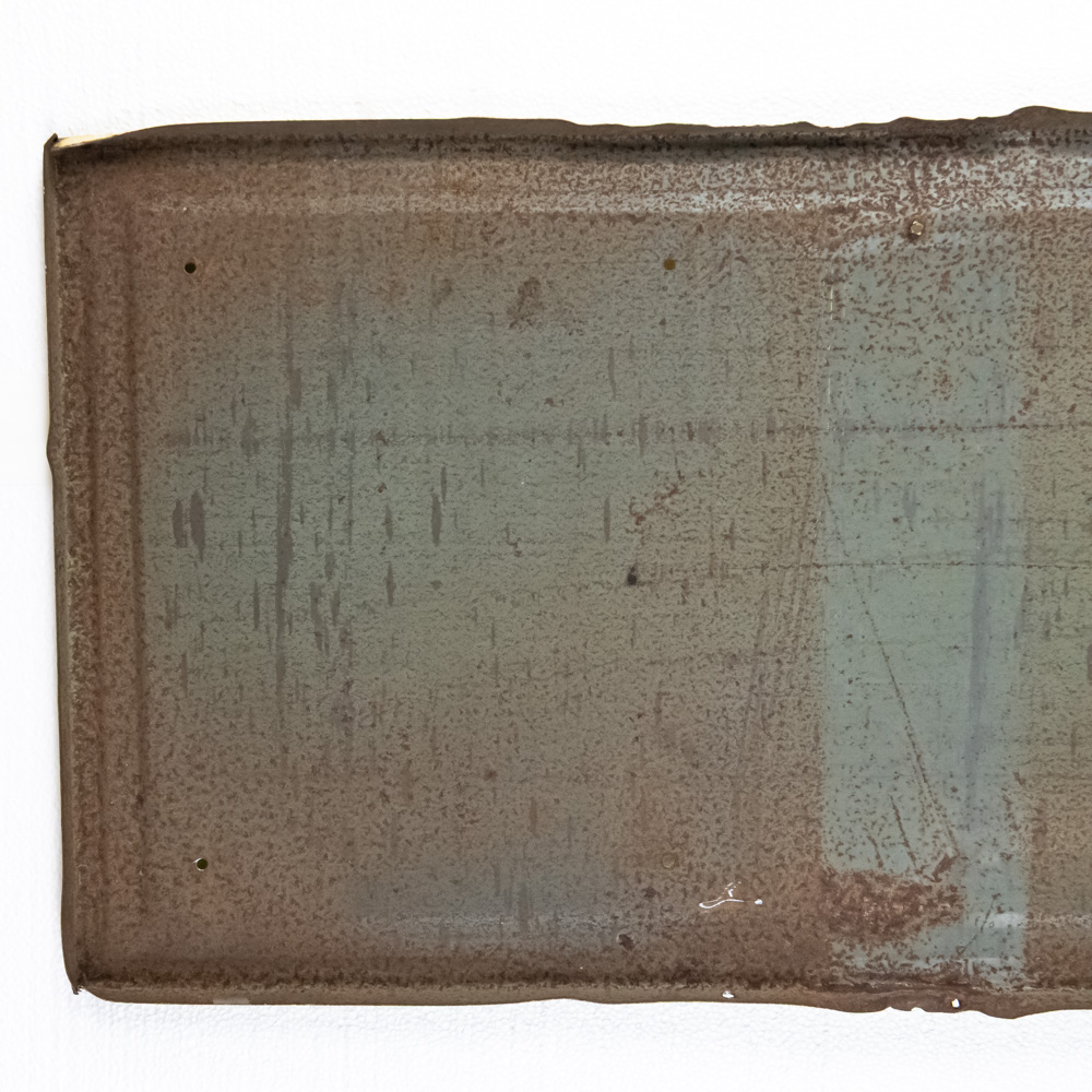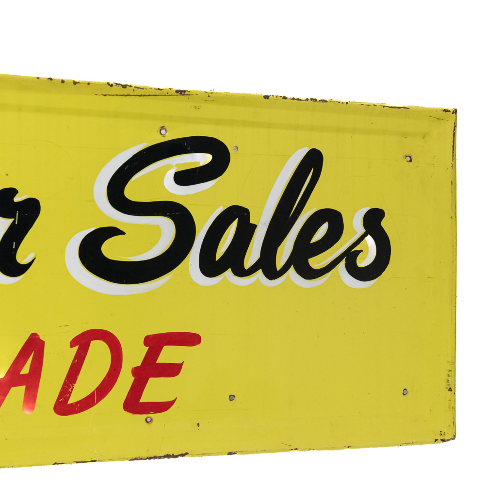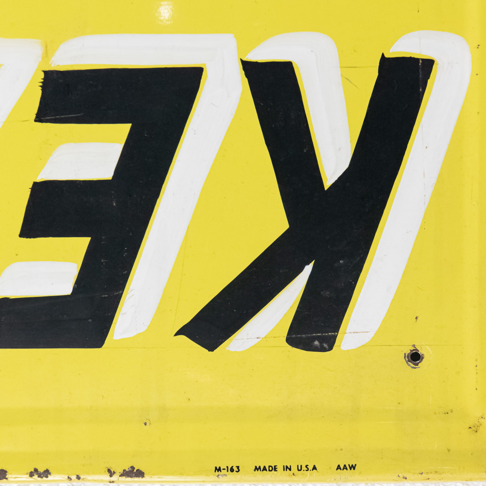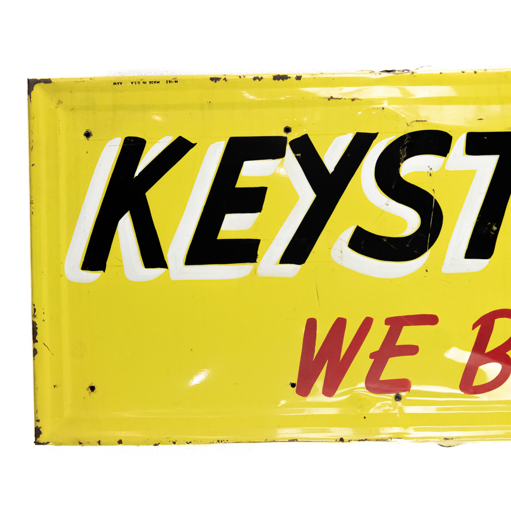 Vintage “KEYSTONE MOTOR SALES” single sided tin advertising sign. Presents well and in good overall condition with some discoloration, extra holes, stray marks and oxidation. Self frame with rolled edges. Some unevenness, approximately 15″t x 68″l. Please use photos to judge condition and bid accordingly.