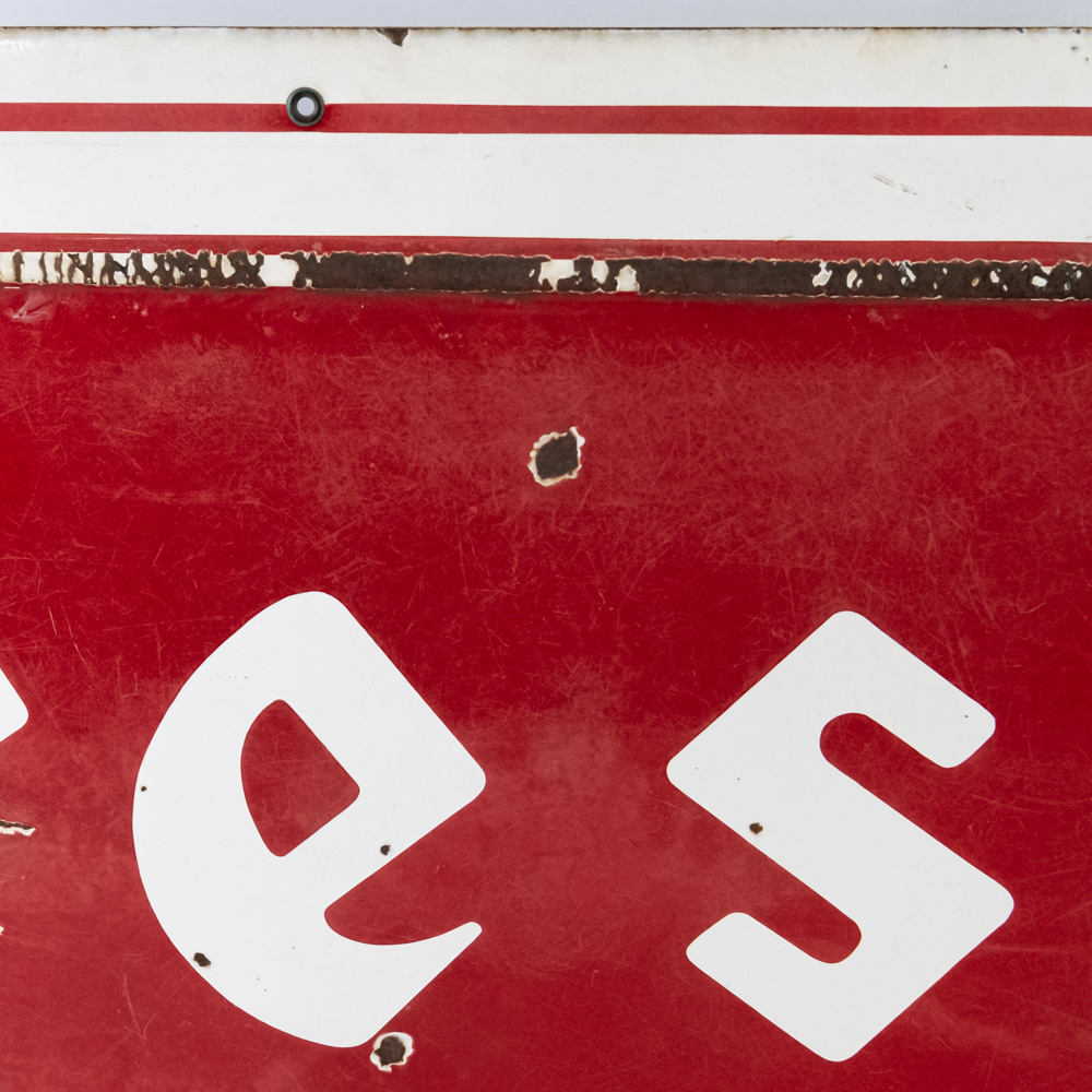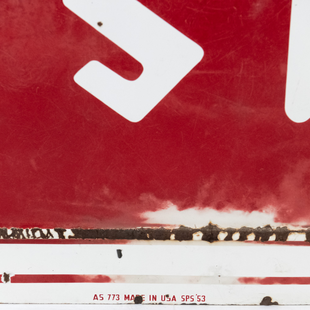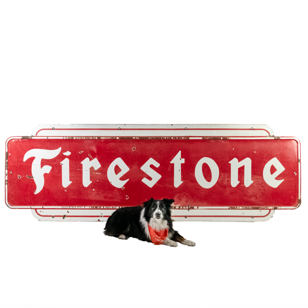 Large and in charge 1953 “Firestone” single sided porcelain advertising sign. Presents extremely well with bold eye catching color and large size. “AS 773 Made in USA SPS ’53” stamped near bottom edge. Good overall condition with some discoloration, chipped porcelain and oxidation. Approximately 35.5″t x 108″l. Please use photos to judge condition and bid accordingly.
