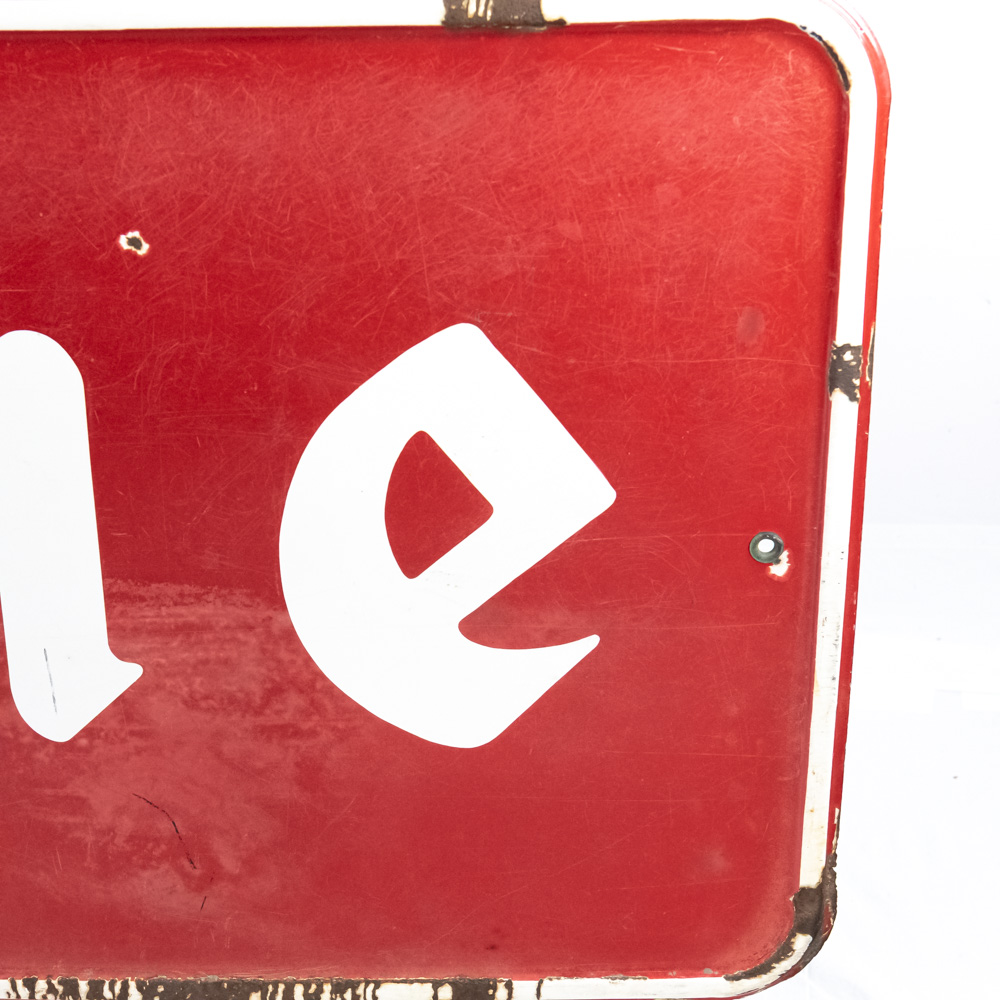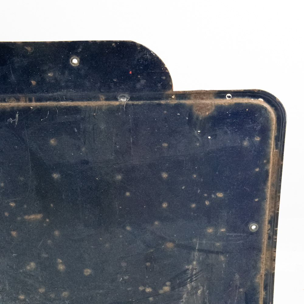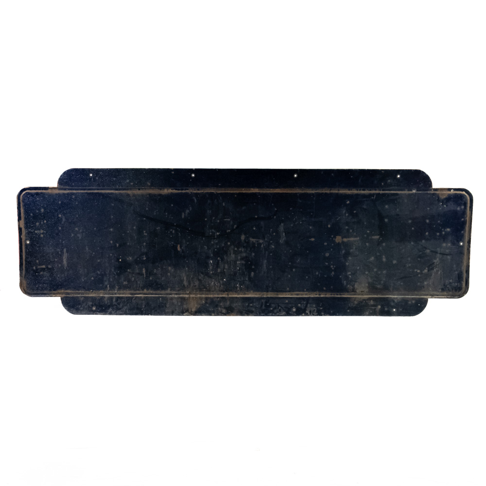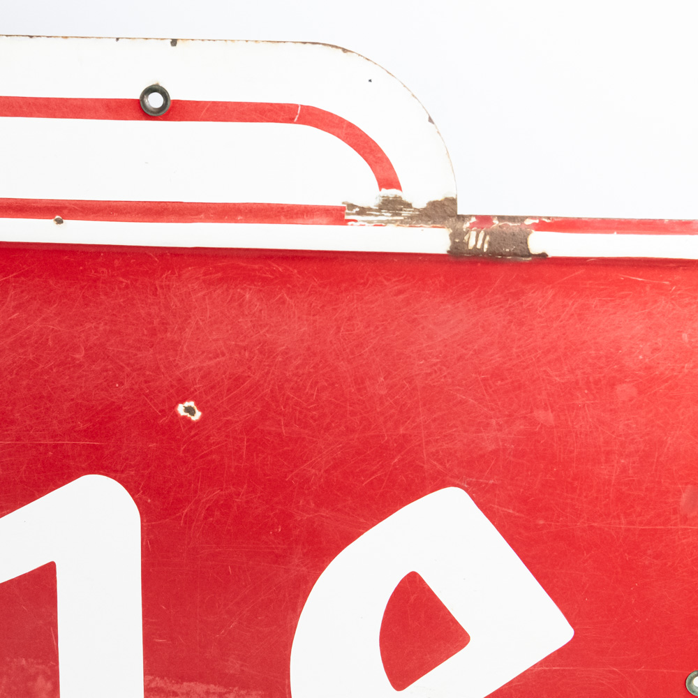Large and in charge 1953 “Firestone” single sided porcelain advertising sign. Presents extremely well with bold eye catching color and large size. “AS 773 Made in USA SPS ’53” stamped near bottom edge. Good overall condition with some discoloration, chipped porcelain and oxidation. Approximately 35.5″t x 108″l. Please use photos to judge condition and bid accordingly.
