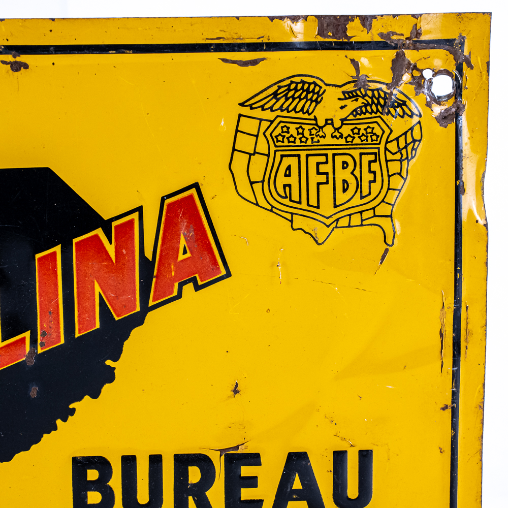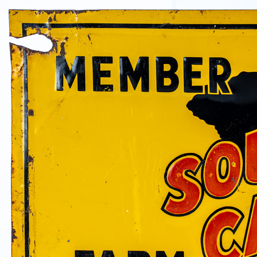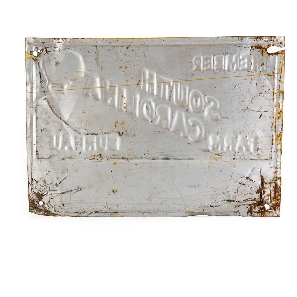 Vintage “South Carolina Farm Bureau Member” embossed single sided tin advertising sign. In good overall condition with some discoloration, stray marks, unevenness and oxidation. (2) left holes show imperfections; approximately 10″t x 14″w. Please use photos to judge condition and bid accordingly.