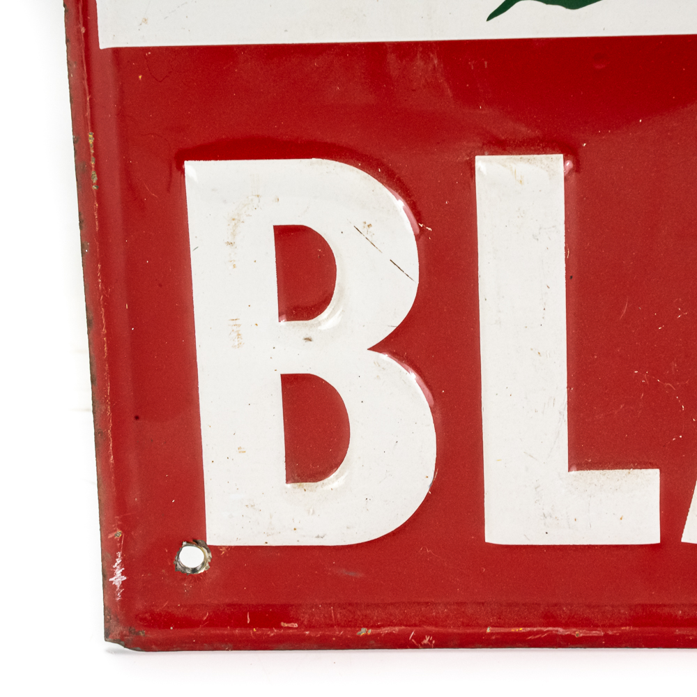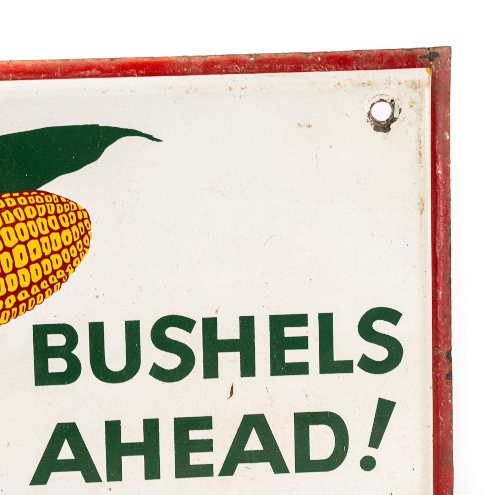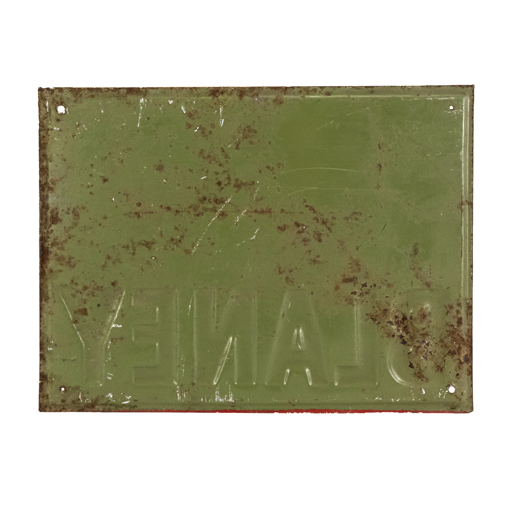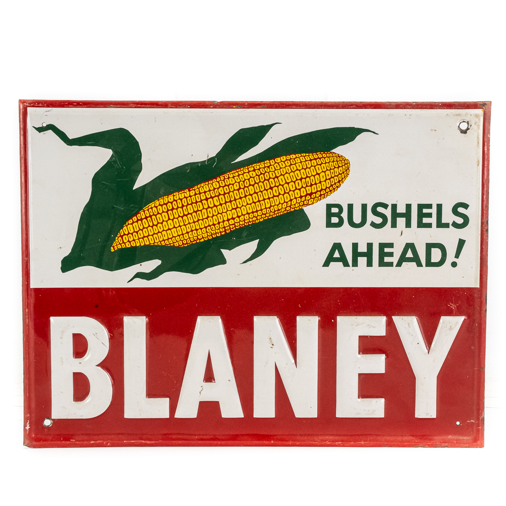 Vintage “BLANEY Bushels Ahead” embossed single sided metal advertising sign. Presents well and in good overall condition with some discoloration, stray marks and oxidation. Approximately 12″t x 16″w. Please use photos to judge condition and bid accordingly.