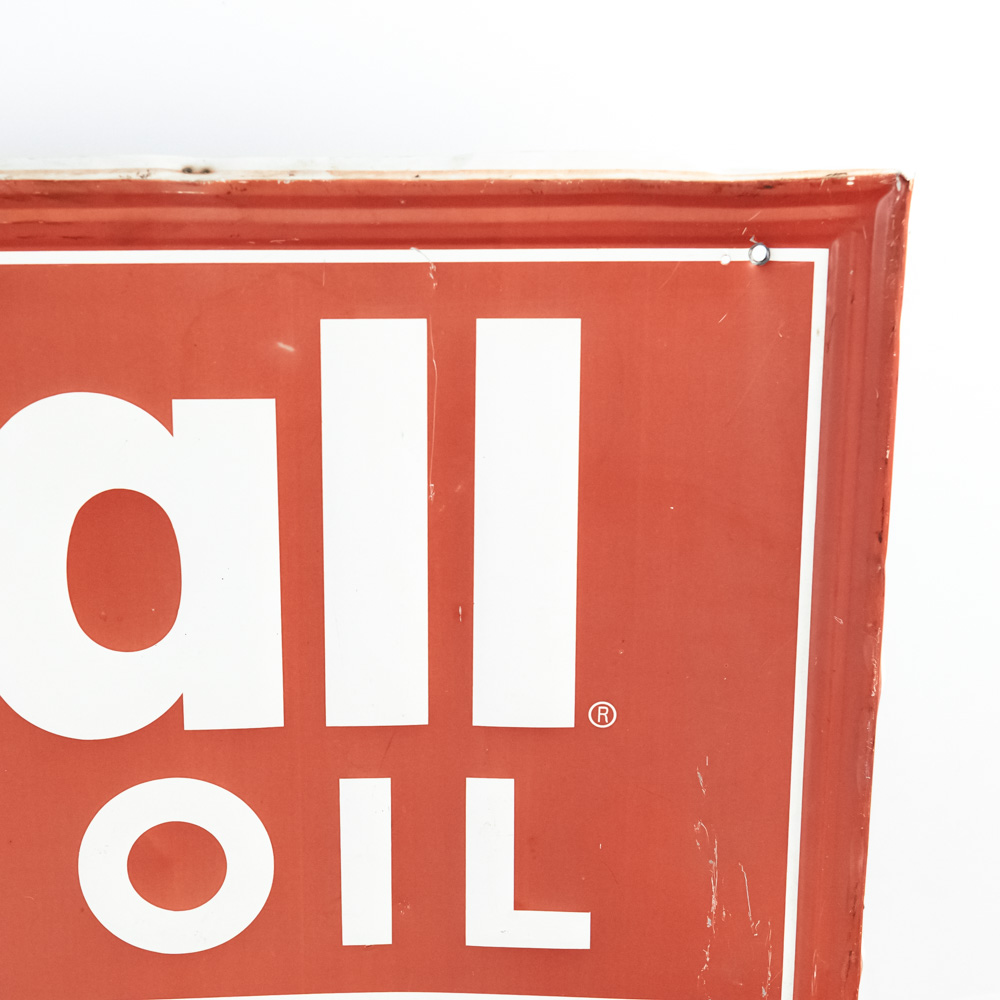 Kendall Motor Oil “Bauers Auto Service 24 Hour Towing” single sided embossed tin advertising sign. “By Grace Comm. INC. St Louis Mo 2-8” stamped near bottom edge. Self framed with rolled edges. Good overall condition with some discoloration, non original holes, dings scratches & stray marks. Approximately 35″t x 70.5″l. Please use photos to judge condition and bid accordingly.