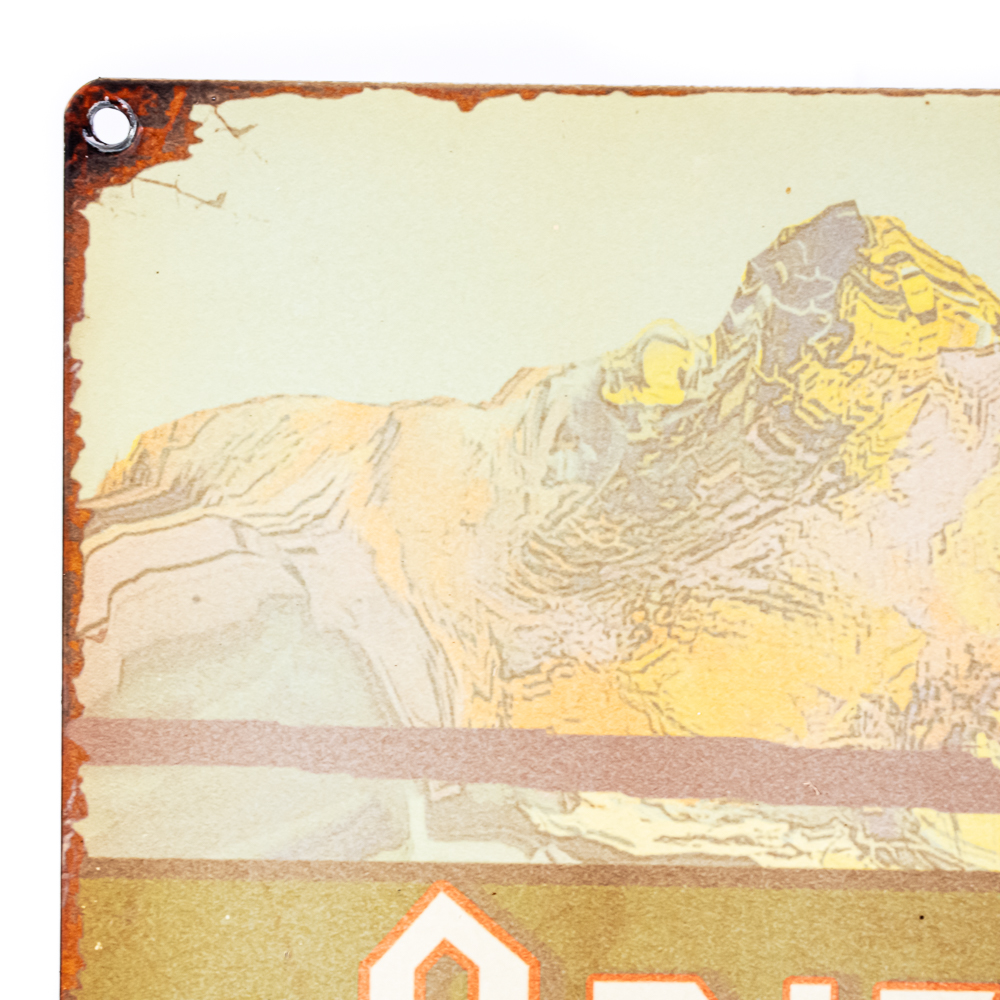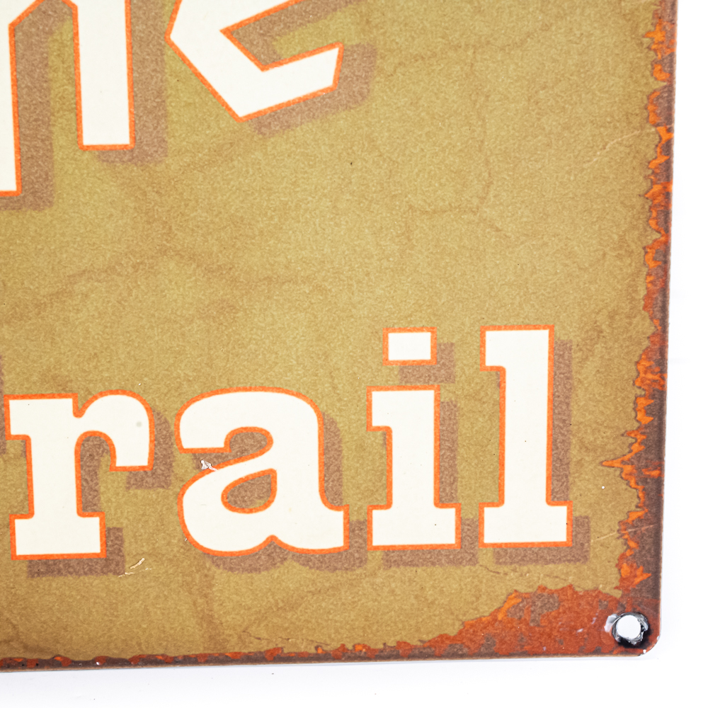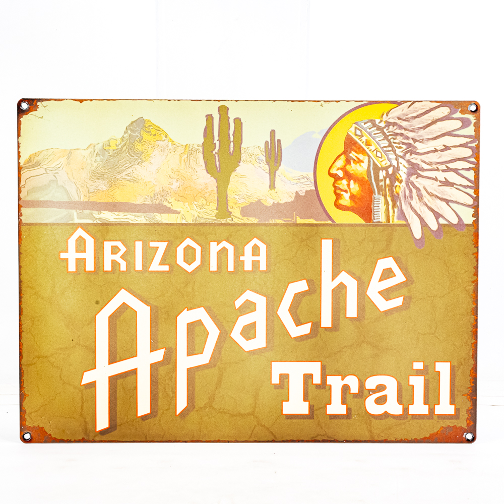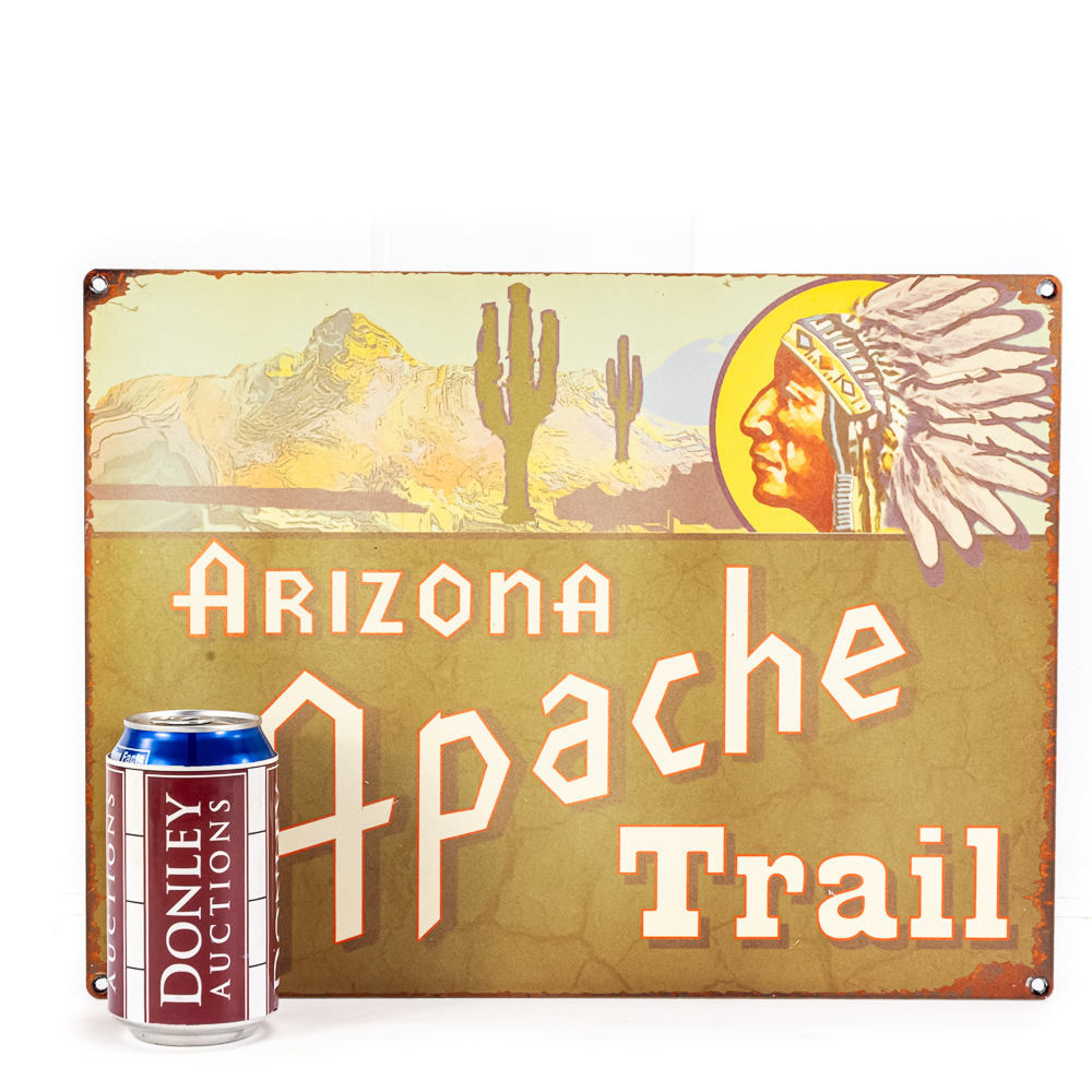 “Arizona Apache Trail” single sided metal advertising sign. Presents well and in good overall condition with minor discoloration & stray marks. Approximately 12″t x 15.5″w. Please use photos to judge condition and bid accordingly.