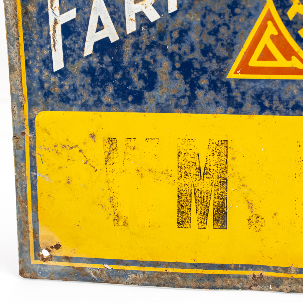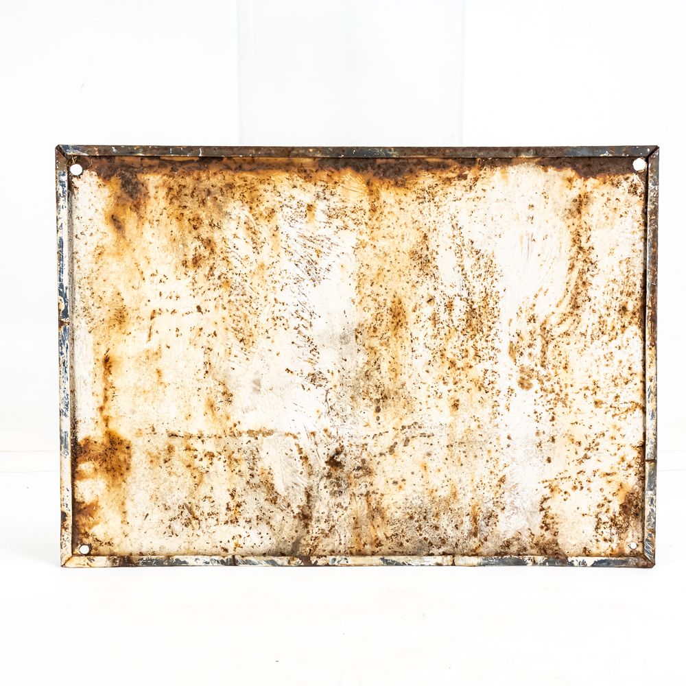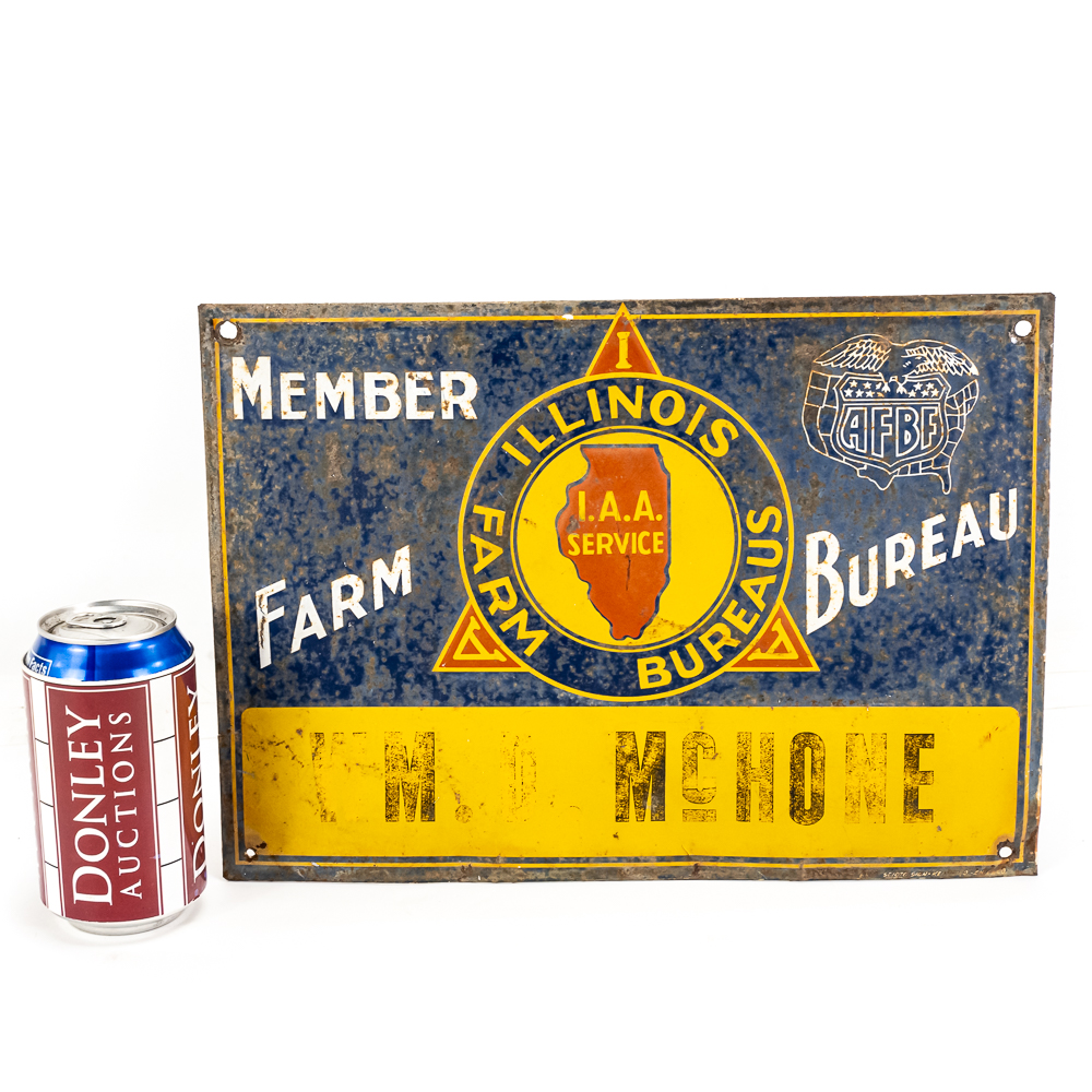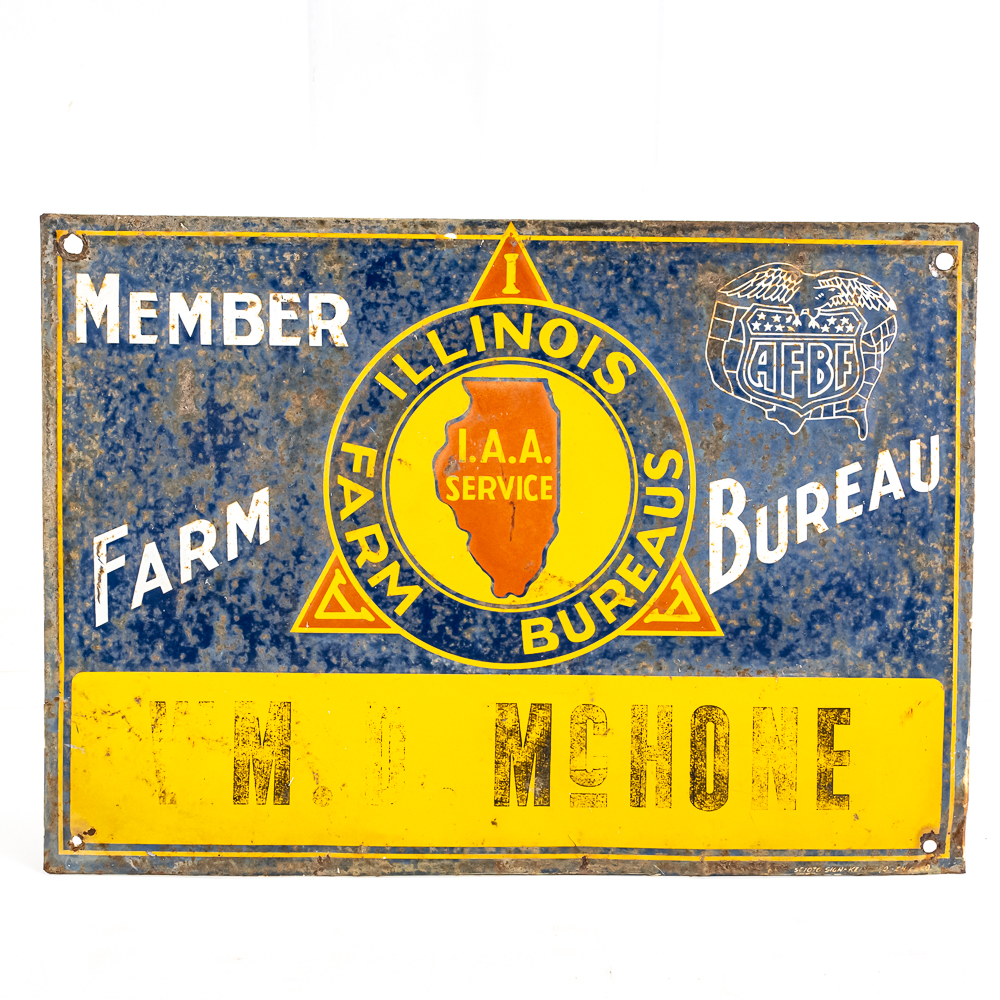 Vintage “Illinois Farm Bureau Member W.M. Mc Hone” embossed single sided metal advertising sign. In good overall condition with moderate discoloration, stray marks and oxidation rust. Approximately 9.5″t x 13.5″w. Please use photos to judge condition and bid accordingly.