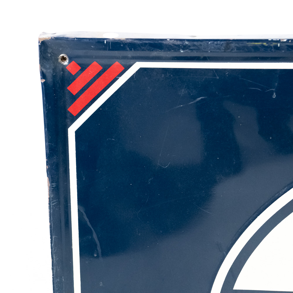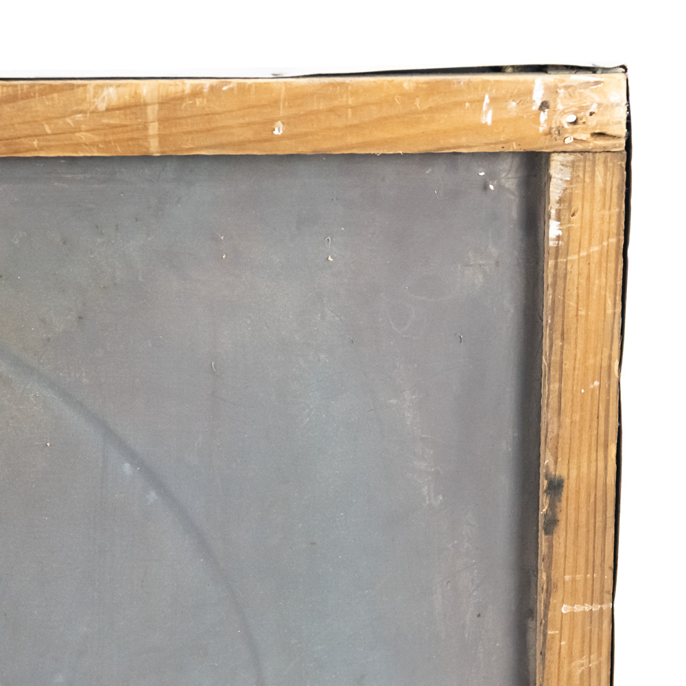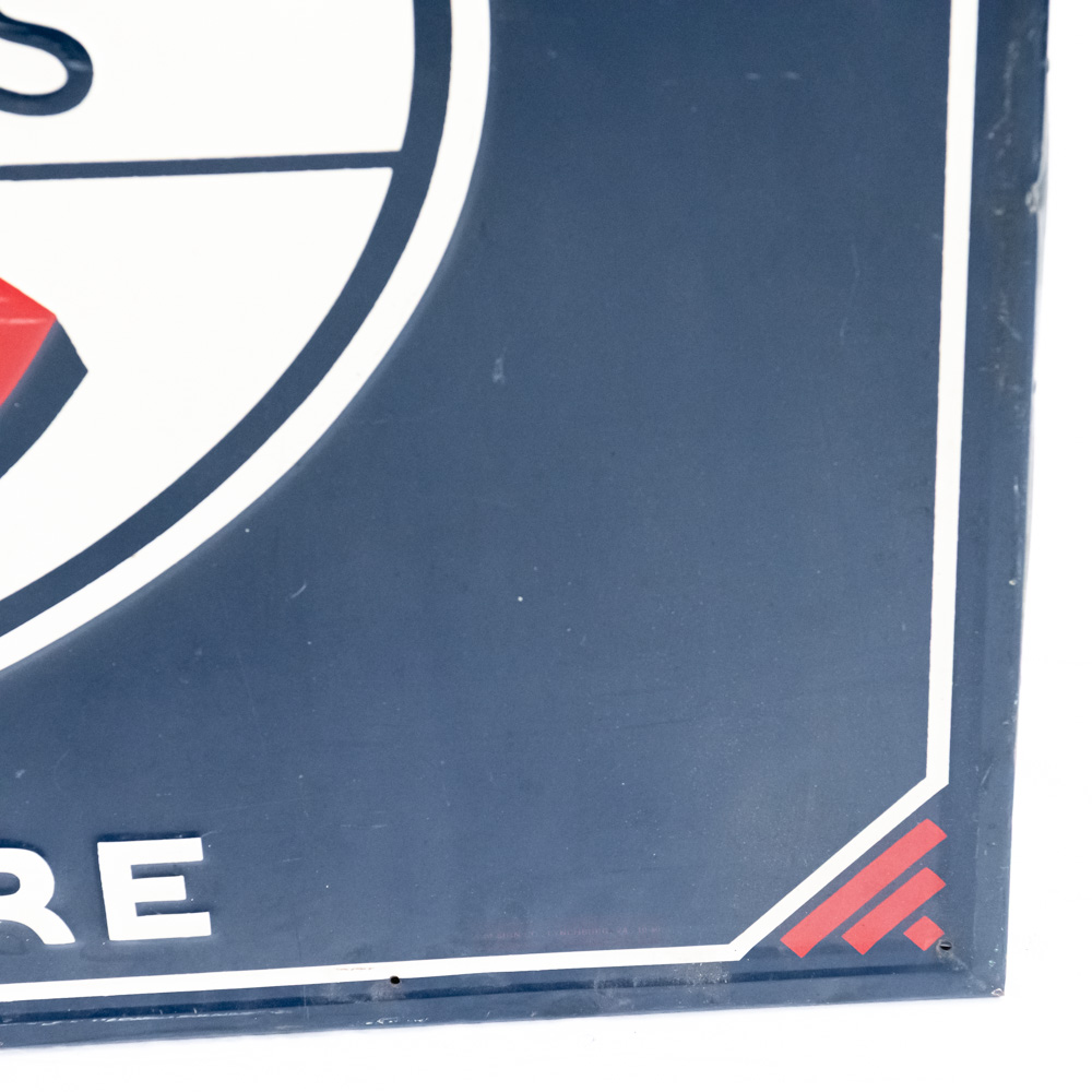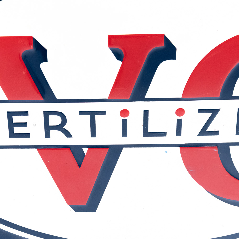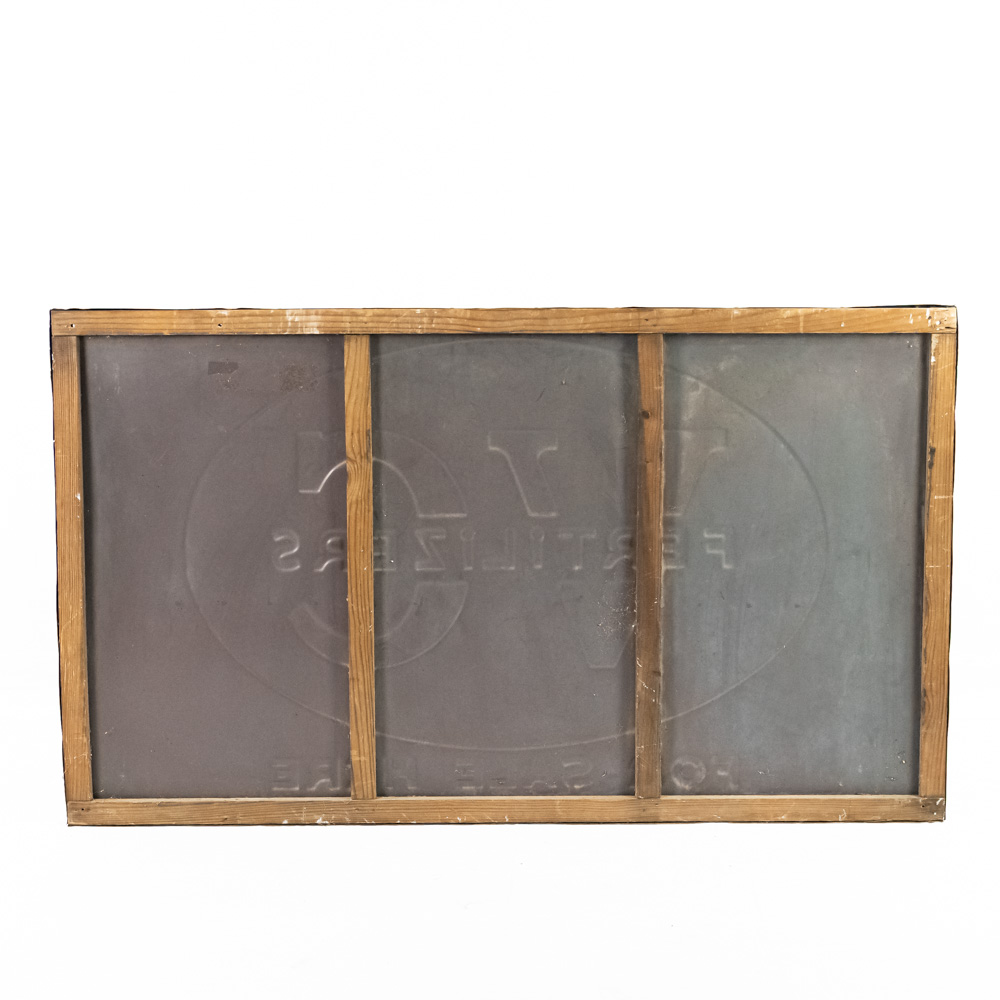 Large “VC Fertilizer For Sale Here” embossed single sided tin advertising sign. Presents extremely well and in good overall condition with minor discoloration, dings, stray marks and oxidation. Self framed with wood framing and rolled edges with some over paint; approximately 34.5″t x 58.5″w. Please use photos to judge condition and bid accordingly.