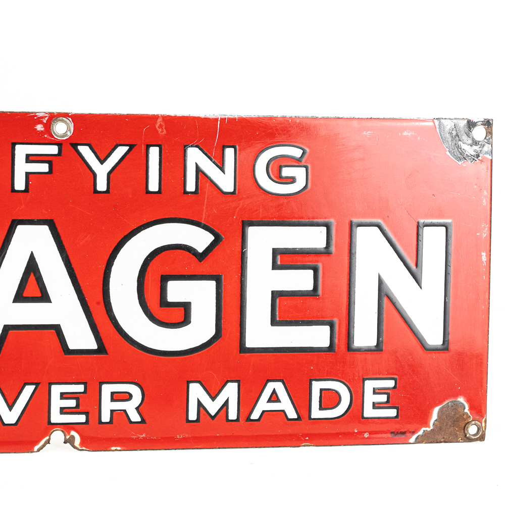 Vintage “COPENHAGEN CHEW” single sided porcelain advertising sign. Presents well with strong color; in good overall condition with some discoloration, stray marks, chipped porcelain and oxidation. Stampings near bottom corner are hard to read. Approximately 6″t x 23″w. Please use photos to judge condition and bid accordingly.