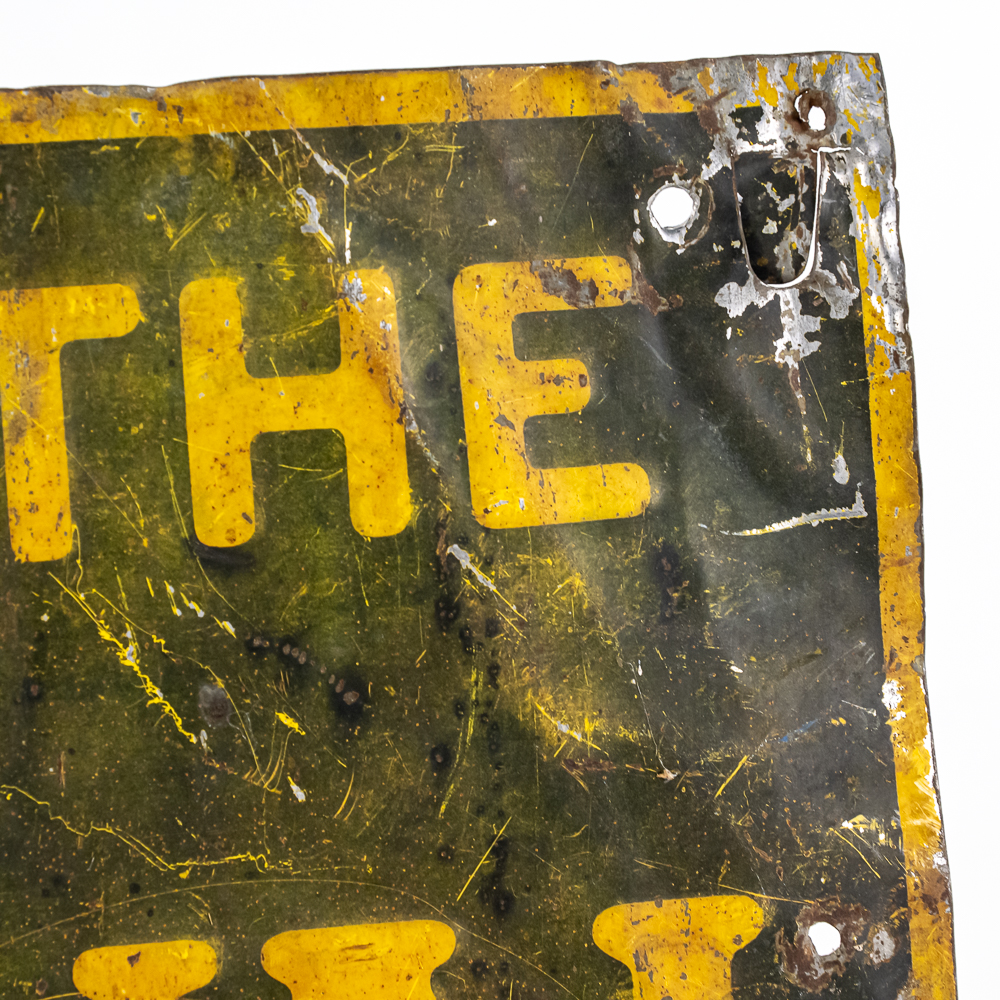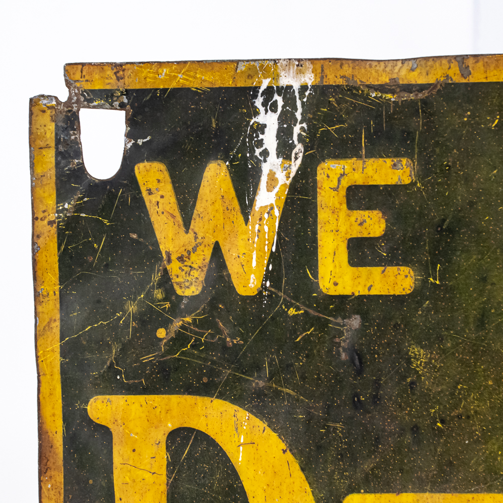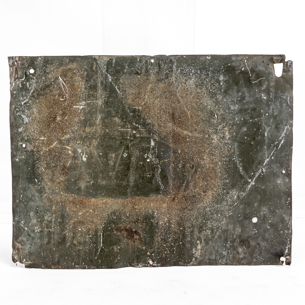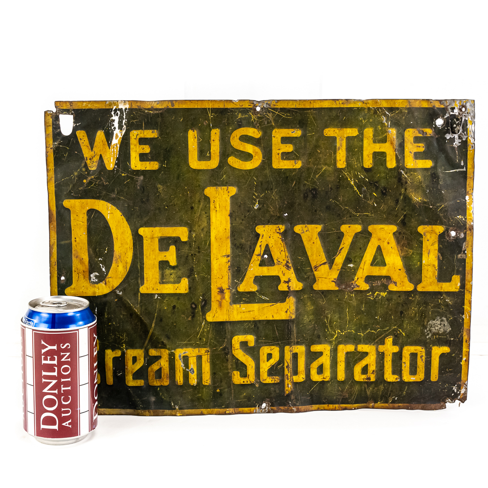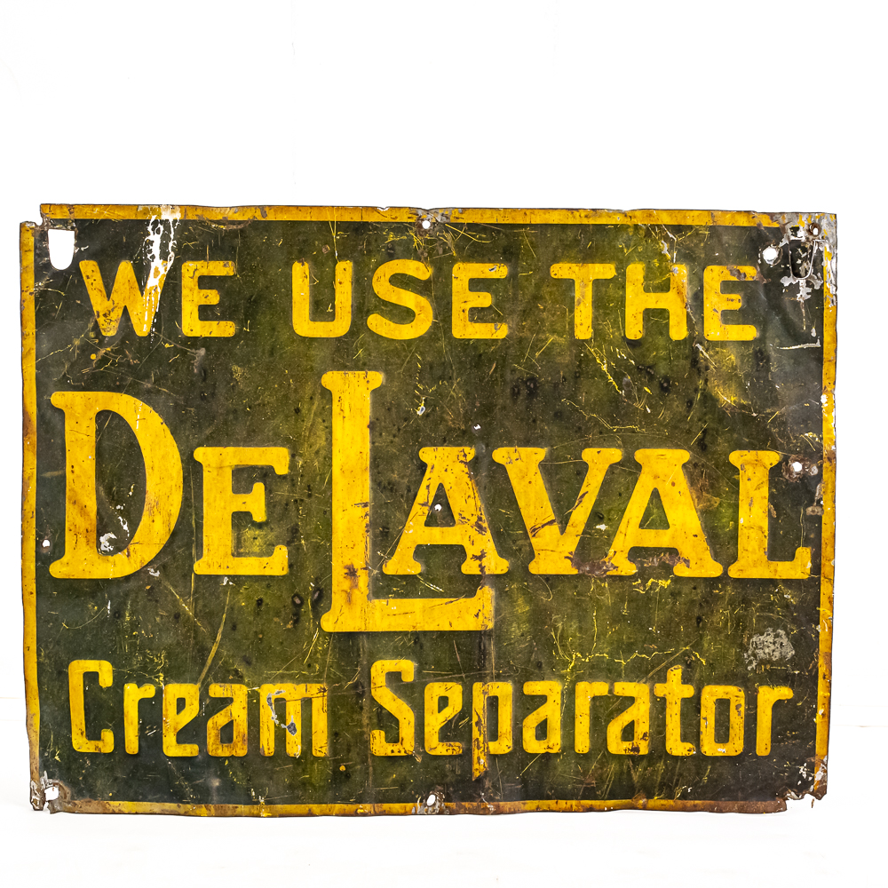 “We Use The DeLaval Cream Separator” embossed single sided metal advertising sign. In good overall condition with moderate discoloration, dents, stray marks, soft corners and extra holes with oxidation rust. Approximately12 “t x 15.5″w. Please use photos to judge condition and bid accordingly.