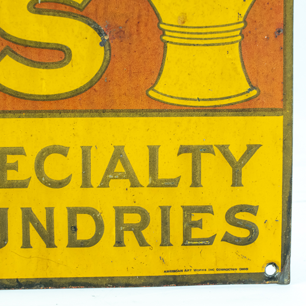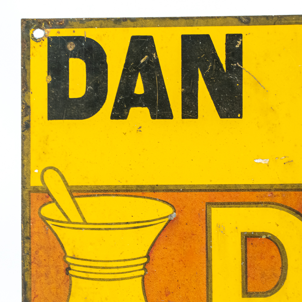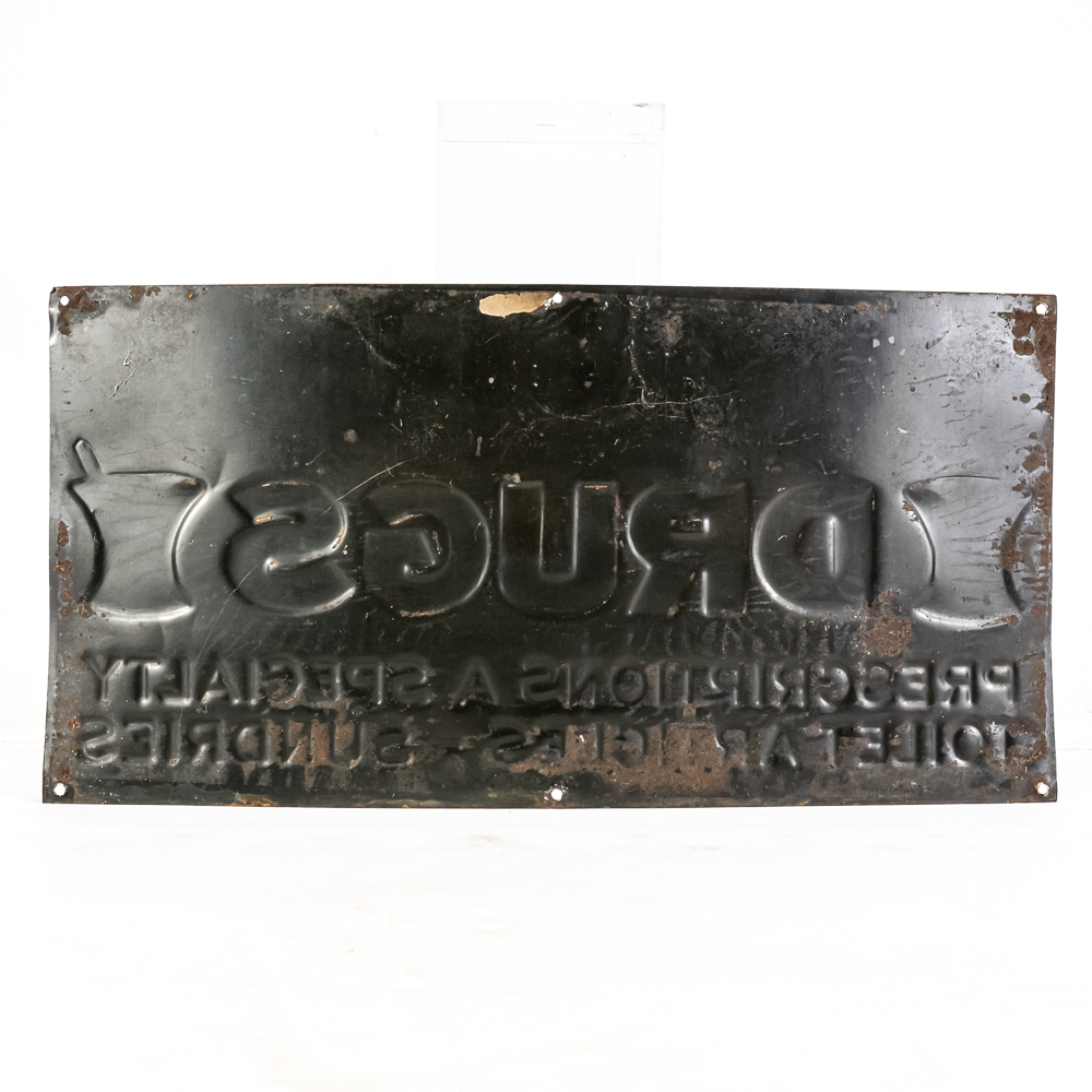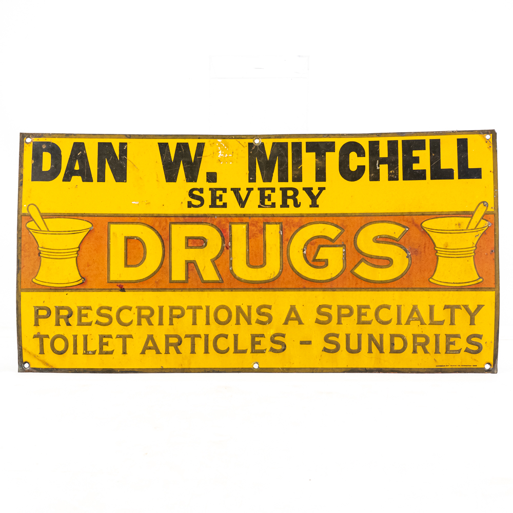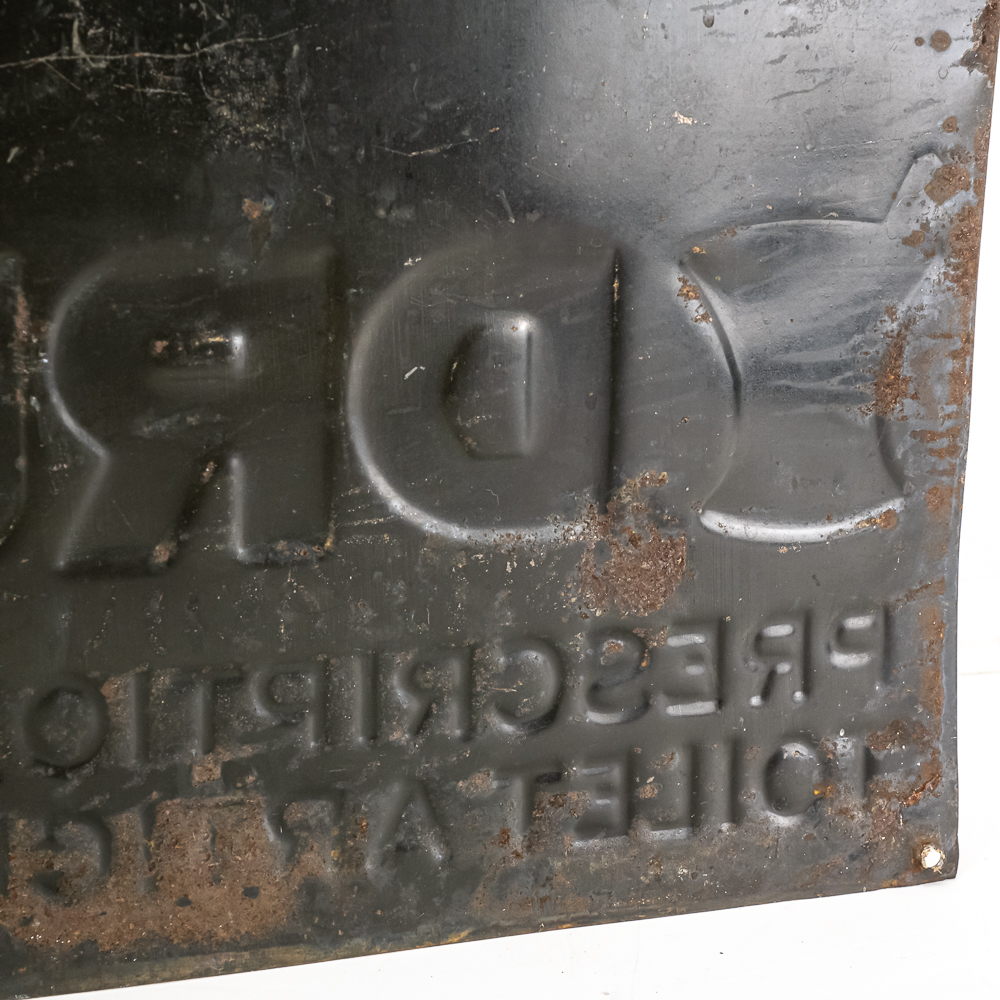 “Dan W. Mitchell” Severy vintage Prescription DRUGS single sided embossed tin advertising sign. Good to good overall condition with some discoloration, stray marks and oxidation. American Art Works Inc Coshocton Ohio near bottom edge. Approximately 11.5″t x 23.5″l. Please use photos to judge condition and bid accordingly.