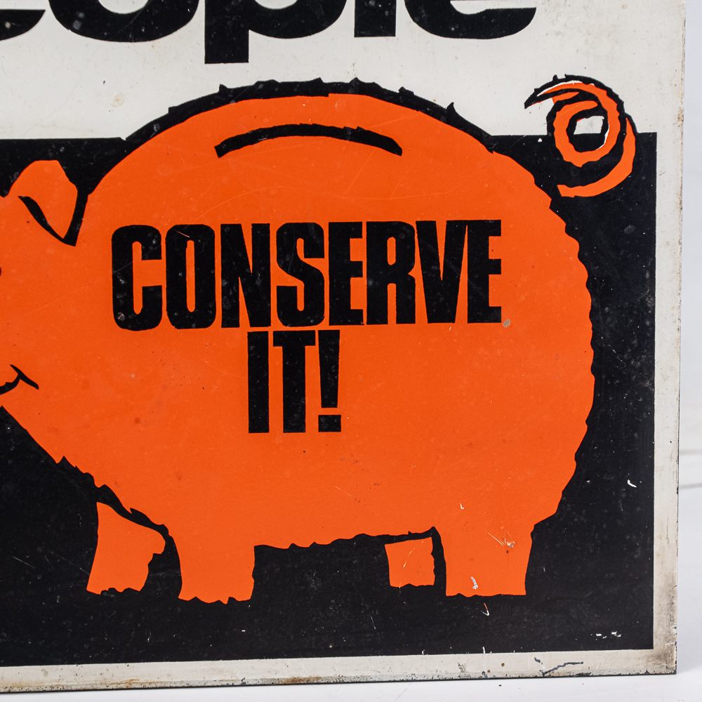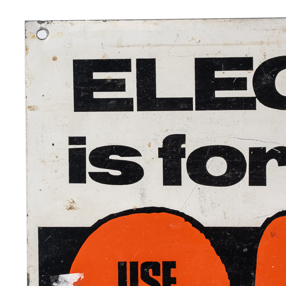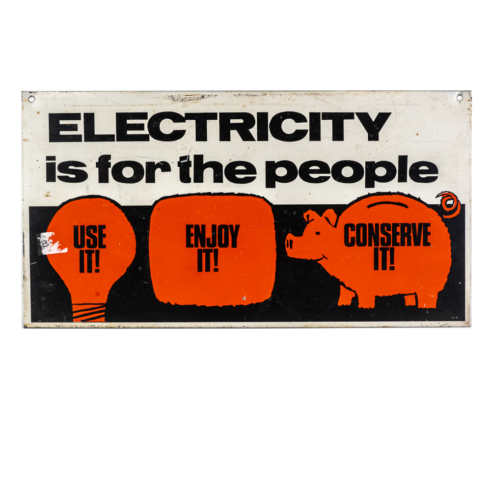 “Electricity is for People Use It! Enjoy It! Conserve It! single sided metal advertising sign. Good overall condition with some discoloration, stray marks, chips, and oxidation. Approximately 10.5″t x 20.5″l. Please use photos to judge condition and bid accordingly.