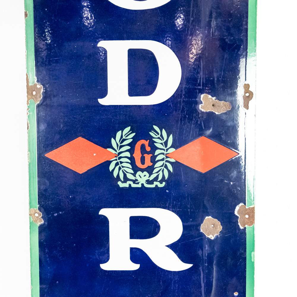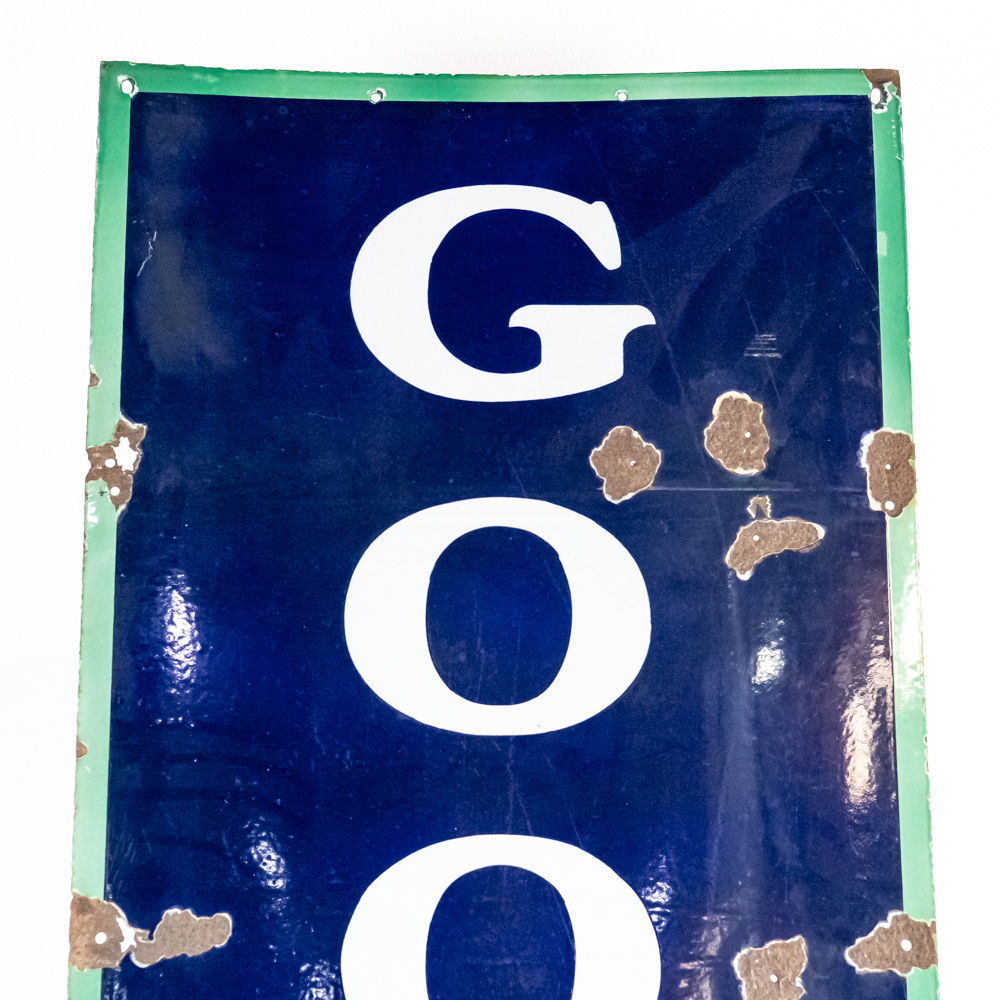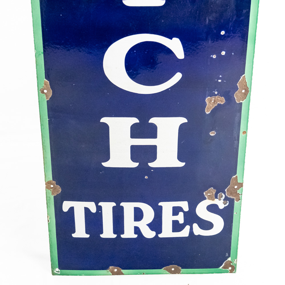 “Goodrich Tires” single sided porcelain advertising sign. Good overall condition with some discoloration, extra holes, scratches & moderate porcelain chips. Presents well with attractive strong color with good gloss. Approximately 20″t x 94″l. Please use photos to judge condition and bid accordingly.