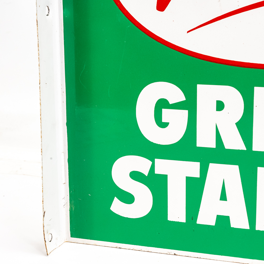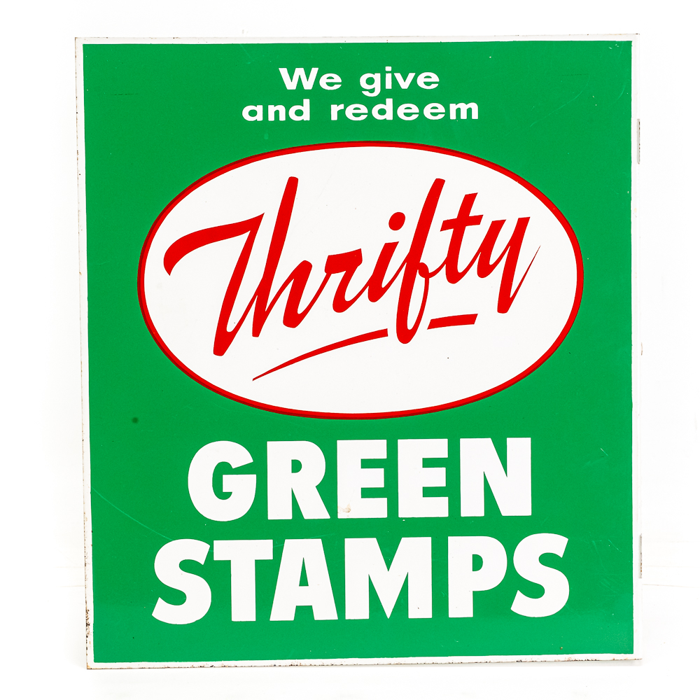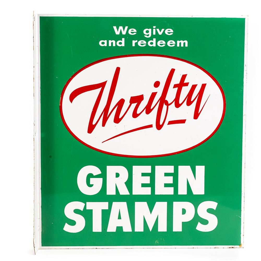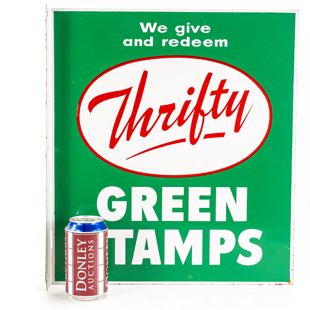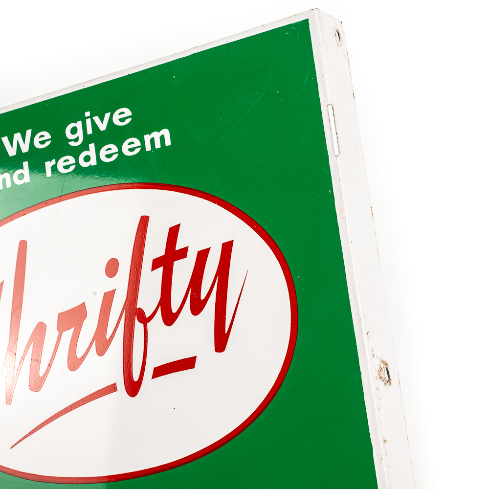 Thrifty Green Stamps double-sided tin advertising flange sign. Presents extremely well with attractive eye catching color. Flange has (3) side attachment holes. Very good overall condition with some age and wear related cosmetic imperfections including minimal scratches & oxidation. Perfect addition to your collection; 18″t x “16.5”l. Please use photos to judge condition and bid accordingly.