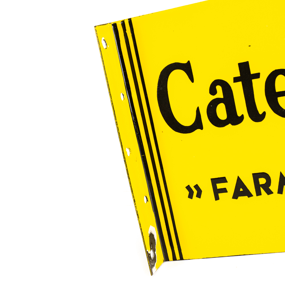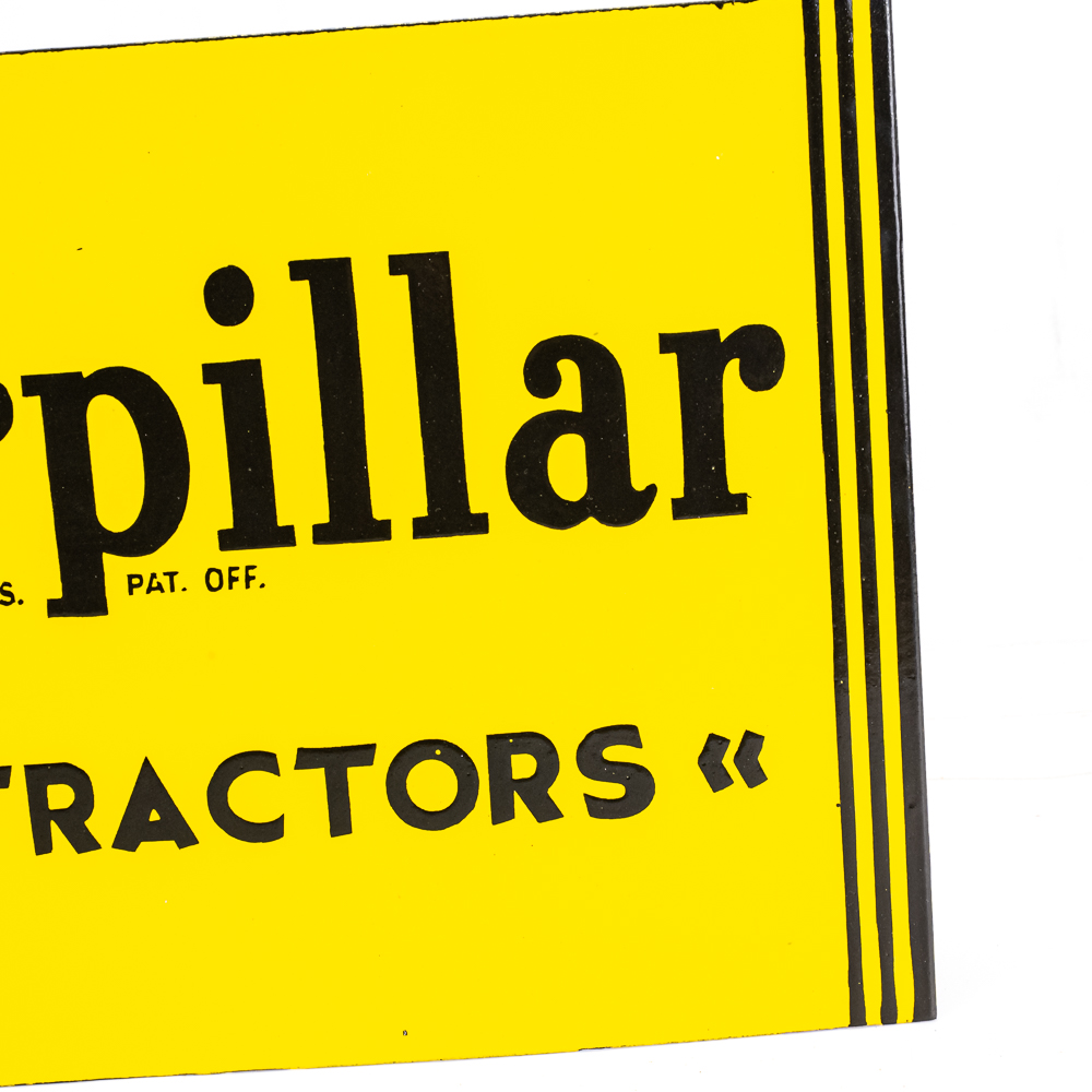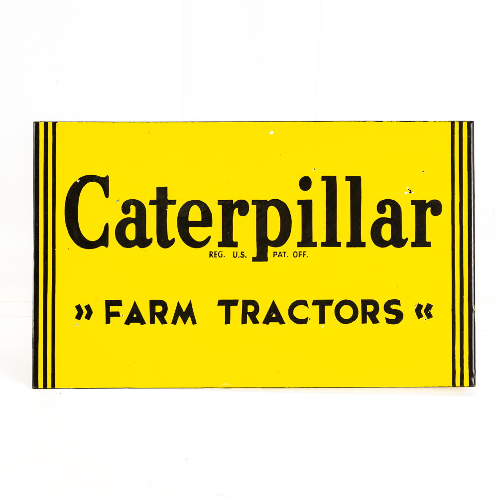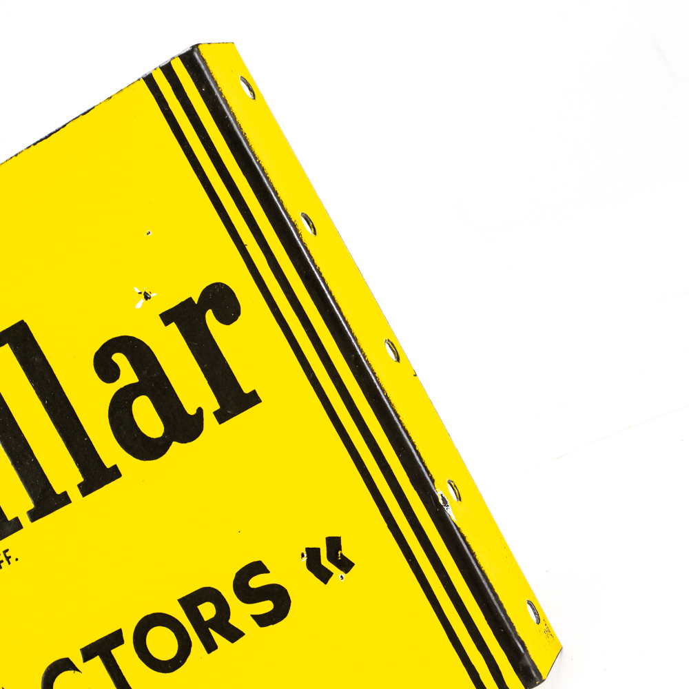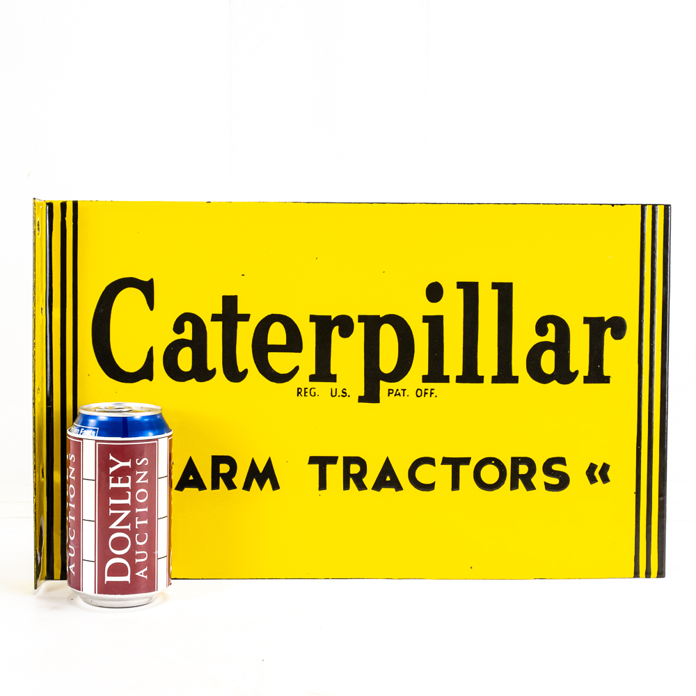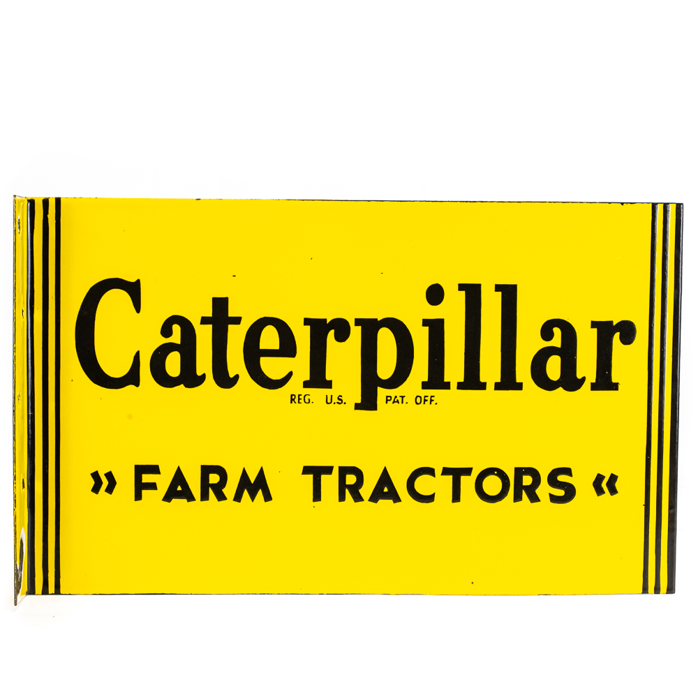 Caterpillar Farm Tractors metal double sided porcelain flange advertising sign. Presents well with eye catching bold coloring along with some age and wear related cosmetic imperfections including some chips, paint loss & oxidation. “REG U.S. PAT OFF. Perfect addition to your collection; 10″t x 16.5″l. Please use photos to judge condition and bid accordingly.