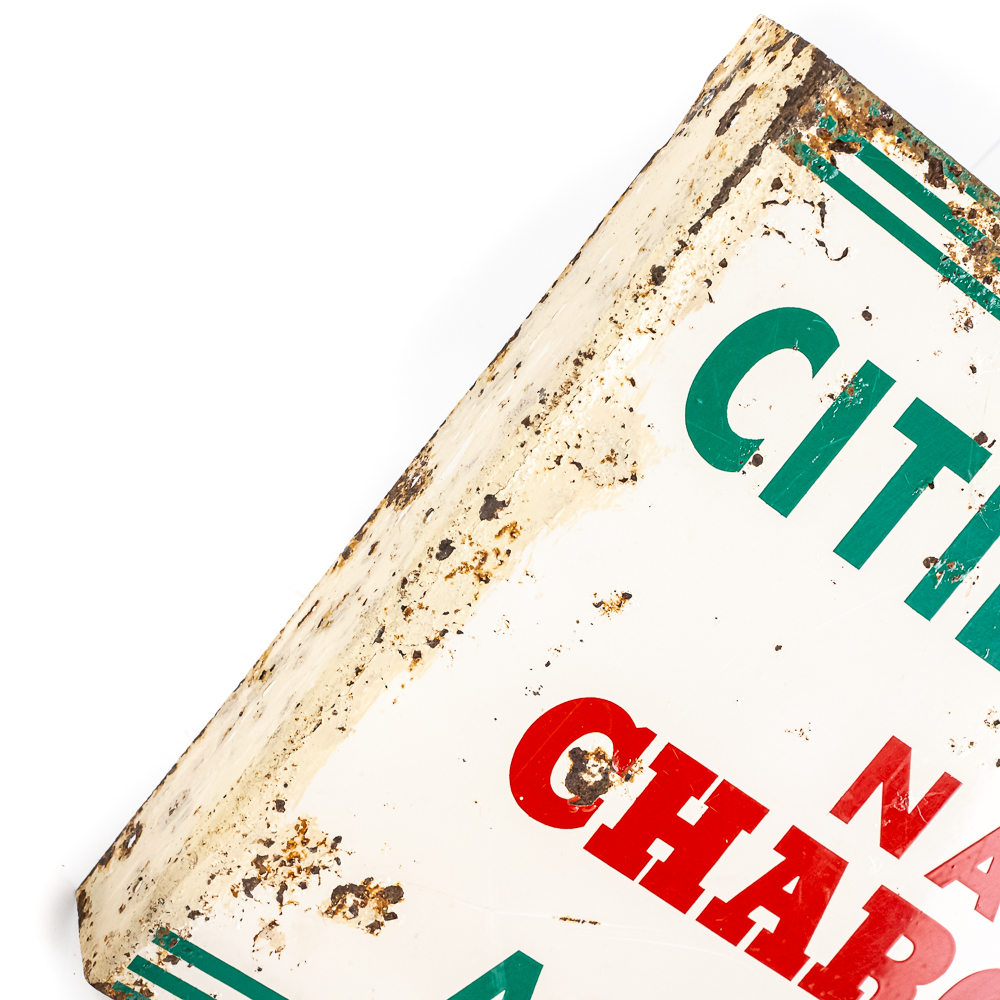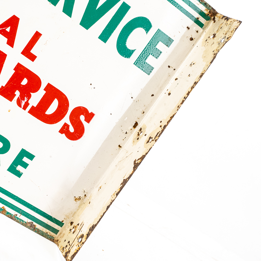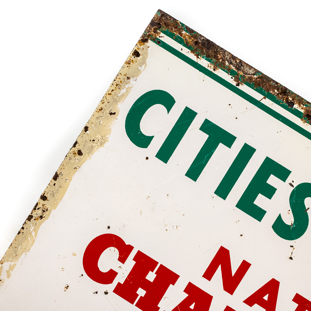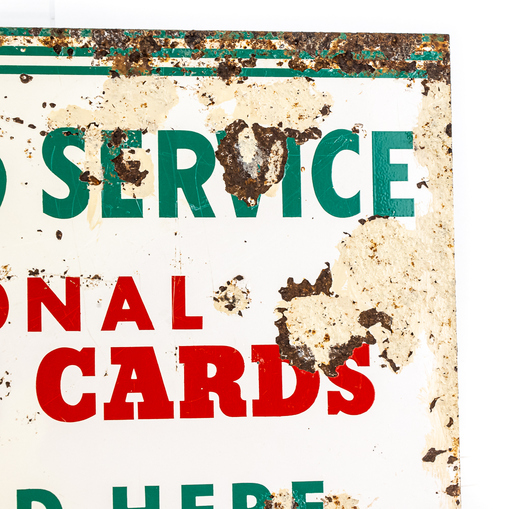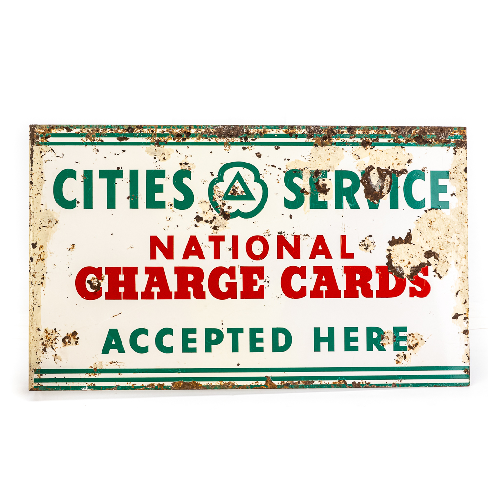 Cities Service National Charge Card double sided tin flange advertising sign. Presents well with eye catching color along and in good overall condition with some age and wear related cosmetic imperfections including some scratches, bubbles, paint loss & oxidation. Perfect addition to your collection; 12″t x 20″l. Please use photos to judge condition and bid accordingly.