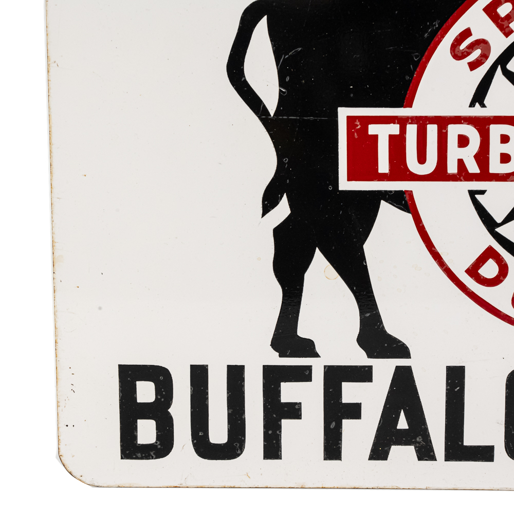Turbulent Air Buffalo Turbine painted double sided metal advertising flange sign. Very good to good overall condition with minimal scratches, stray marks and oxidation. Presents extremely well with attractive eye catching color scheme; Flange shows (4) attachment holes with “AM 10- 54” stamped. Approximately 12″t x 18″l, please use photos to judge condition and bid accordingly.