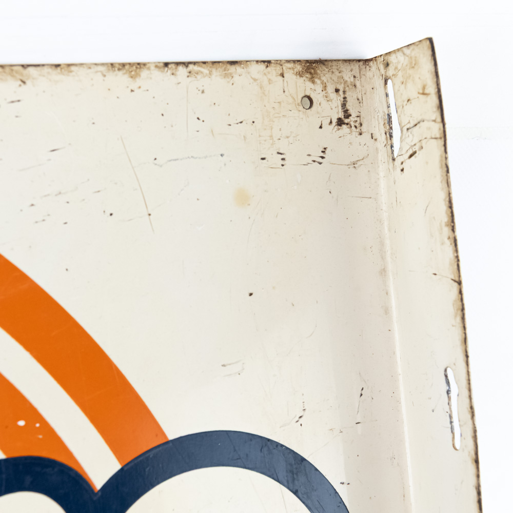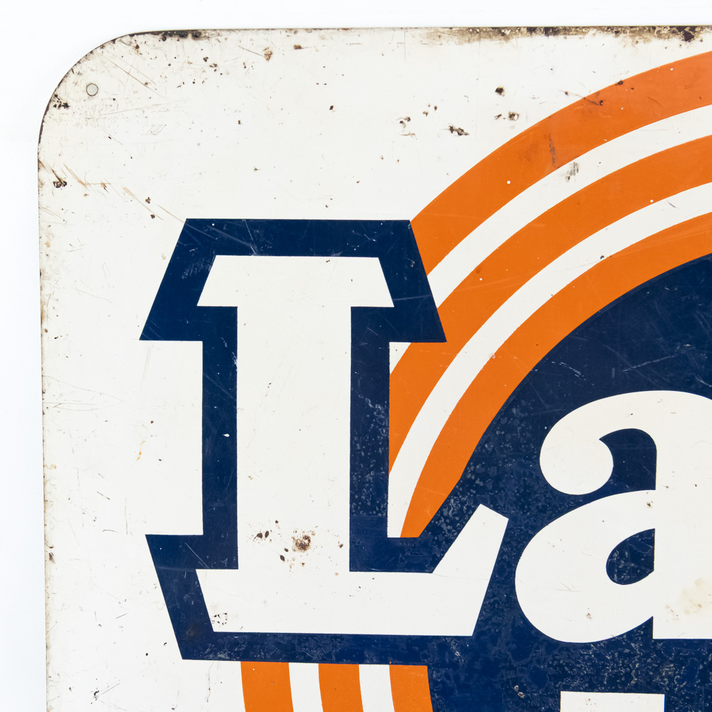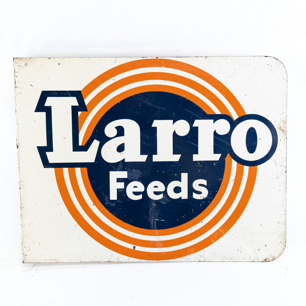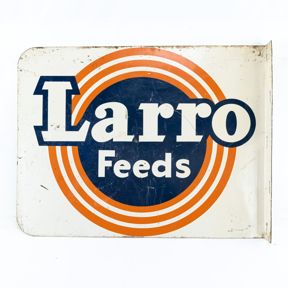 Larro Feeds double sided painted metal flange advertising sign. Very good overall condition with some discoloration, chips, stray marks and oxidation. Flange shows (5) holes and approximately 20″t x 26″l. Please use photos to judge condition and bid accordingly.