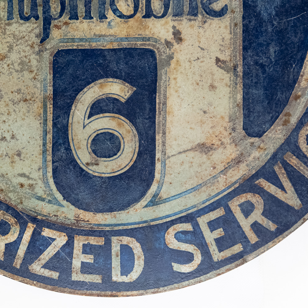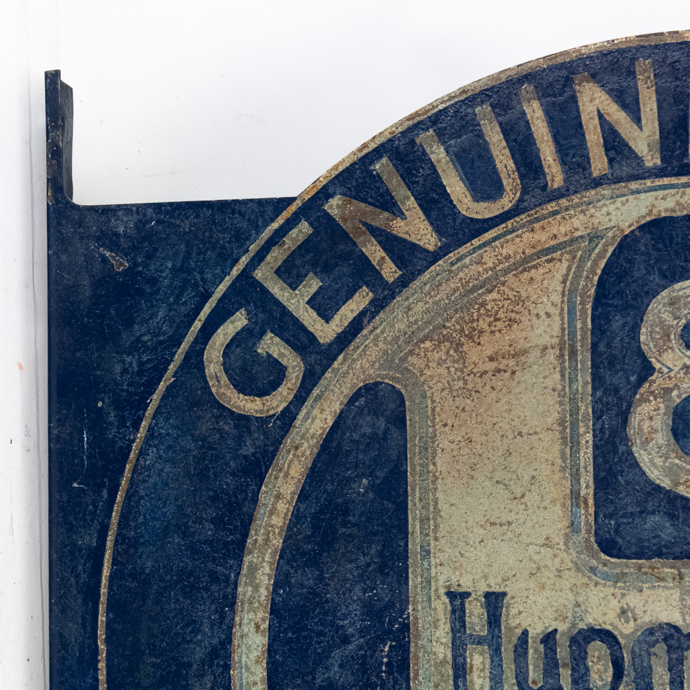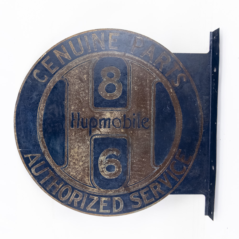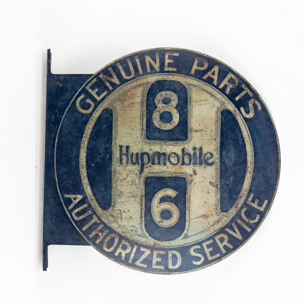 Scarce Hupmobile authorized Service double sided flange hand painted metal advertising sign. Good overall condition with some discoloration, stray marks and oxidation. Flange shows repair and (8) holes; Approximately 21″t x 22″l. Please use photos to judge condition and bid accordingly.