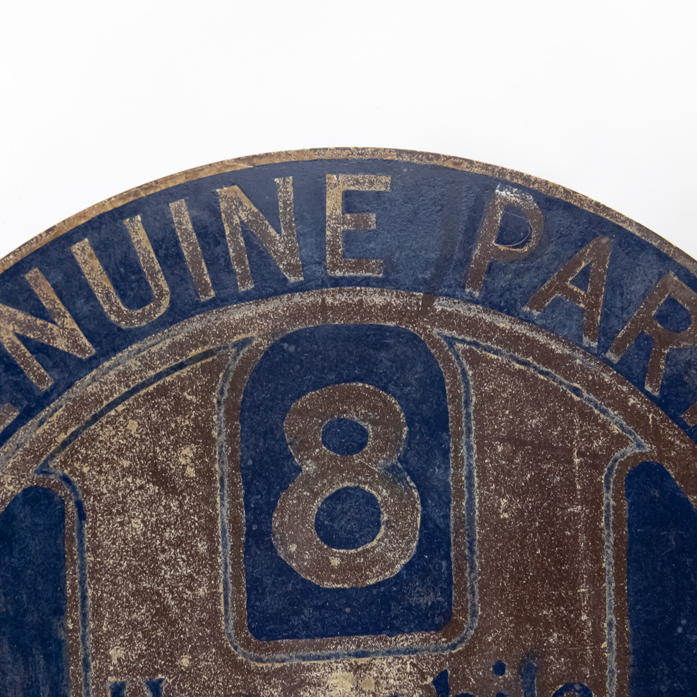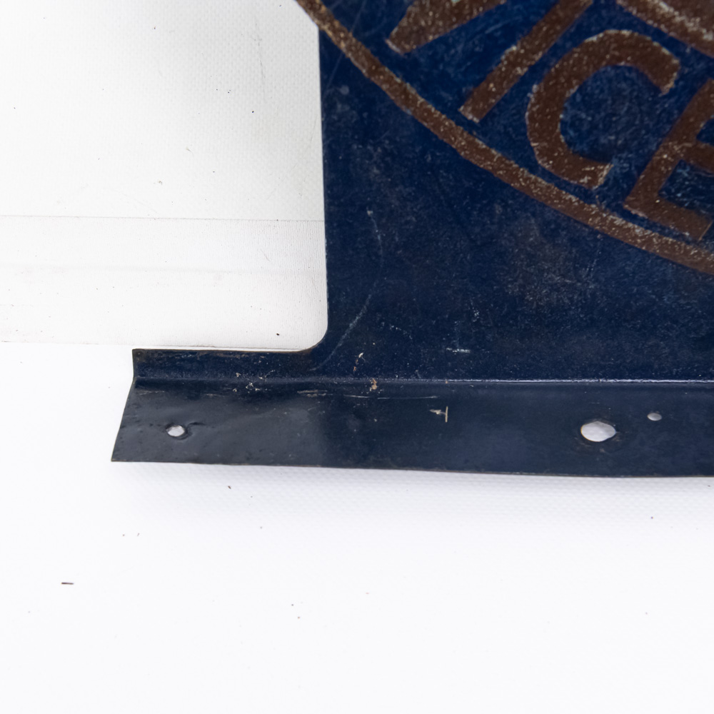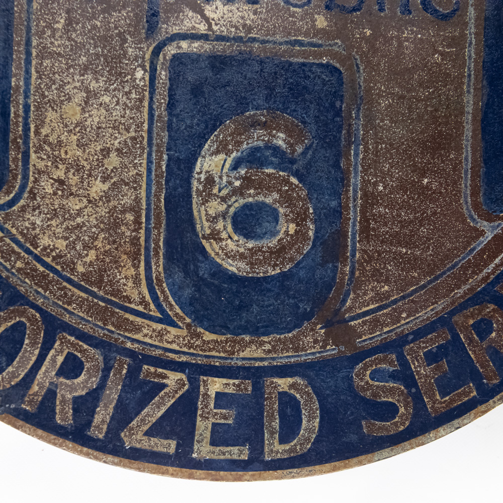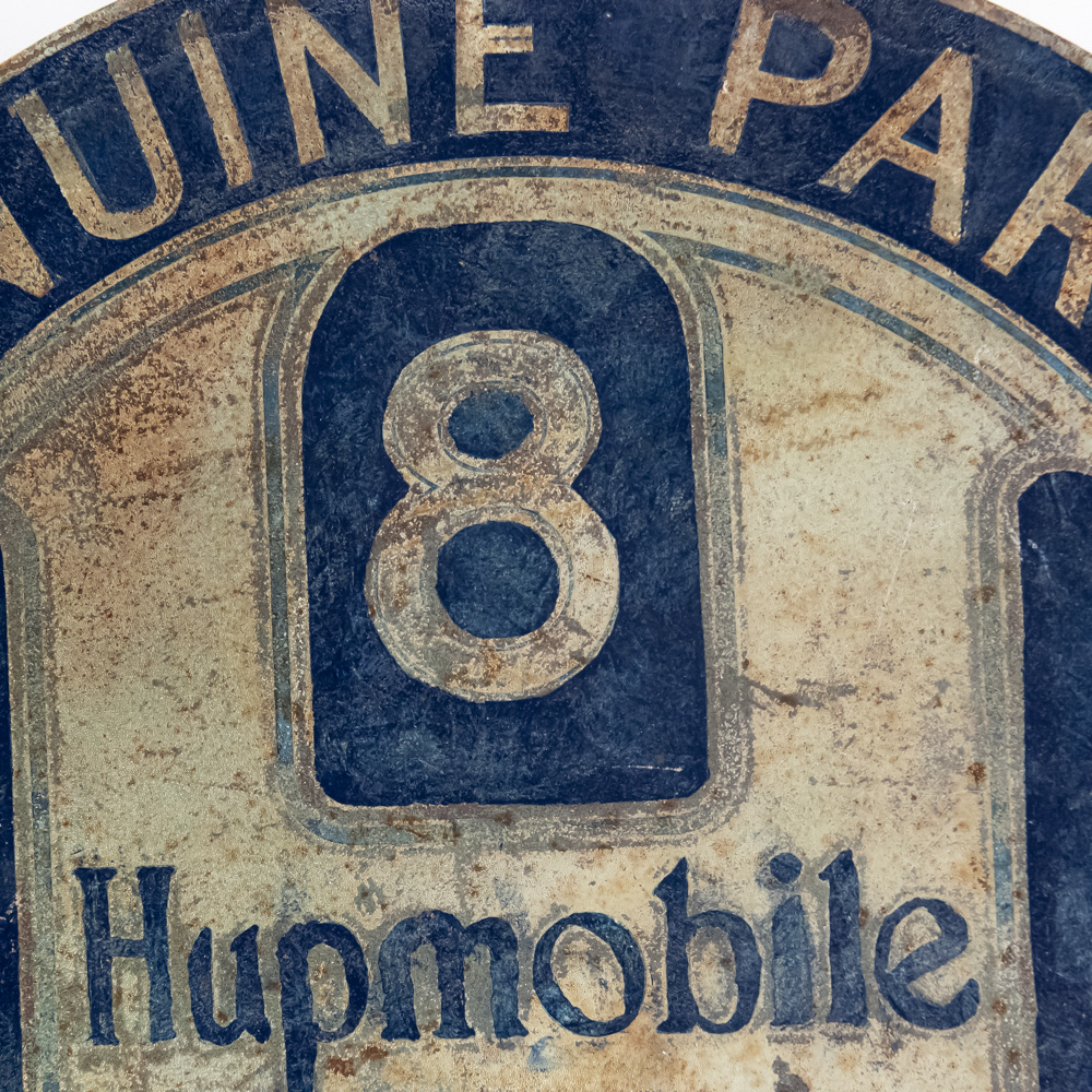 Scarce Hupmobile authorized Service double sided flange hand painted metal advertising sign. Good overall condition with some discoloration, stray marks and oxidation. Flange shows repair and (8) holes; Approximately 21″t x 22″l. Please use photos to judge condition and bid accordingly.