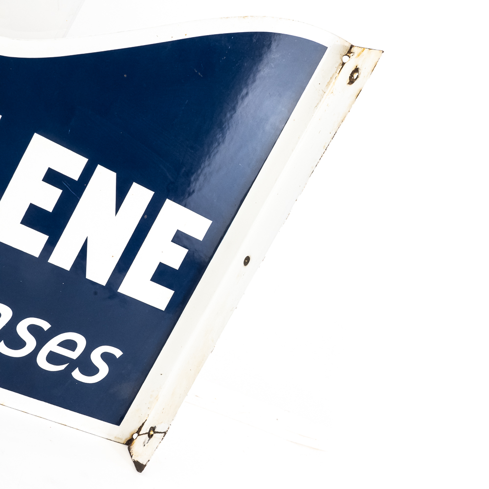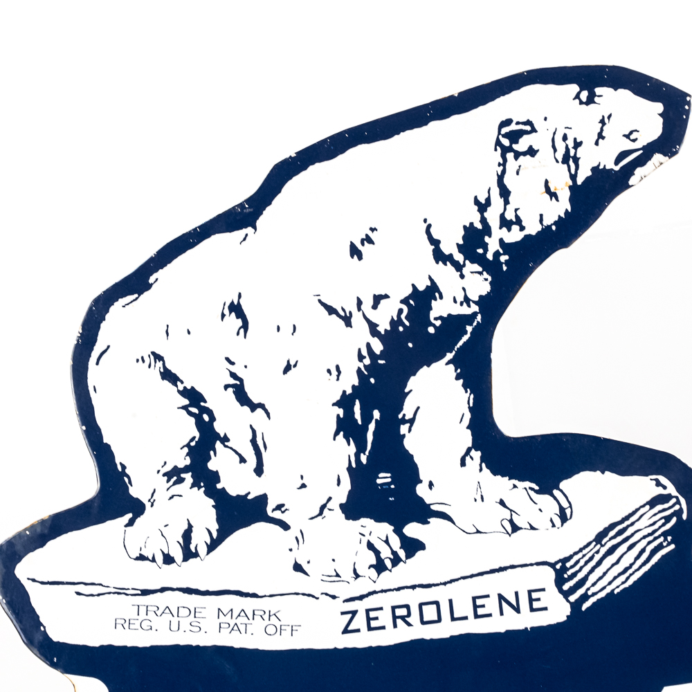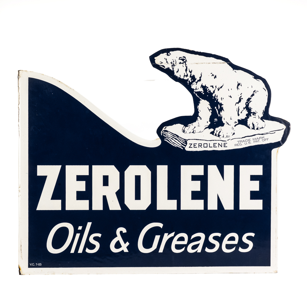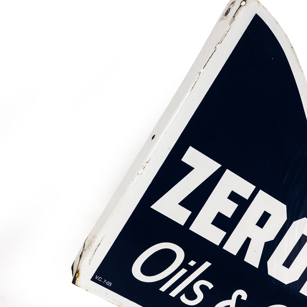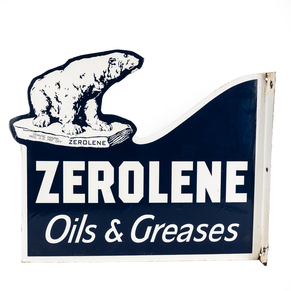 “Zerolene Oil & Greases” porcelain double sided flange advertising sign. Presents extremely well with vivid eye catching glossy color and subject matter. Both sides are in very good overall condition with minor discoloration and minor stray marks (minor chipped porcelain). Approximately 20″t x 24″w. Perfect addition to your collection, Please use photos to judge condition and bid accordingly.