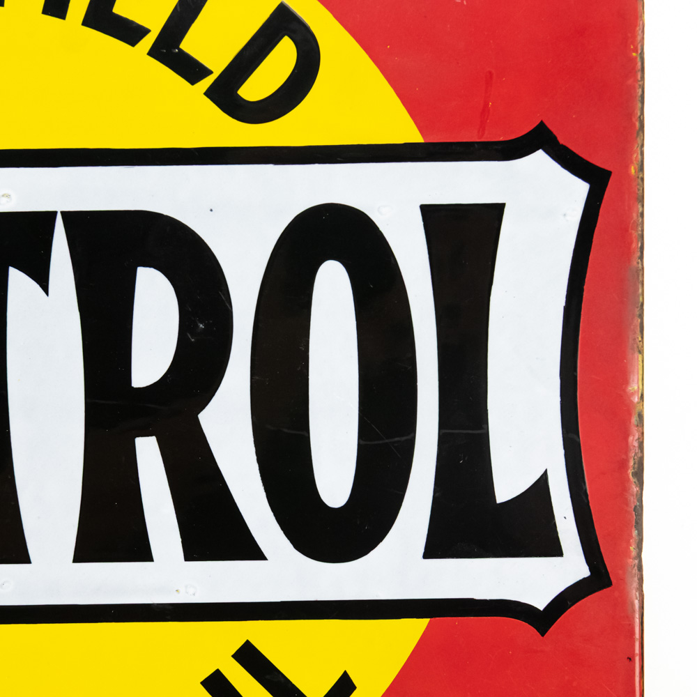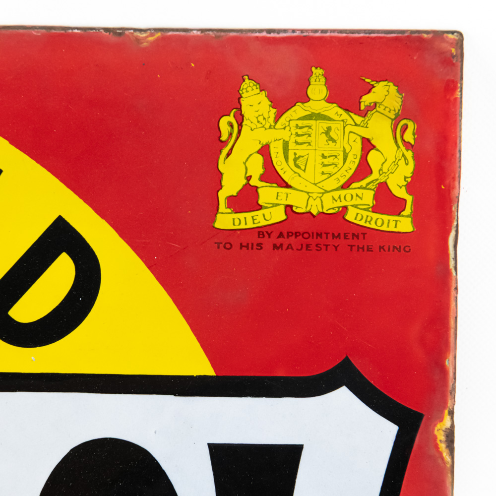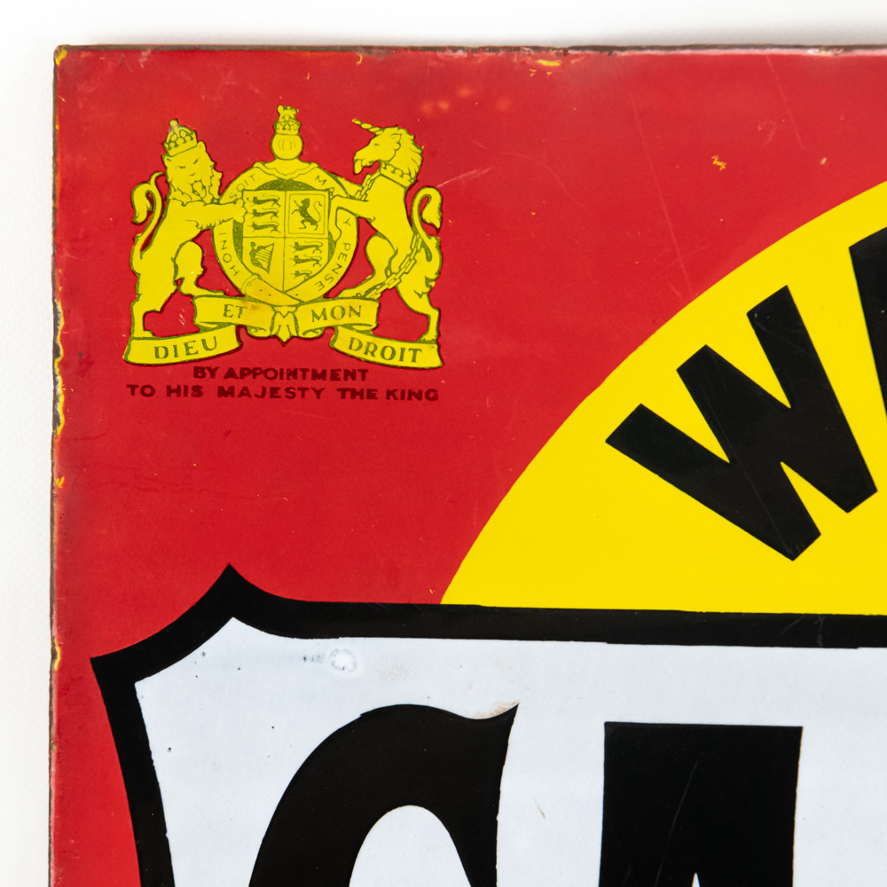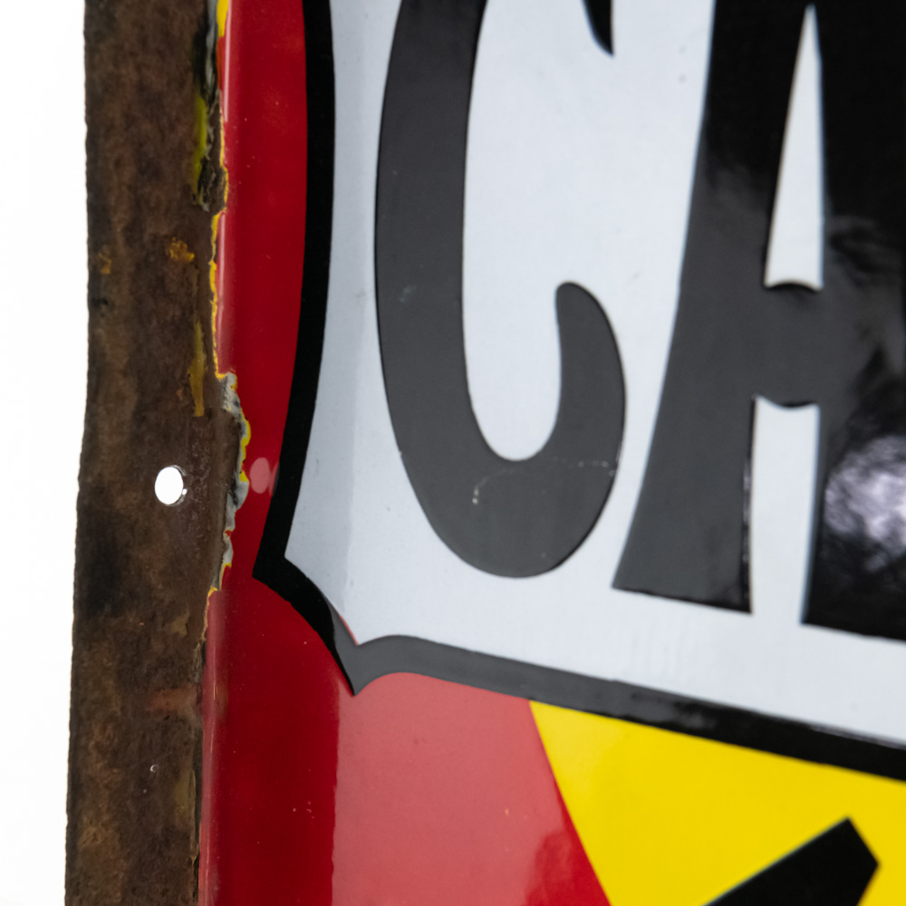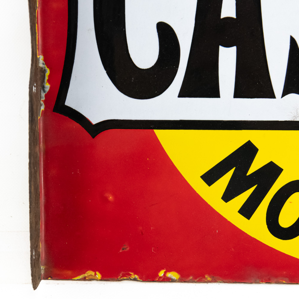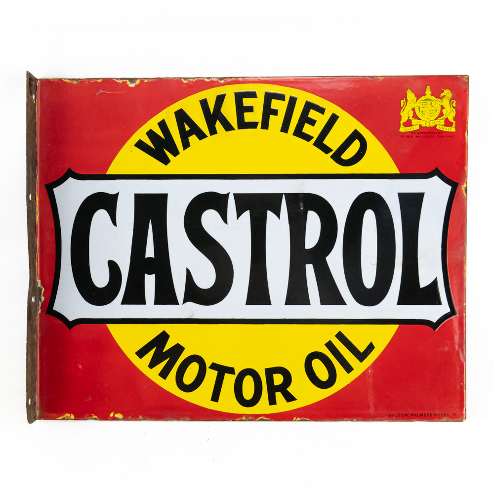 Wakefield Castrol Motor Oil double sided flange porcelain advertising sign. Good overall condition with some discoloration, chipped porcelain, stray marks and oxidation. Presents well with attractive bold color with “Bruton, Palmere Green N” near bottom edge. Flange shows repair and (4) holes; Approximately 16″t x 20.5″l. Please use photos to judge condition and bid accordingly.