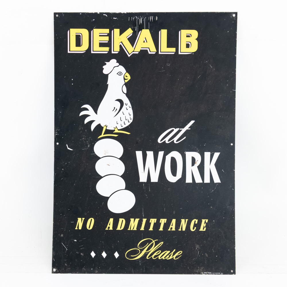 Dekalb “At Work No Admittance Please” single sided tin advertising sign. “JV Patten Sycamore ILL” stamped near bottom edge. Good to very good overall condition with some discoloration, scratches & stray marks. Approximately 20″t x 14″l. Please use photos to judge condition and bid accordingly.