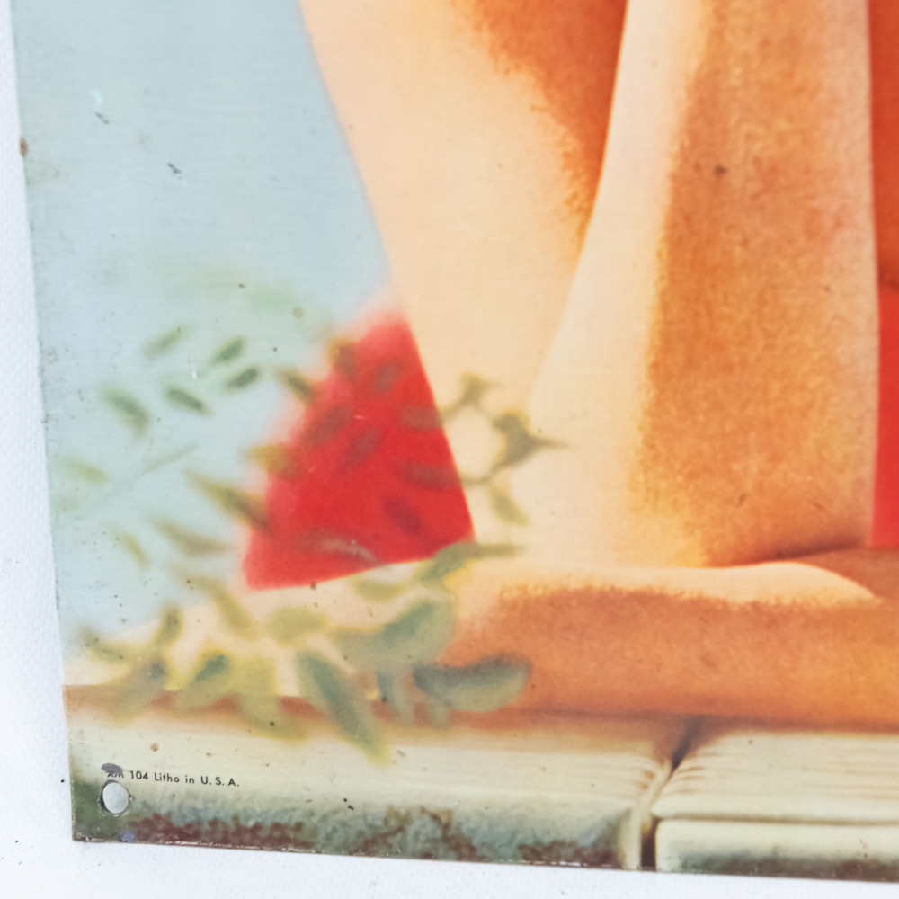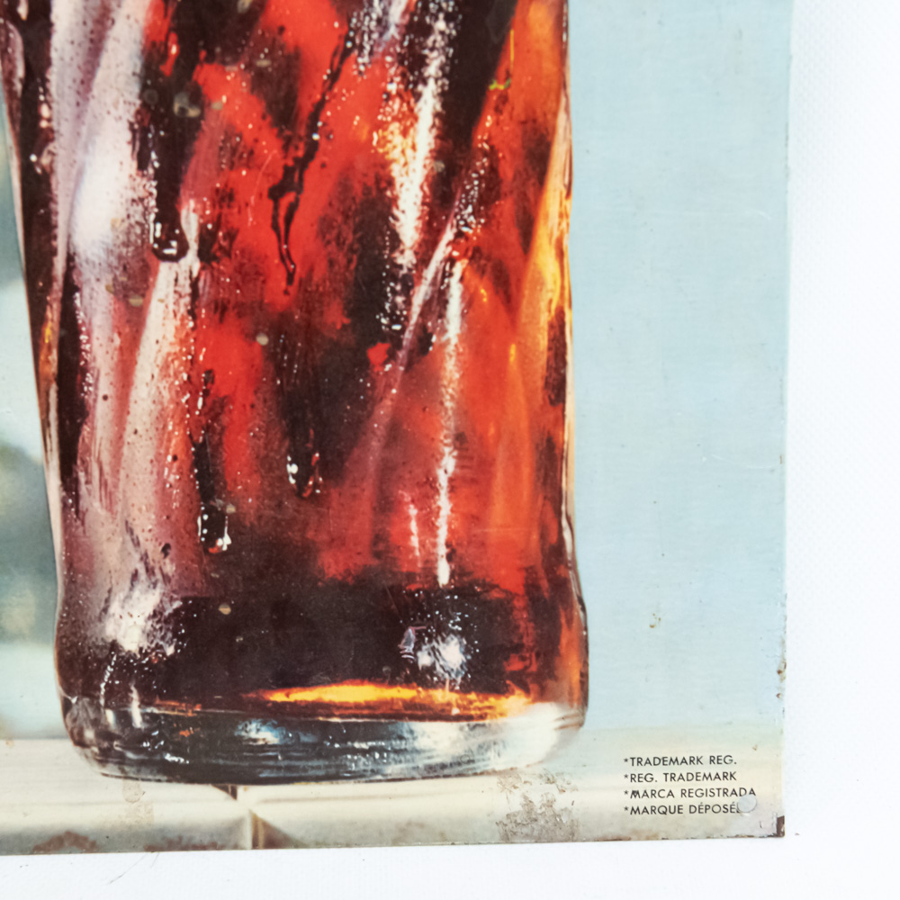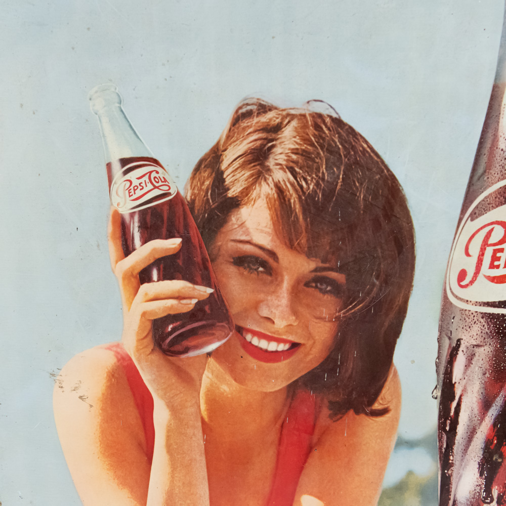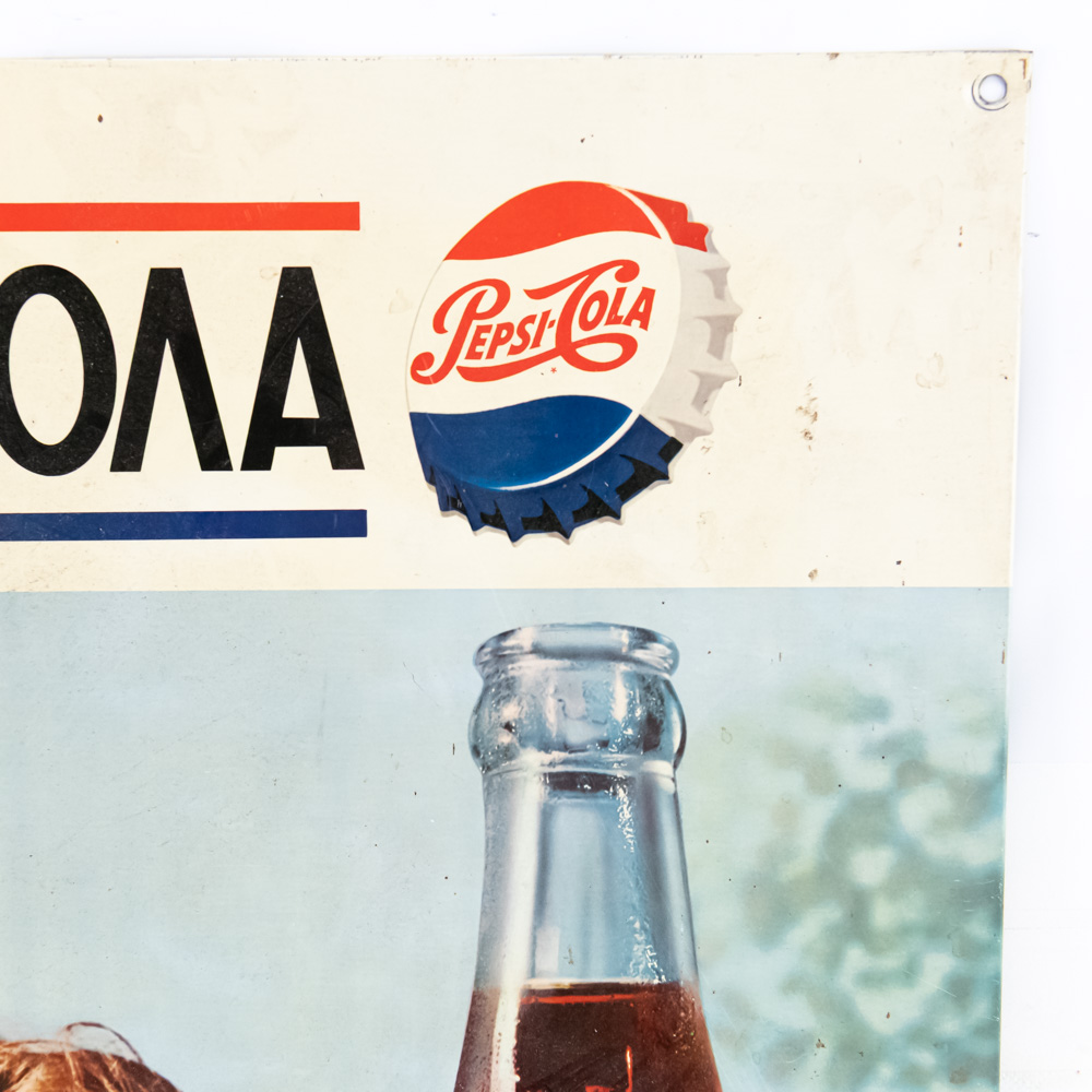 1970s Greek Pepsi single sided tin litho advertising sign. Very good to good overall condition with some discoloration, stray marks, chips, and oxidation. Approximately 28″t x 19.5″l. Trademark Reg. Reg Trademark Marca Registrada Marque Depose” near bottom edge. Please use photos to judge condition and bid accordingly.