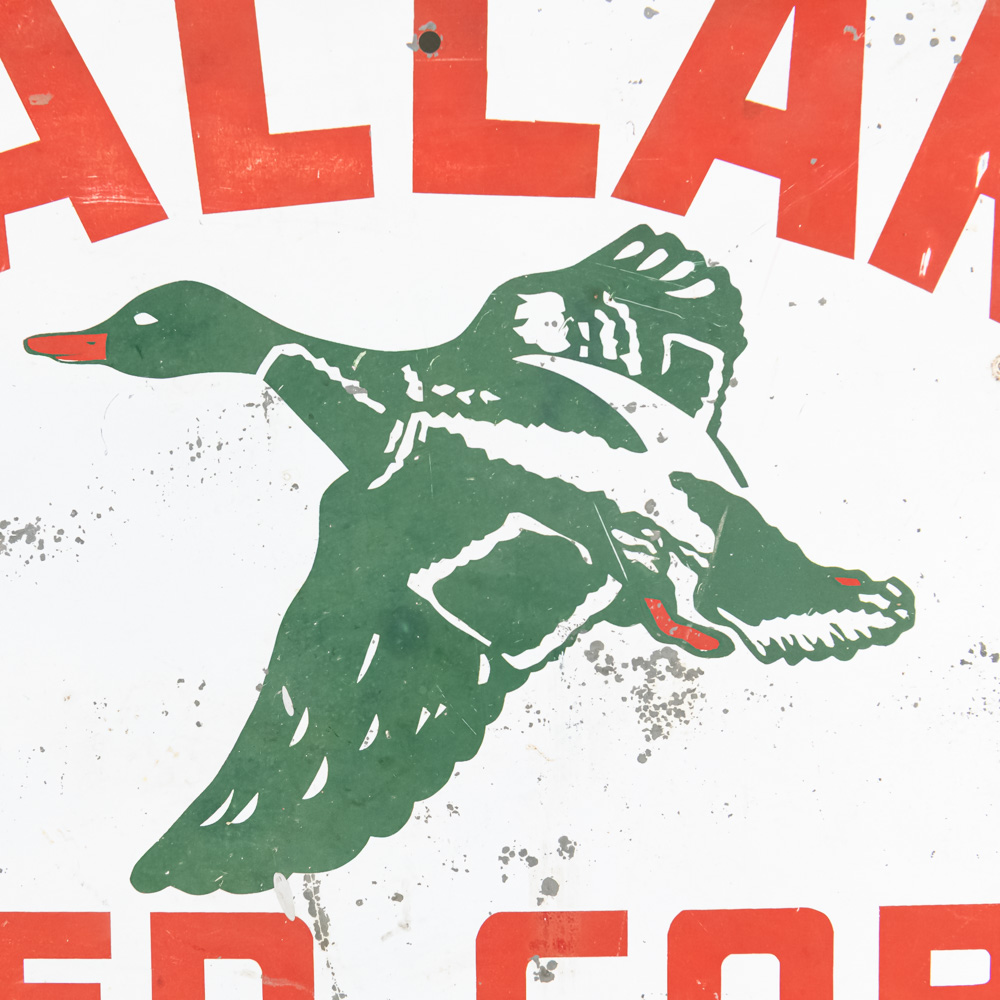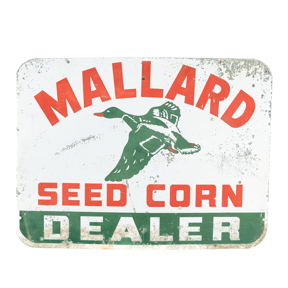 Mallard Seed Corn Dealer single sided tin advertising sign. Good to very good overall condition with age and wear including extra holes, paint loss & oxidation. Approximately 18″t x 24″l, please use photos to judge condition and bid accordingly.