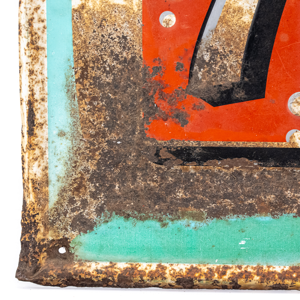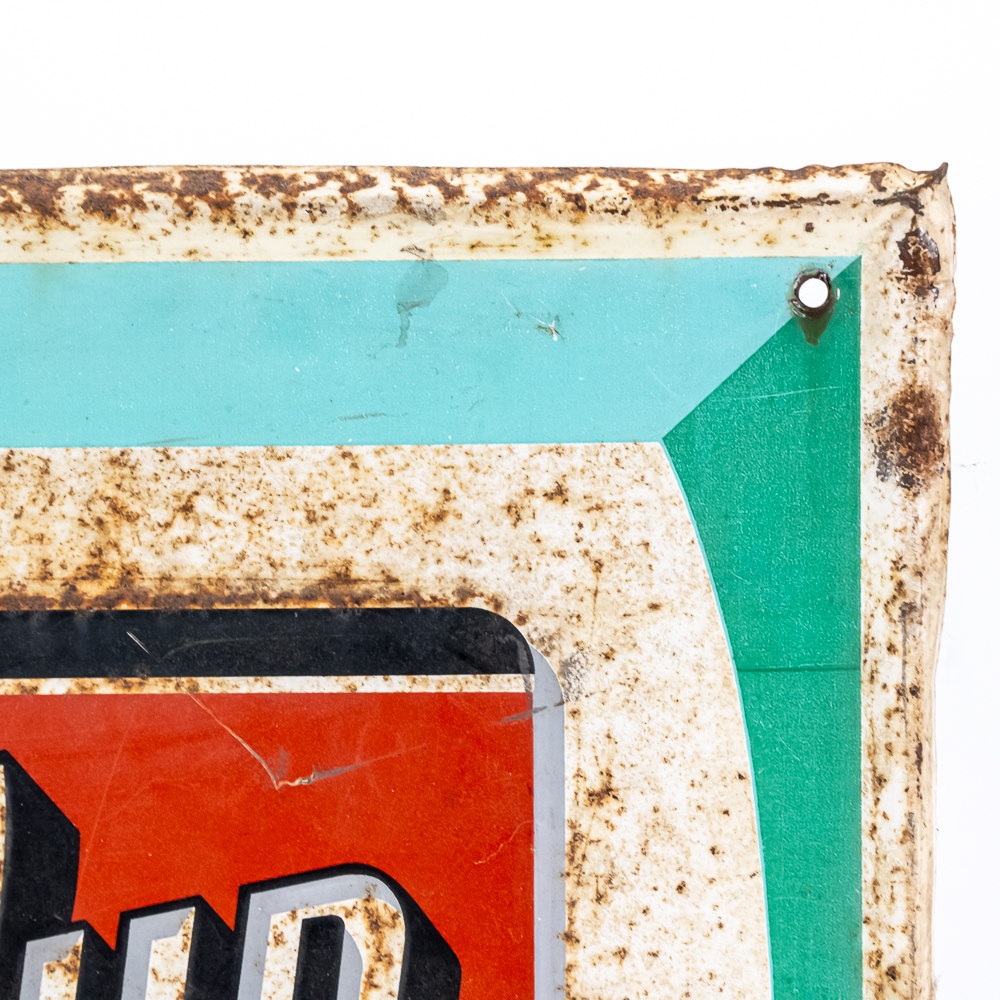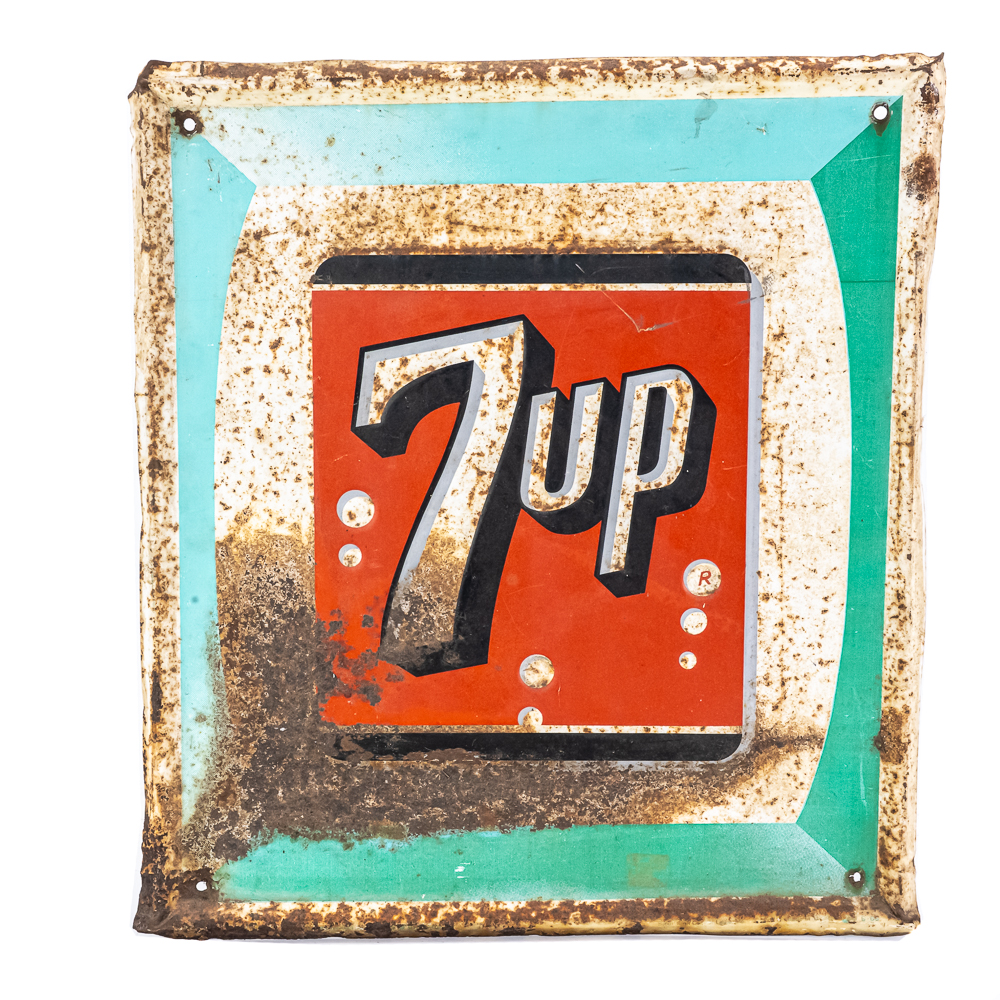 1960s original 7-UP with bubbles self framed embossed tin advertising sign. Good overall condition with some age and wear including moderate oxidation and soft corners. Approximately 19.5″t x 17.5″l, please use photos to judge condition and bid accordingly.
