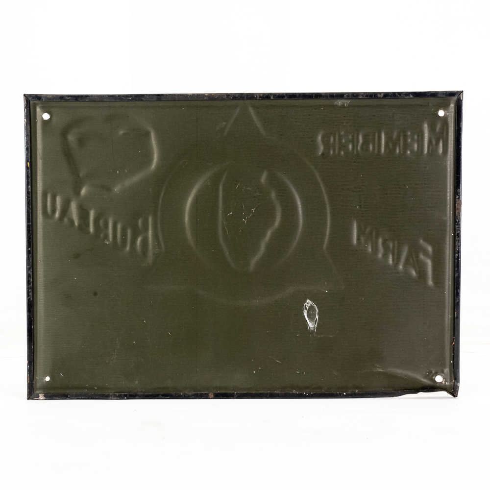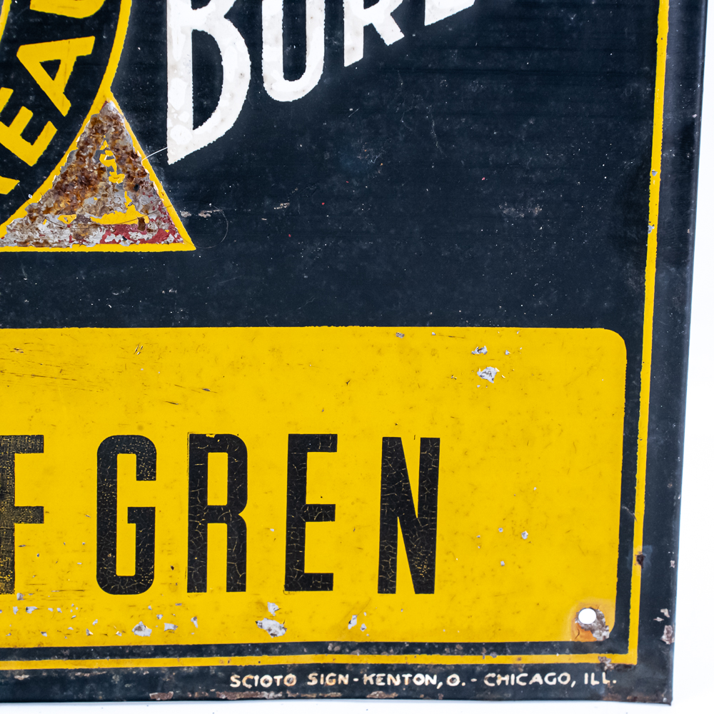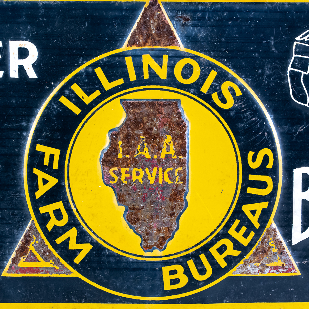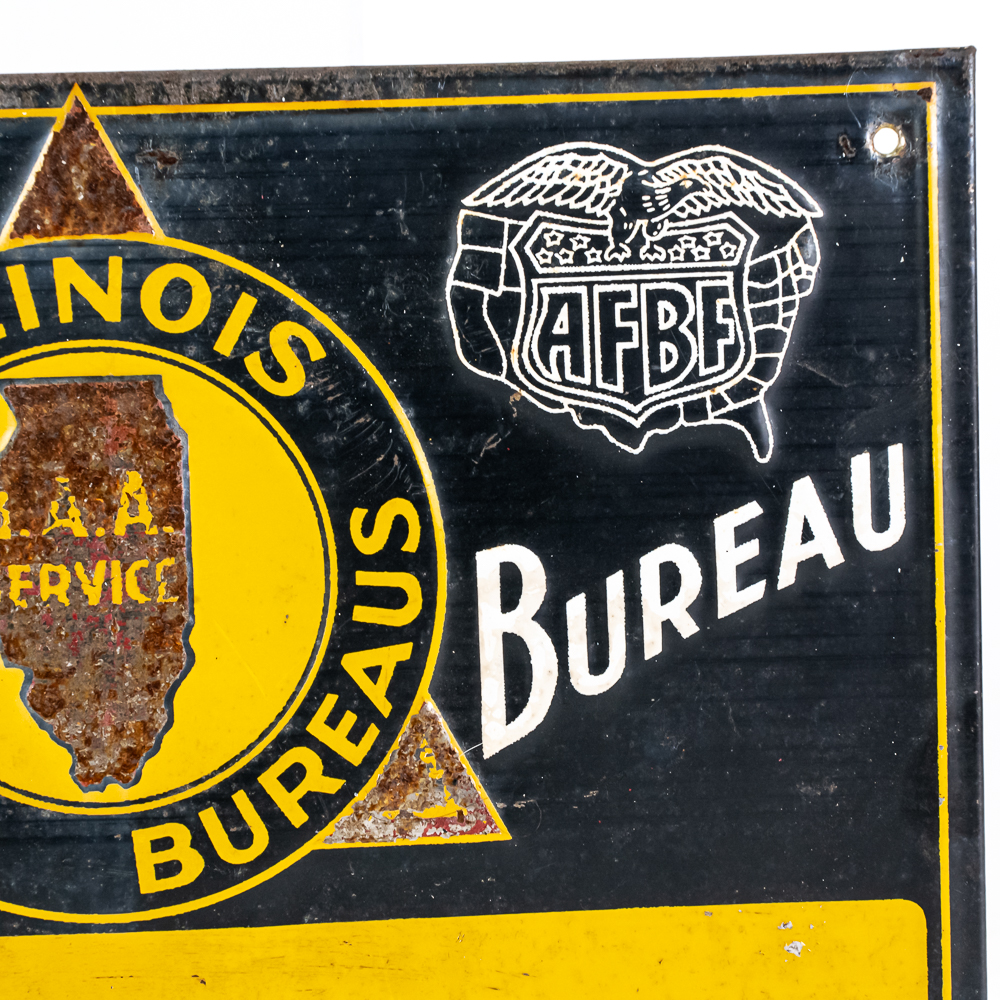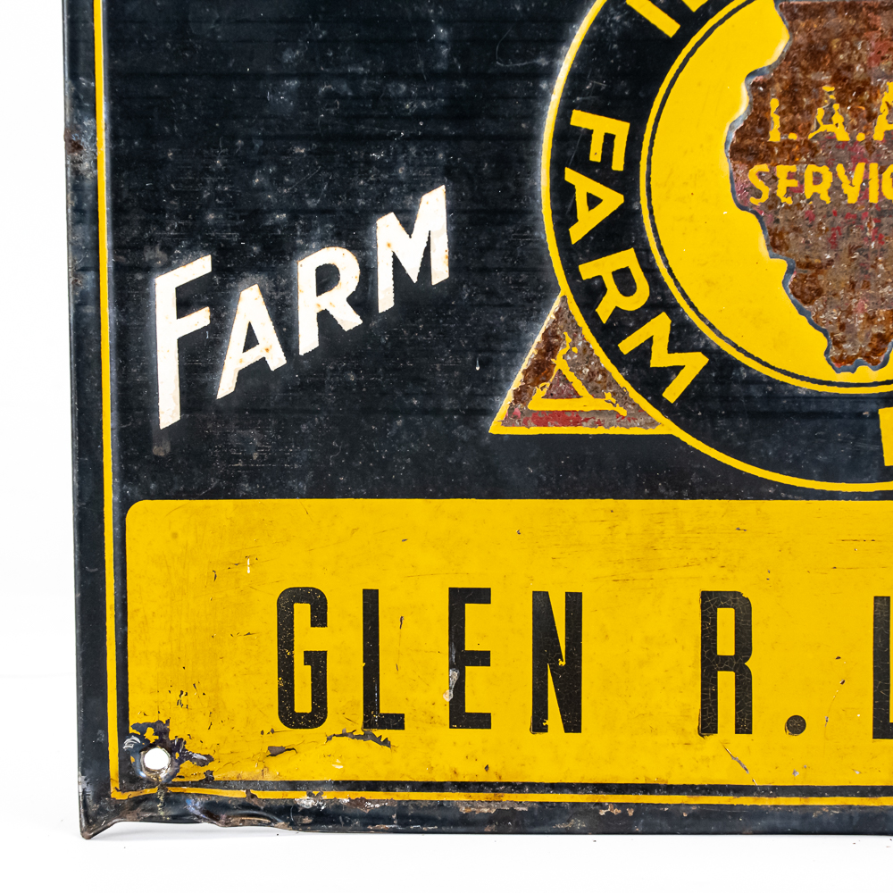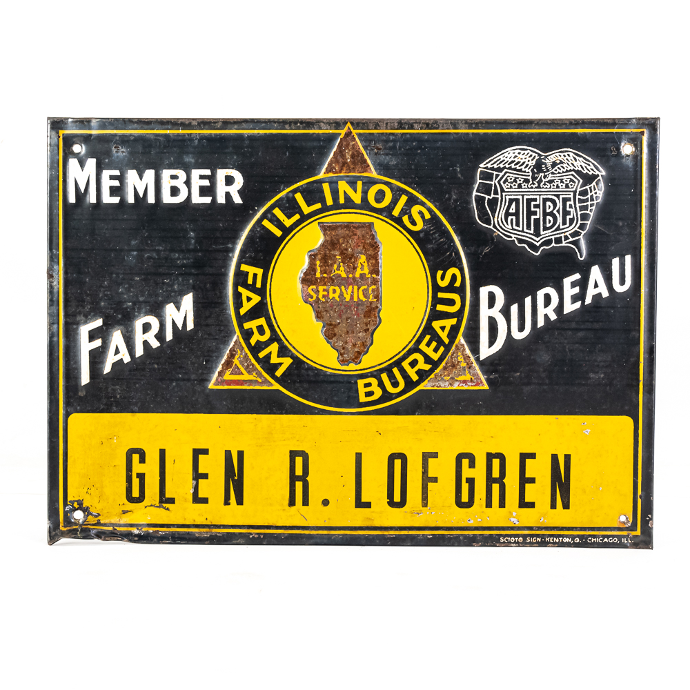 Illinois Farm Bureau Member “Glen R. Lofgren embossed tin advertising sign. Good overall condition with some age and wear including chips, discoloration and oxidation. One corner shows un-eveness from over tightening screw. Scioto Sign Kenton O Chicago ILL bottom corner. Approximately 9.5″t x 13.5”, please use photos to judge condition and bid accordingly.