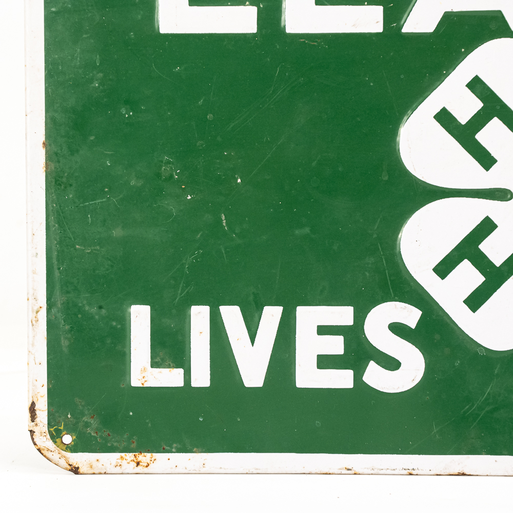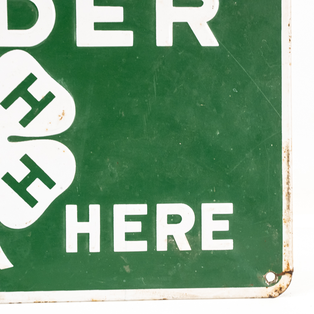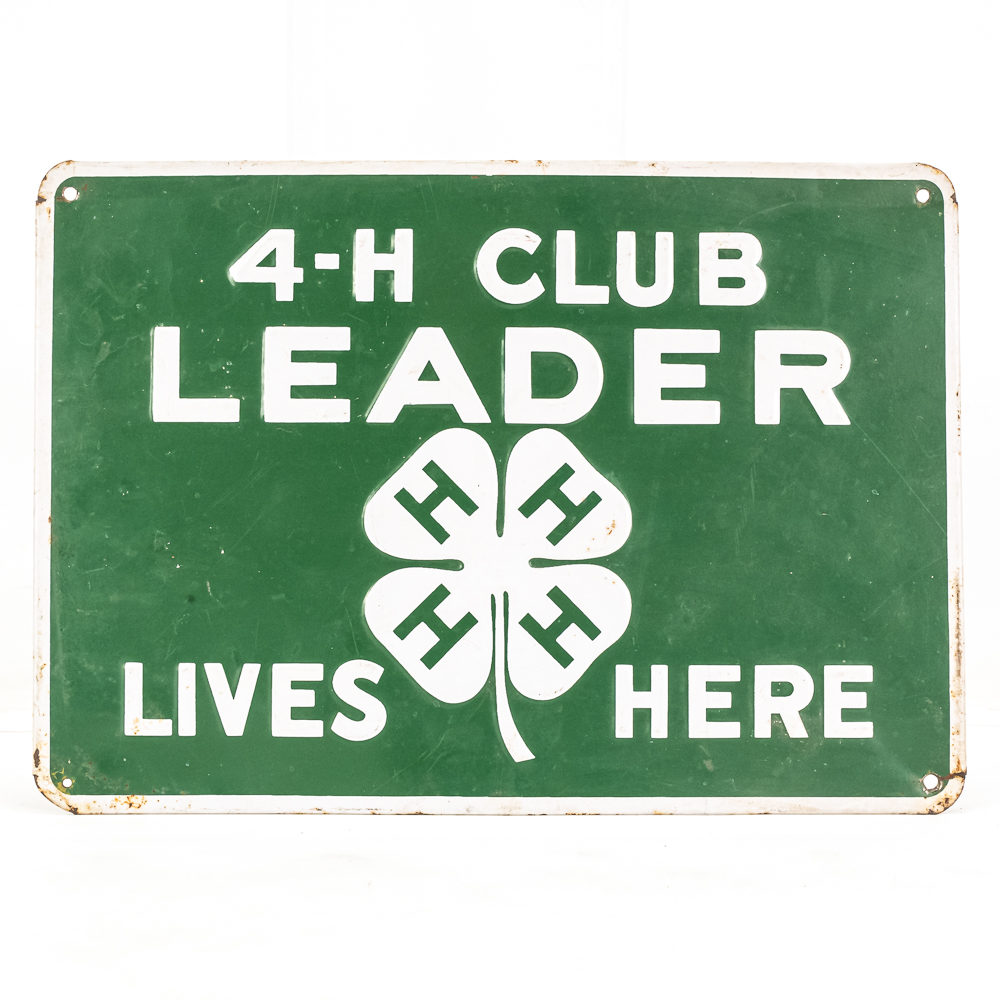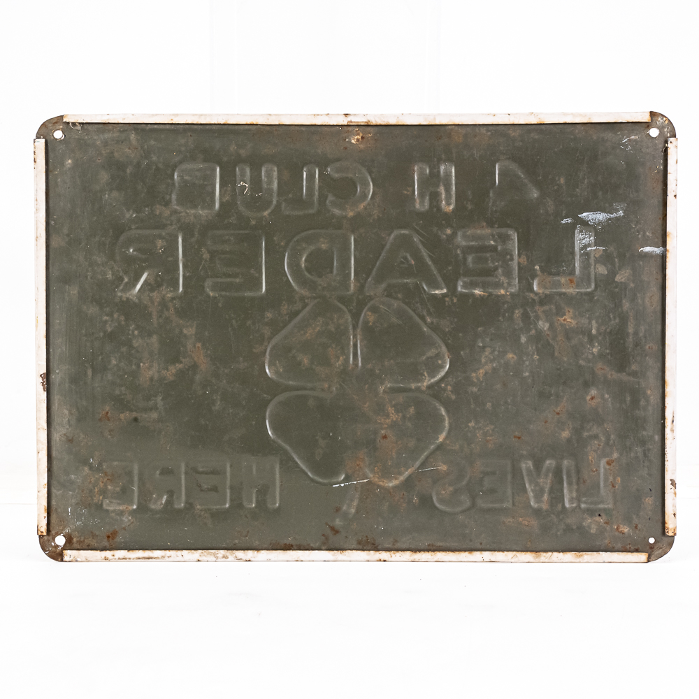 Vintage 4-H Club Leader Lives Here single sided embossed tin advertising sign. Good overall condition with some age & wear including minor discoloration, scuffs & oxidation. Approximately 9.5″t x 13.5″l, please use photos to judge condition and bid accordingly.