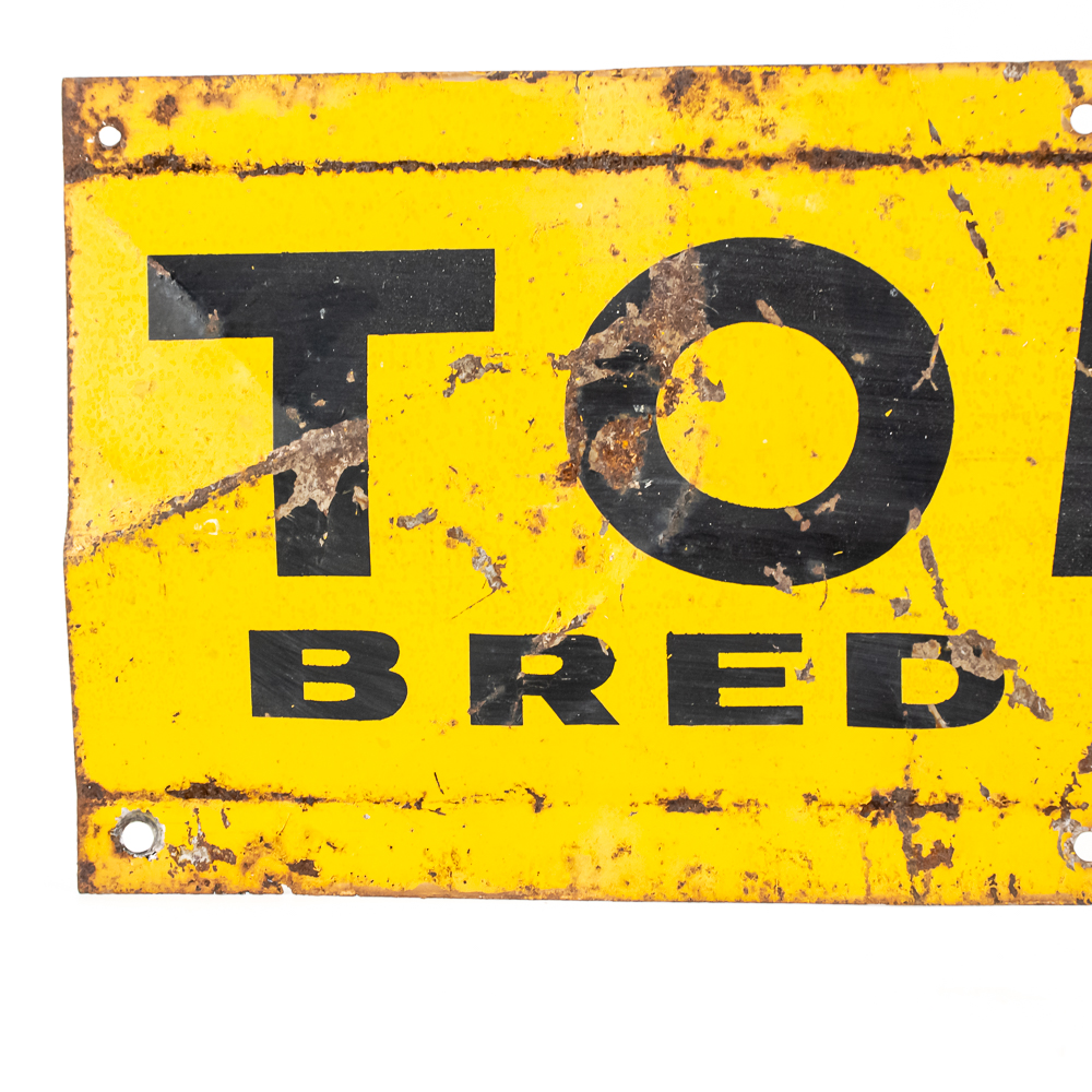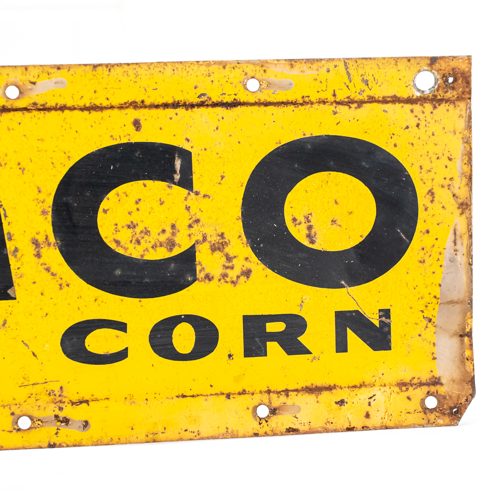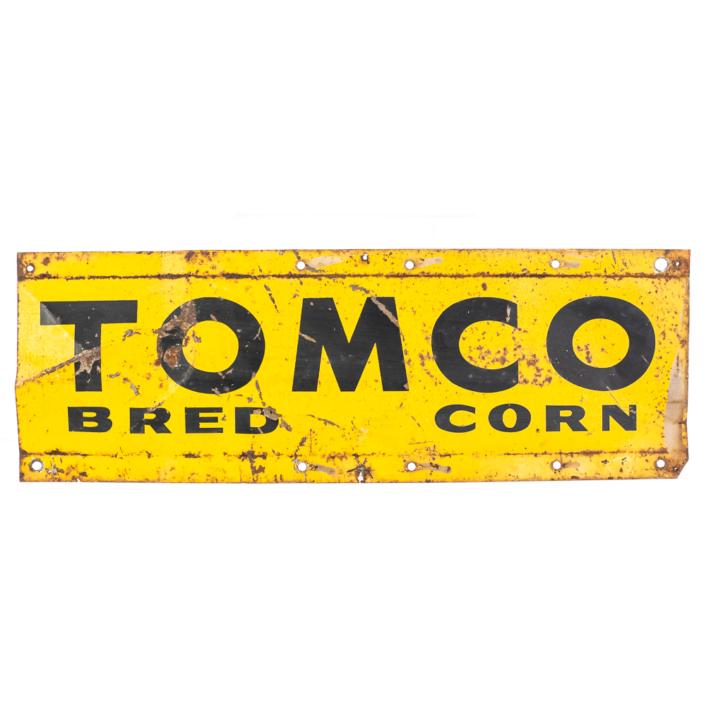 Tomco Bred Corn single sided tin advertising sign. Good overall condition with age and wear including extra holes, bends, stray paint marks, soft corners & oxidation. Approximately 5.5″t x 16″l, please use photos to judge condition and bid accordingly.