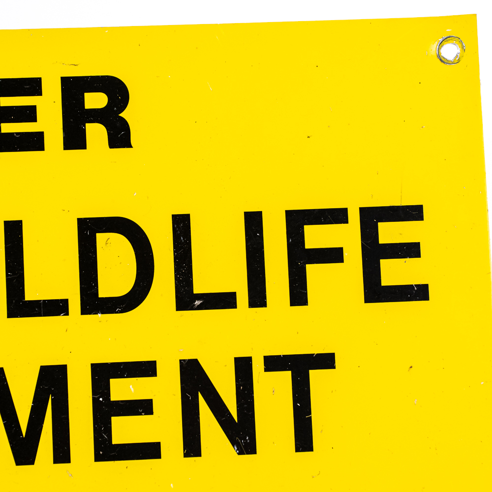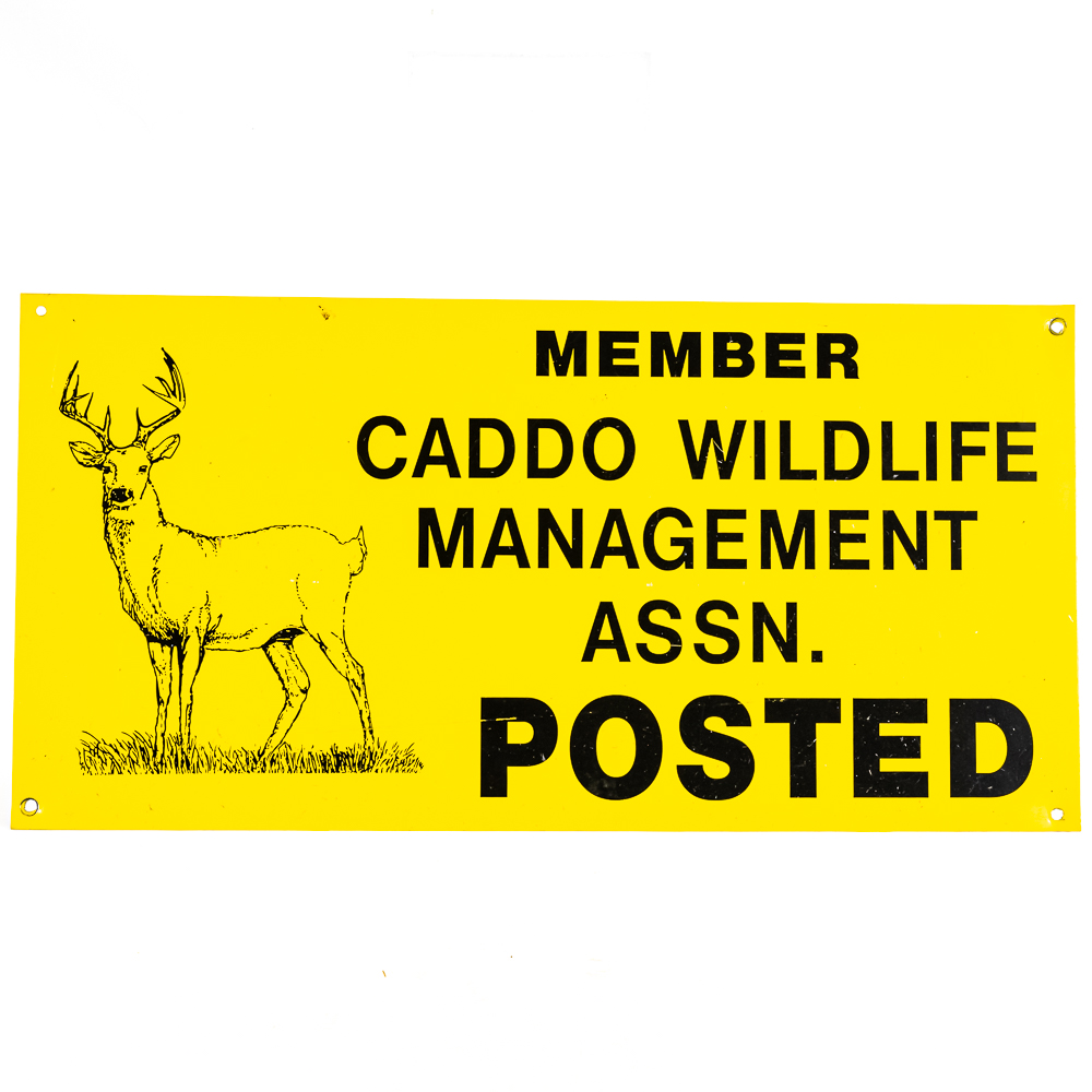 Vintage “Caddo Wildlife Management Association Member Posted” single sided tin advertising sign. Very good overall condition with eye catching bold color with minor unevenness near the attachment points; approximately 12″t x 24″l. Please use photos to judge condition and bid accordingly.