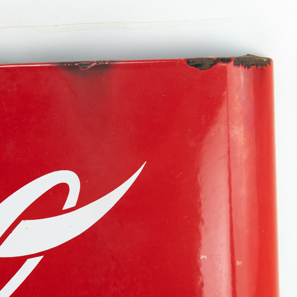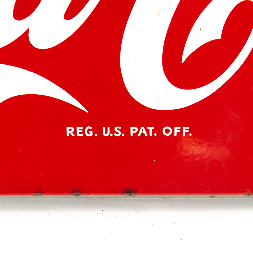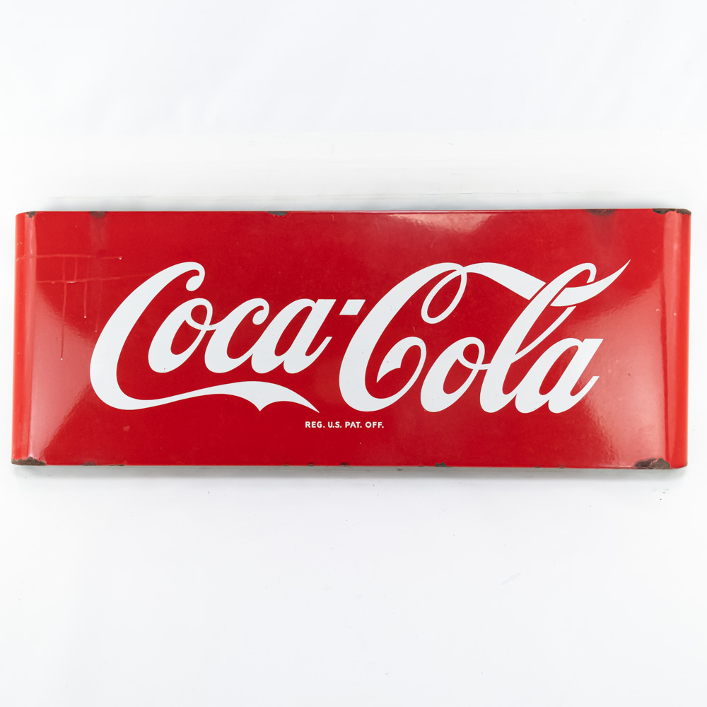 Vintage Coca-Cola metal machine insert advertising sign featuring the classic white script logo on a red ground, executed on a convex rolled-steel panel with mounting flanges on the short sides. The piece is marked “REG. U.S. PAT. OFF.” below the central script. The sign exhibits moderate wear including minor discoloration and chipped paint . Approximately 16″t x 2.5″d x44″l, perfect addition to your collection. Please use photos to judge condition and bid accordingly.