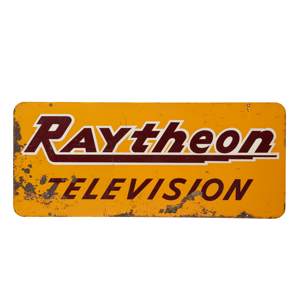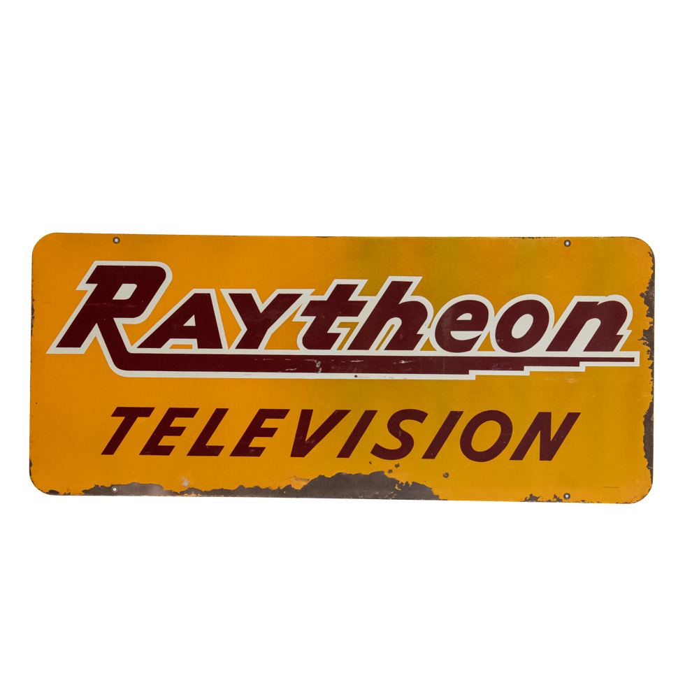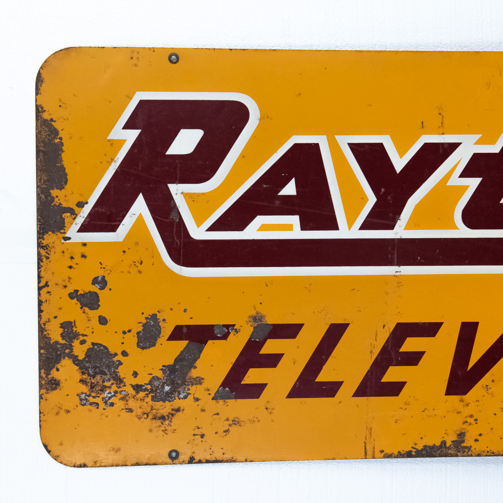 “Raytheon Television” double sided metal advertising sign. Good overall condition with some discoloration, chipped porcelain, scratches and oxidation. Stout Sign Co. St. Louis Mo. stamped near bottom corner. Approximately 21″t x 49.5″l. Please use photos to judge condition and bid accordingly.