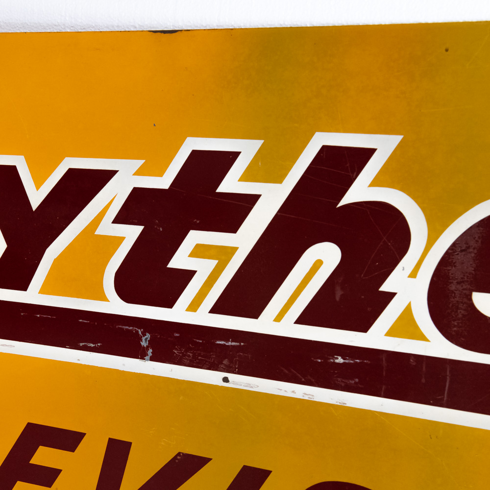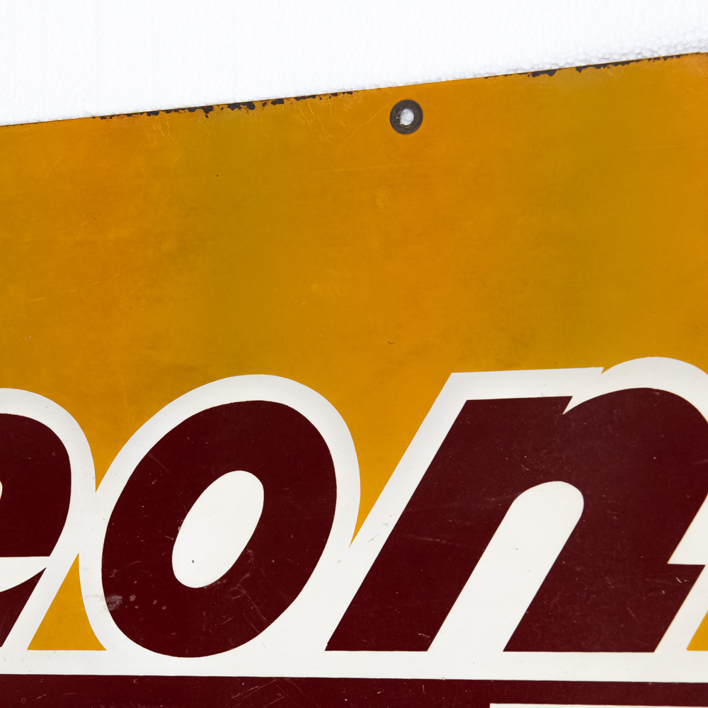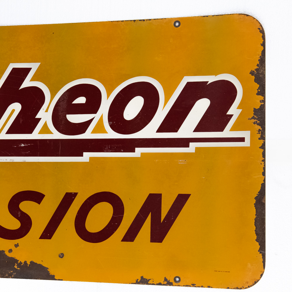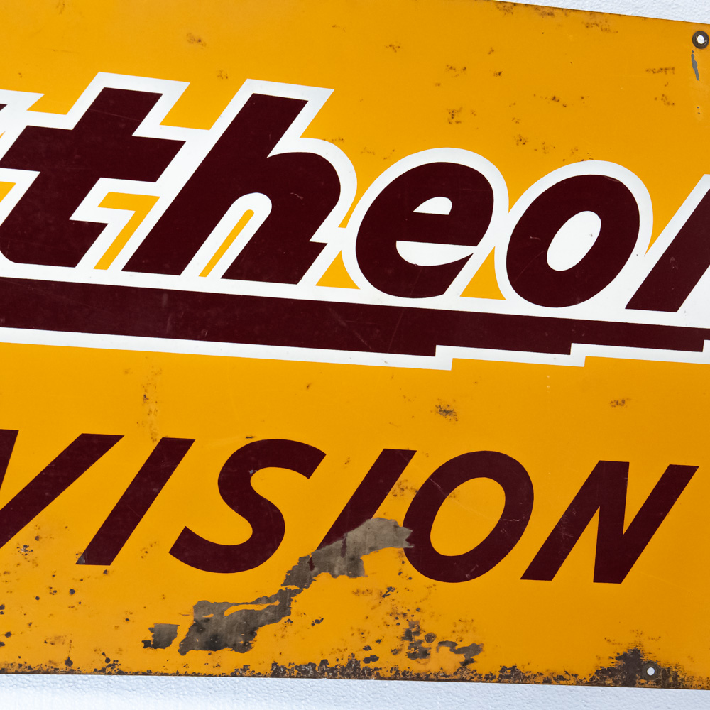 “Raytheon Television” double sided metal advertising sign. Good overall condition with some discoloration, chipped porcelain, scratches and oxidation. Stout Sign Co. St. Louis Mo. stamped near bottom corner. Approximately 21″t x 49.5″l. Please use photos to judge condition and bid accordingly.